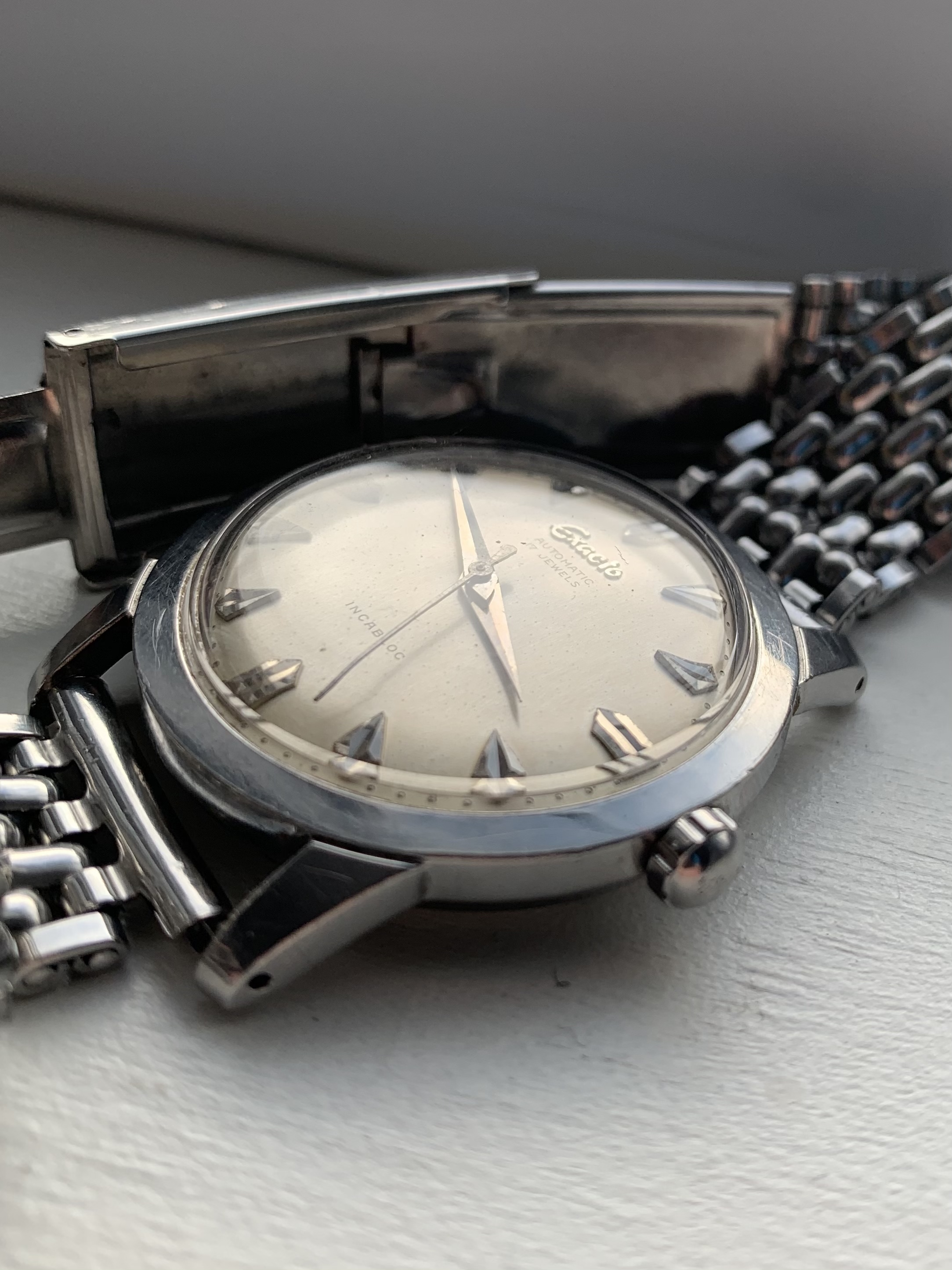 -Case is all stainless steel 36mm with 19mm lugs in great shape. With exacto signed crown.