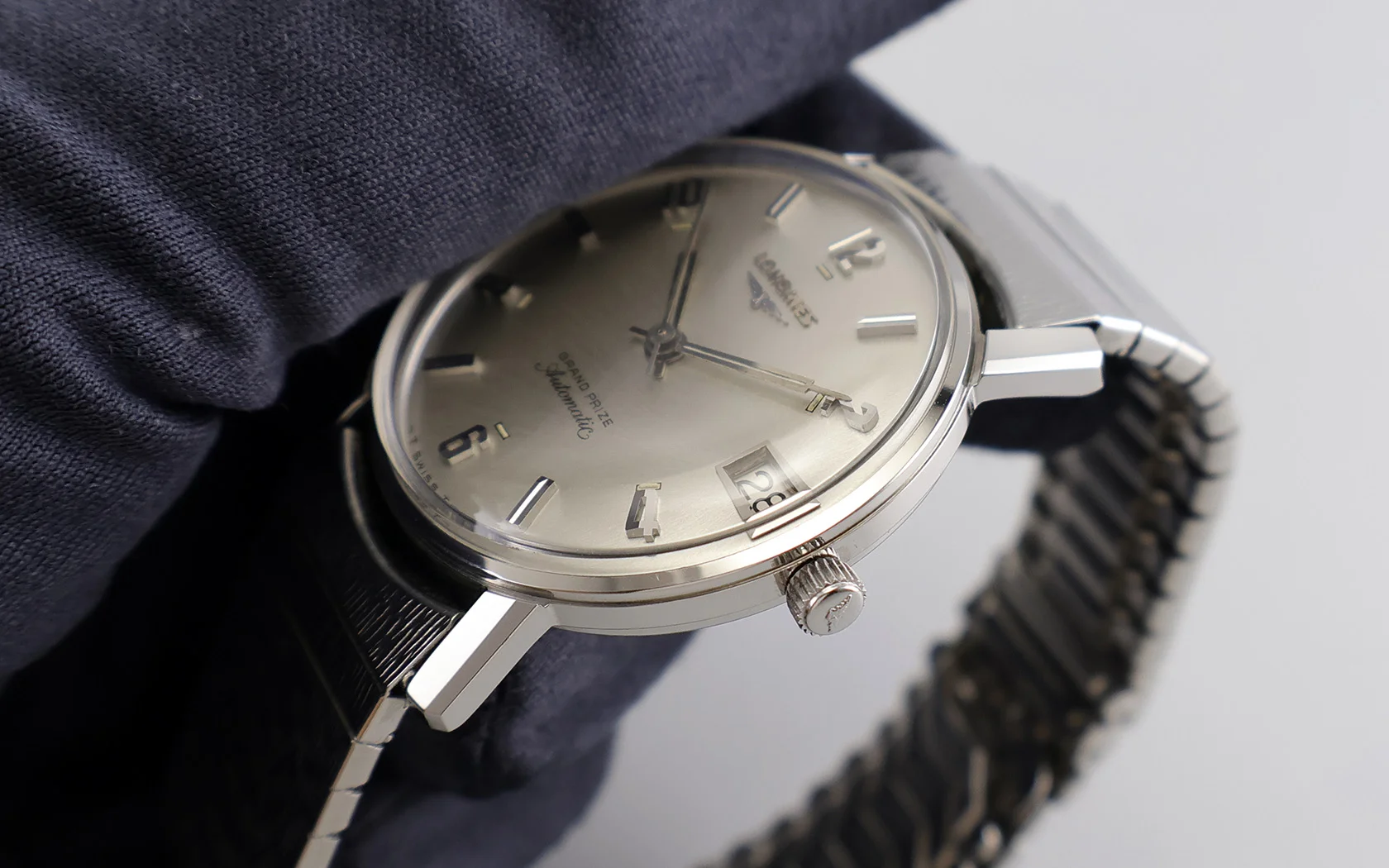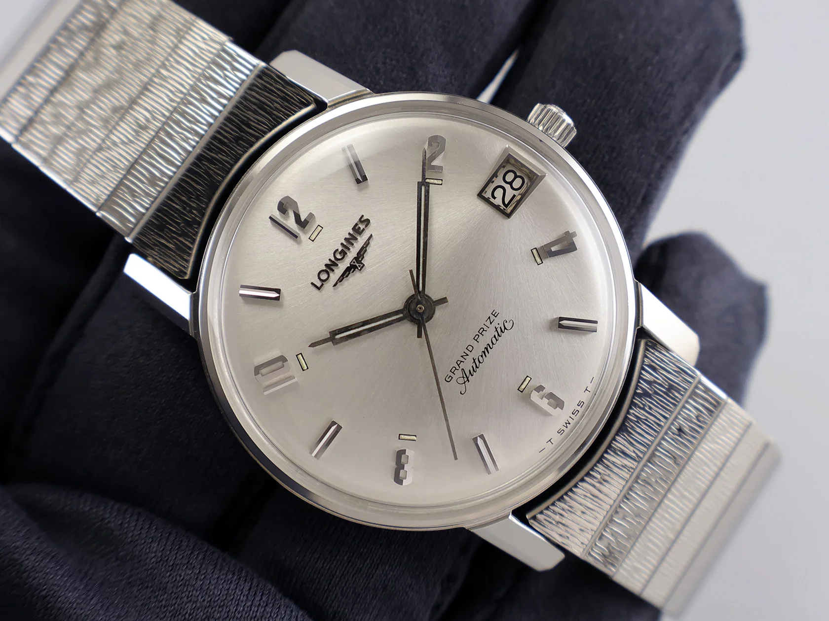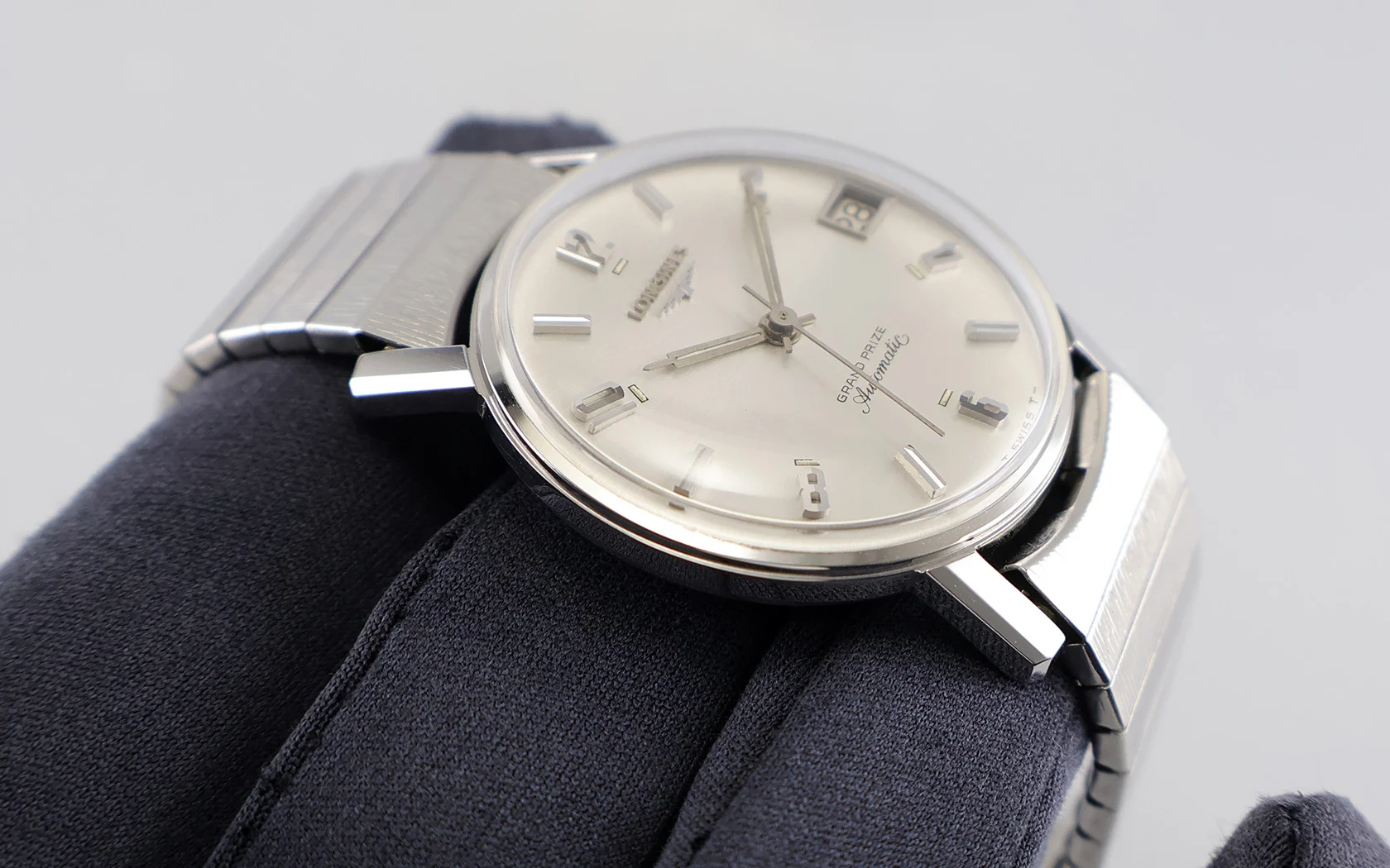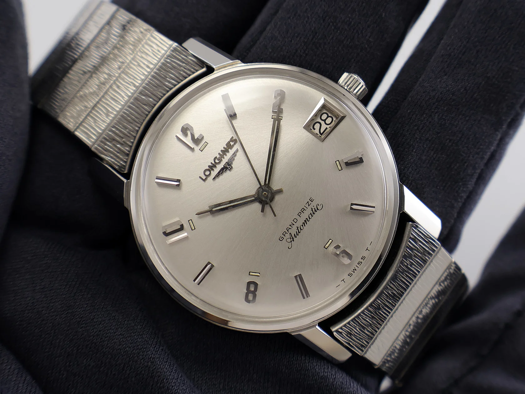 ·Up for sale is an excellent (almost NOS) Longines Grand Prize Automatic ref. 2579-343. It has a beautiful sunburst pattern with brushings emanating from the date @ 3h. The unpolished SS case is in outstanding shape, plus the original crown. It measures 33.7mm wide w/o crown and 40mm lug to lug; the lug width is 17.5mm. Inside is the Longines cal. 345. Its service history is unknown, but it is still running strong and keeping good time. The JB Champion stretch bracelet originally came with the watch as many vintage Longines for the American market come with stretch bracelets.