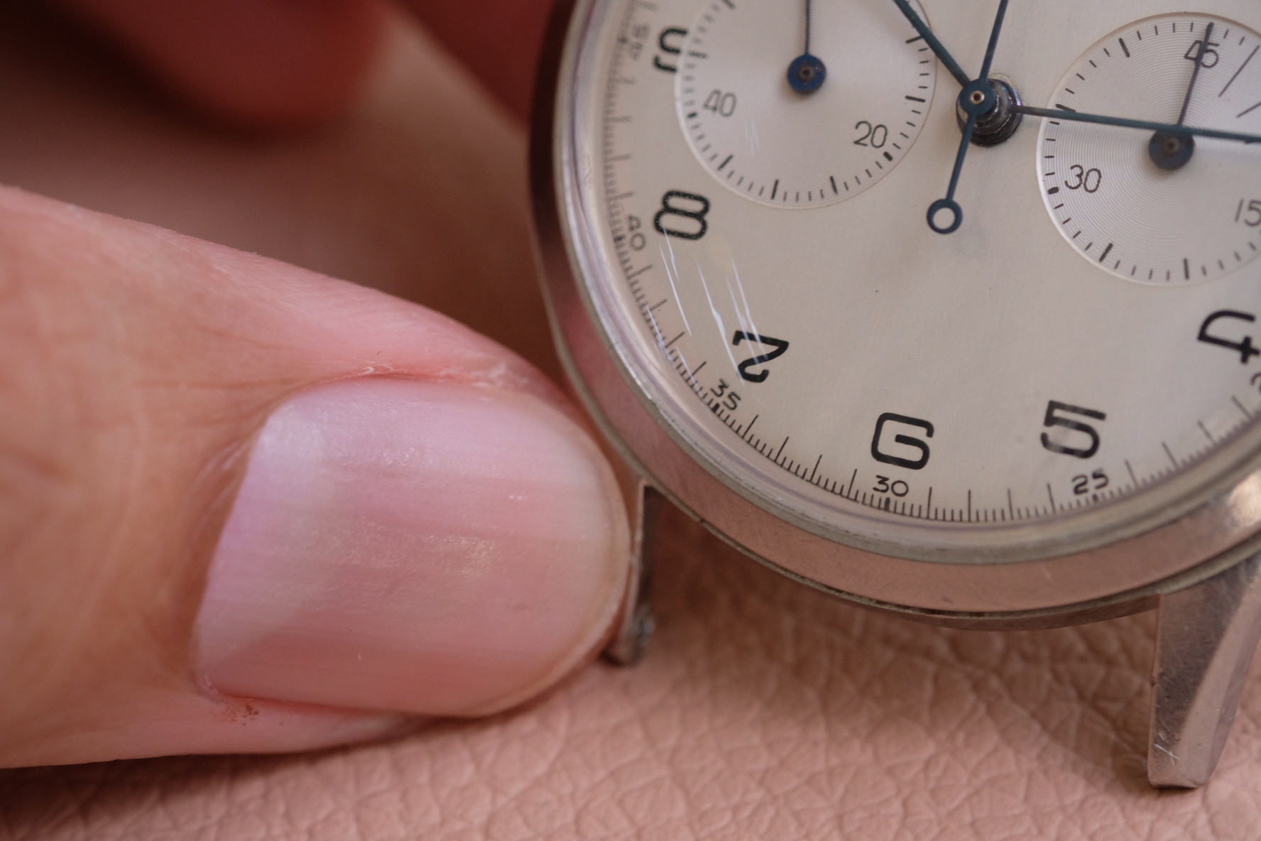 Crystal: scratches on the crystal at 5 and 7 o clock and a ding at 12 o clock as seen in pictures, more visible at certain angles with more contrast. These were present upon purchase (I've attached other pictures from Shuck The Oyster after my own inferior pictures heh)