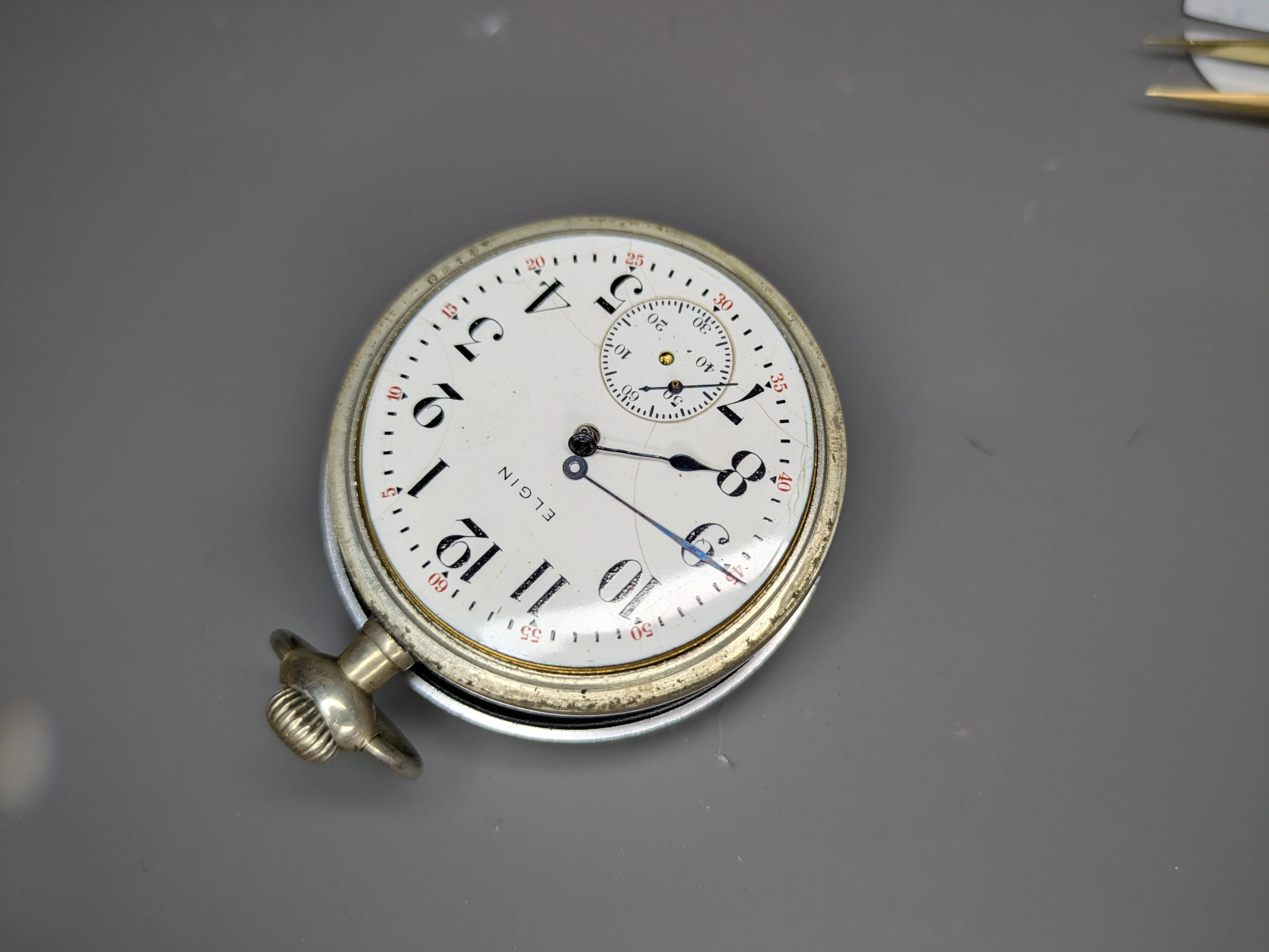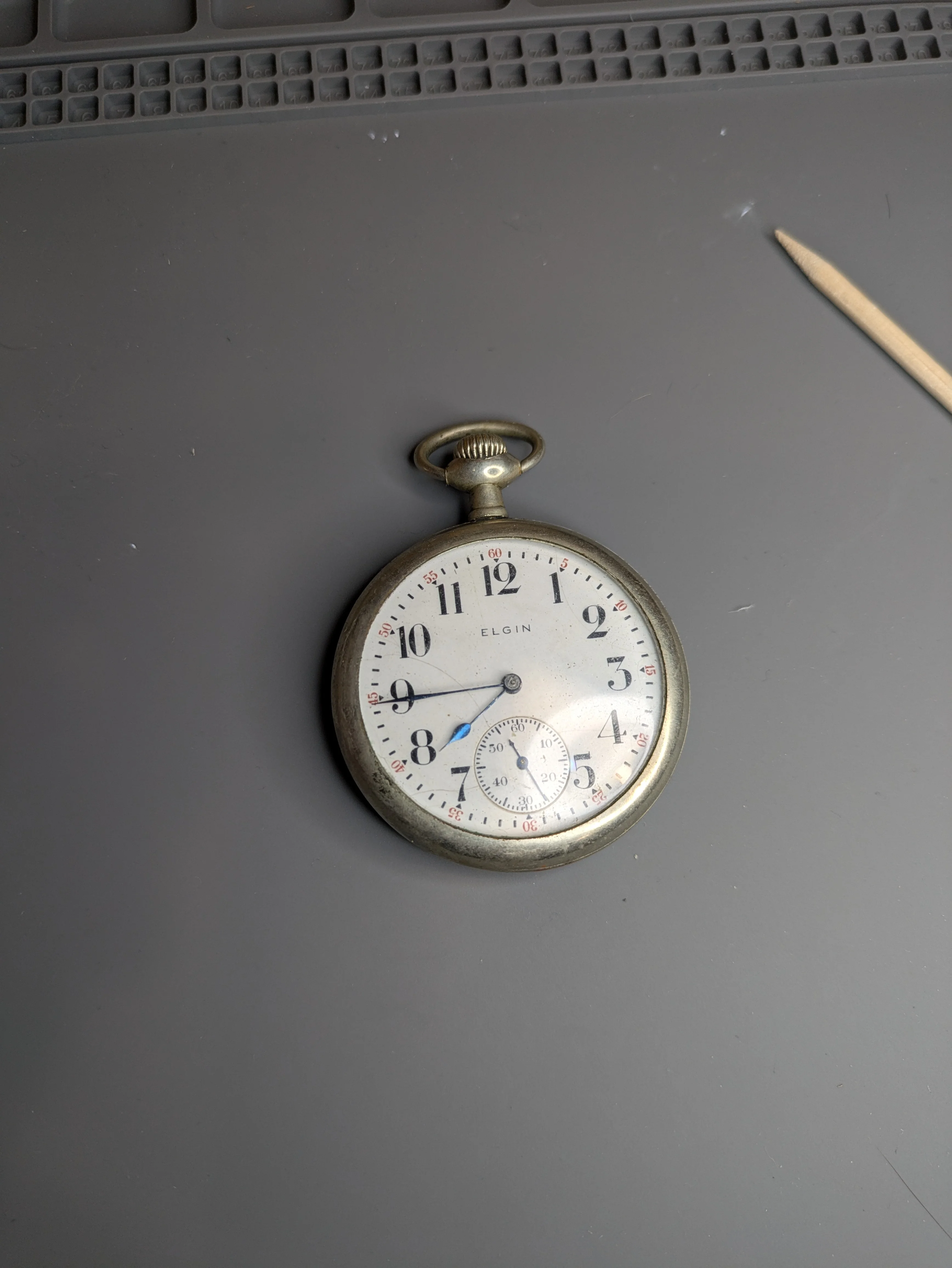 SO, here is the watch itself. A quick function check shows that the crown 'turns' and 'clicks' in 1 direction, and makes no noise in the other direction. I cannot 'pull' it in any way, so there isn't an obvious way how to set it at the point of initial function check. AS far as I can tell it is a silverode cased Elgin 293 movement. I'm only into it < $75 (including the main spring), so hoping I can make it 'nice' enough to be a desk-toy or a gift for a friend. The back is blank, but the hands are nicely blued.