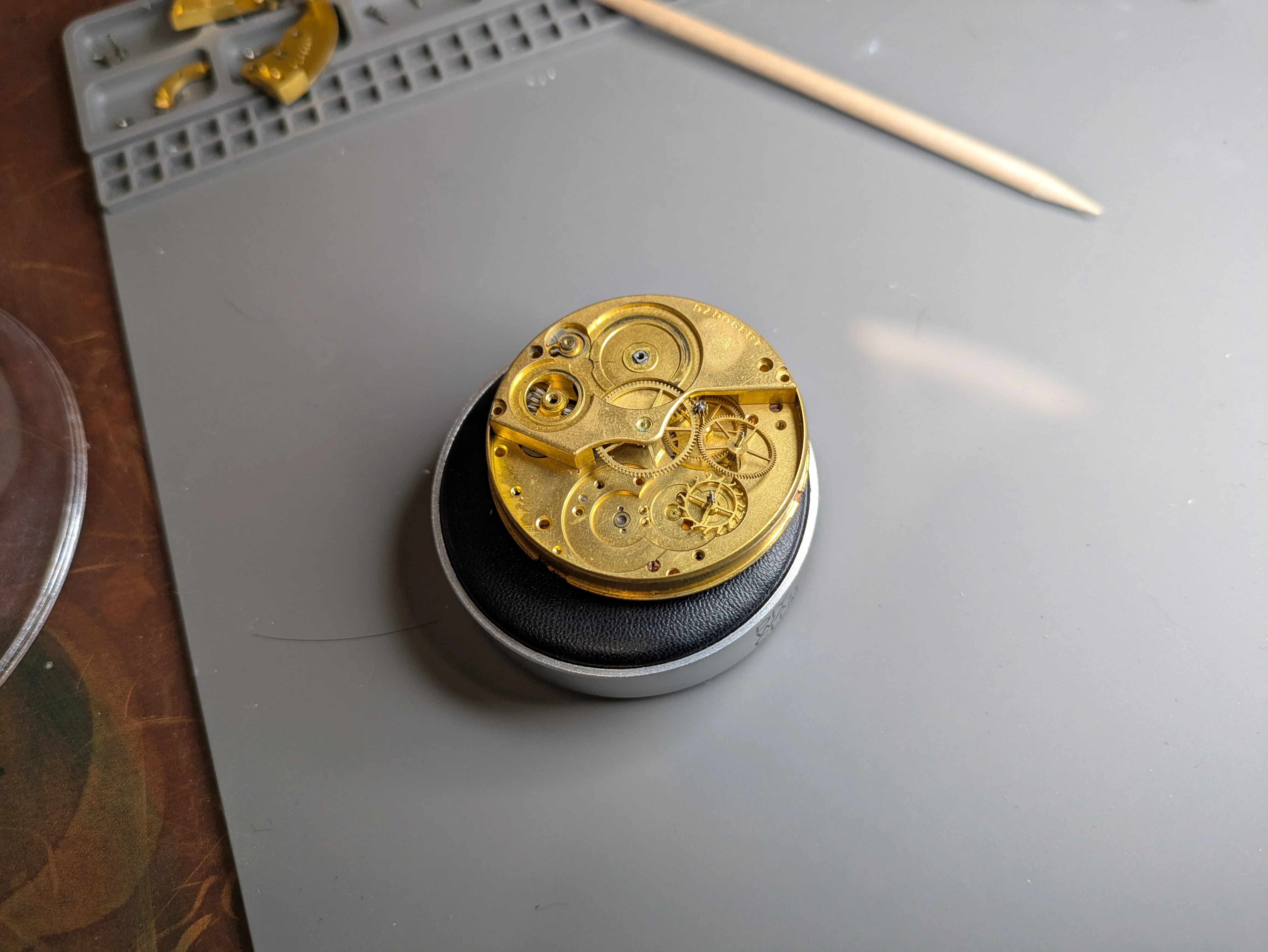 The click came off uneventfully as well, though two things: The spring is an interesting design (though the screw is too small for the screwdrivers I have, so it'll have to come out later). I also noticed that the crown wheel is interesting! it has a really neat looking two-part construction that interacts with the keyless works in a way that seems pretty unique. Note it is two pieces, but the Rodico picked up both together. SEPARATING these was a little bit of work to confirm they were actually two parts (there was a seam but they didn't actually move when lightly prodded), but it fell apart once the gunk was broken free.