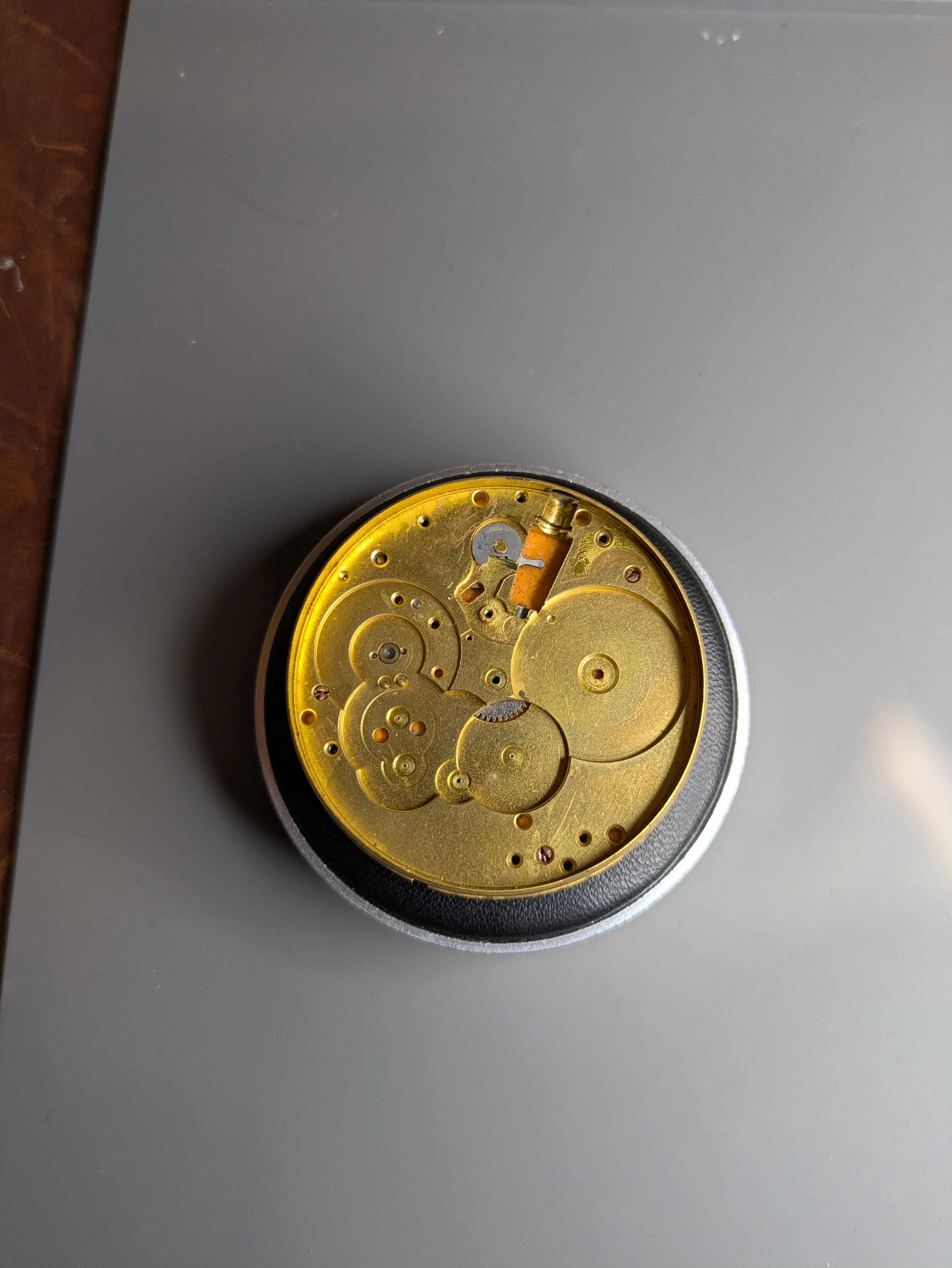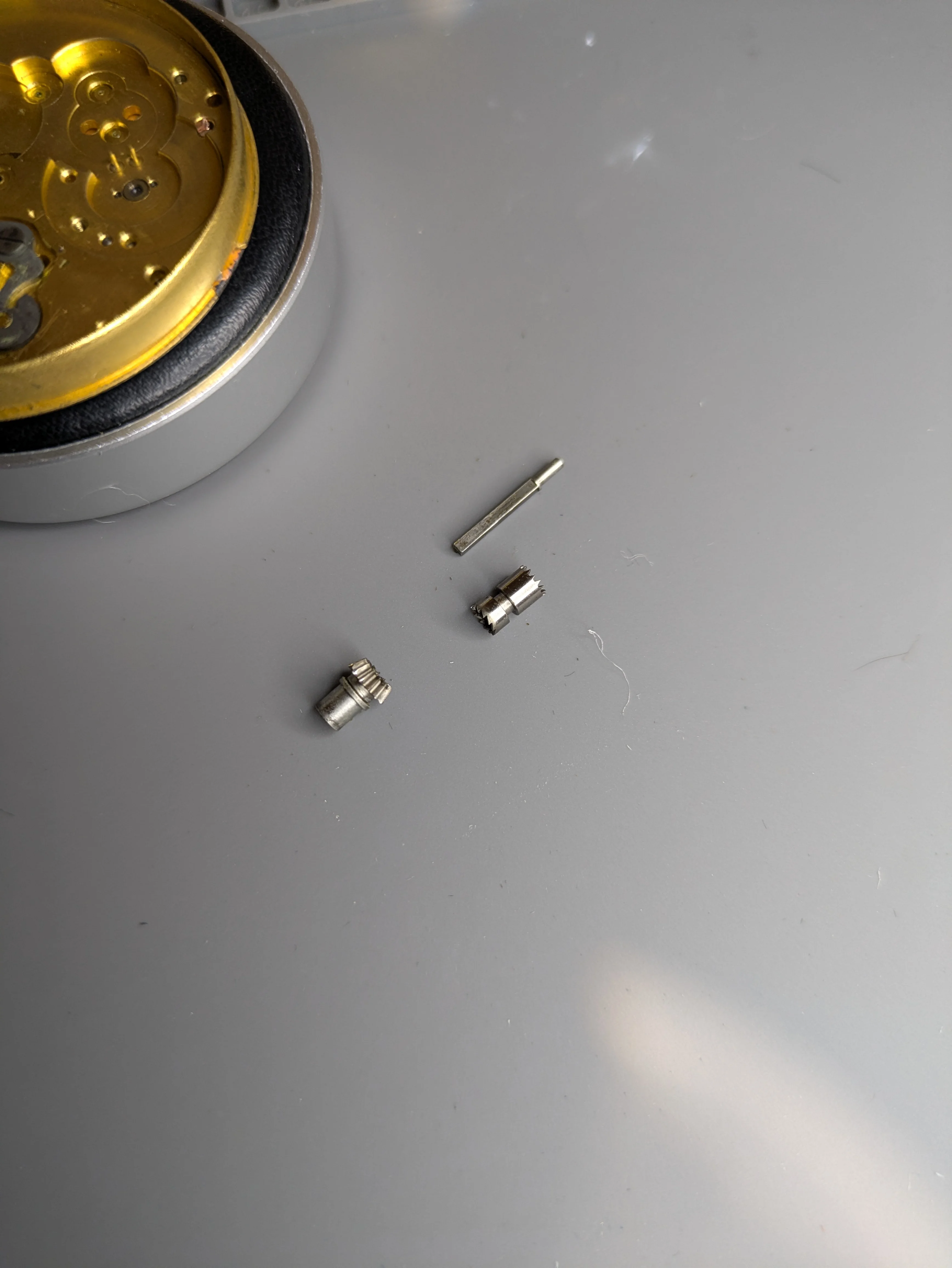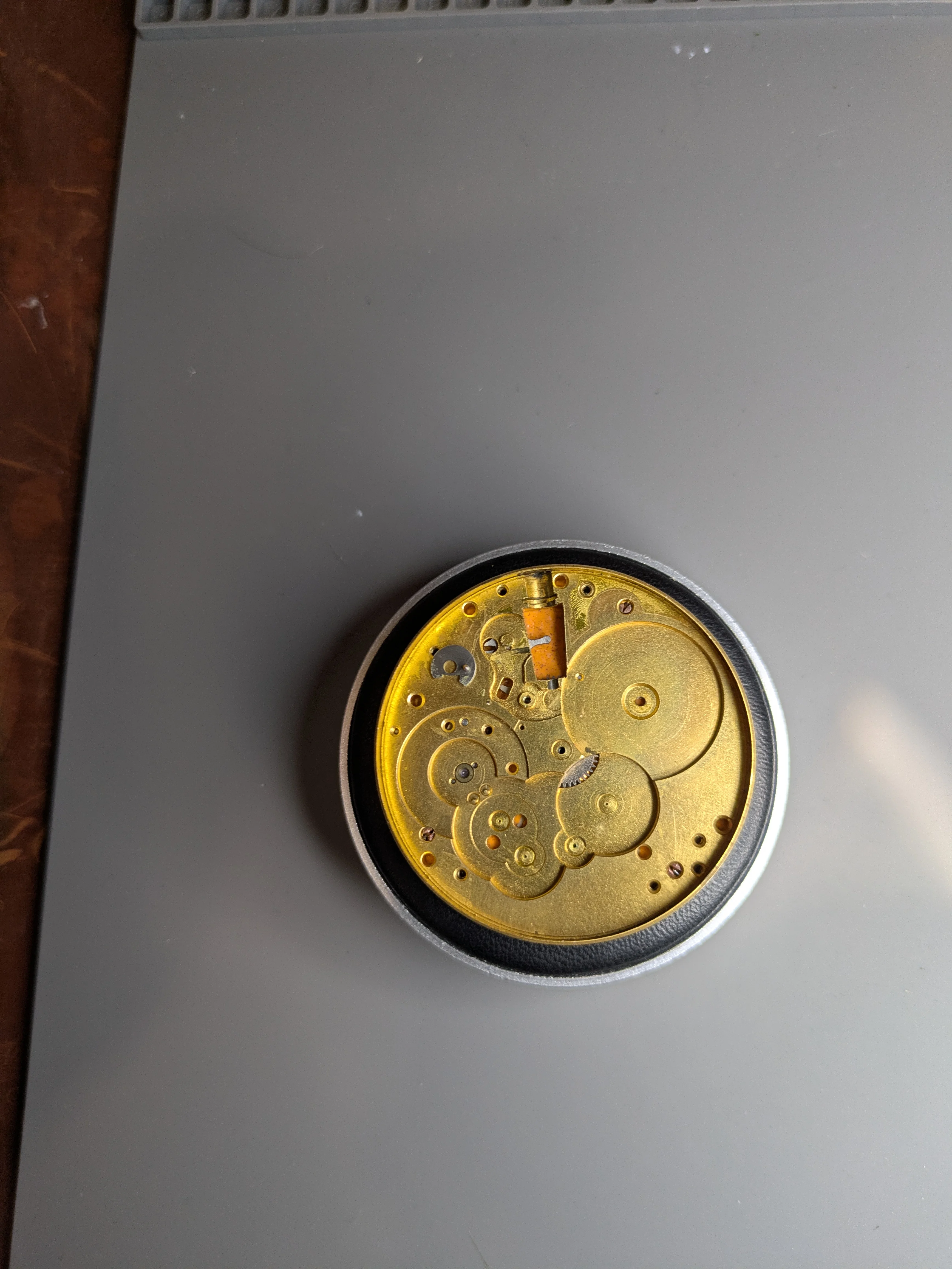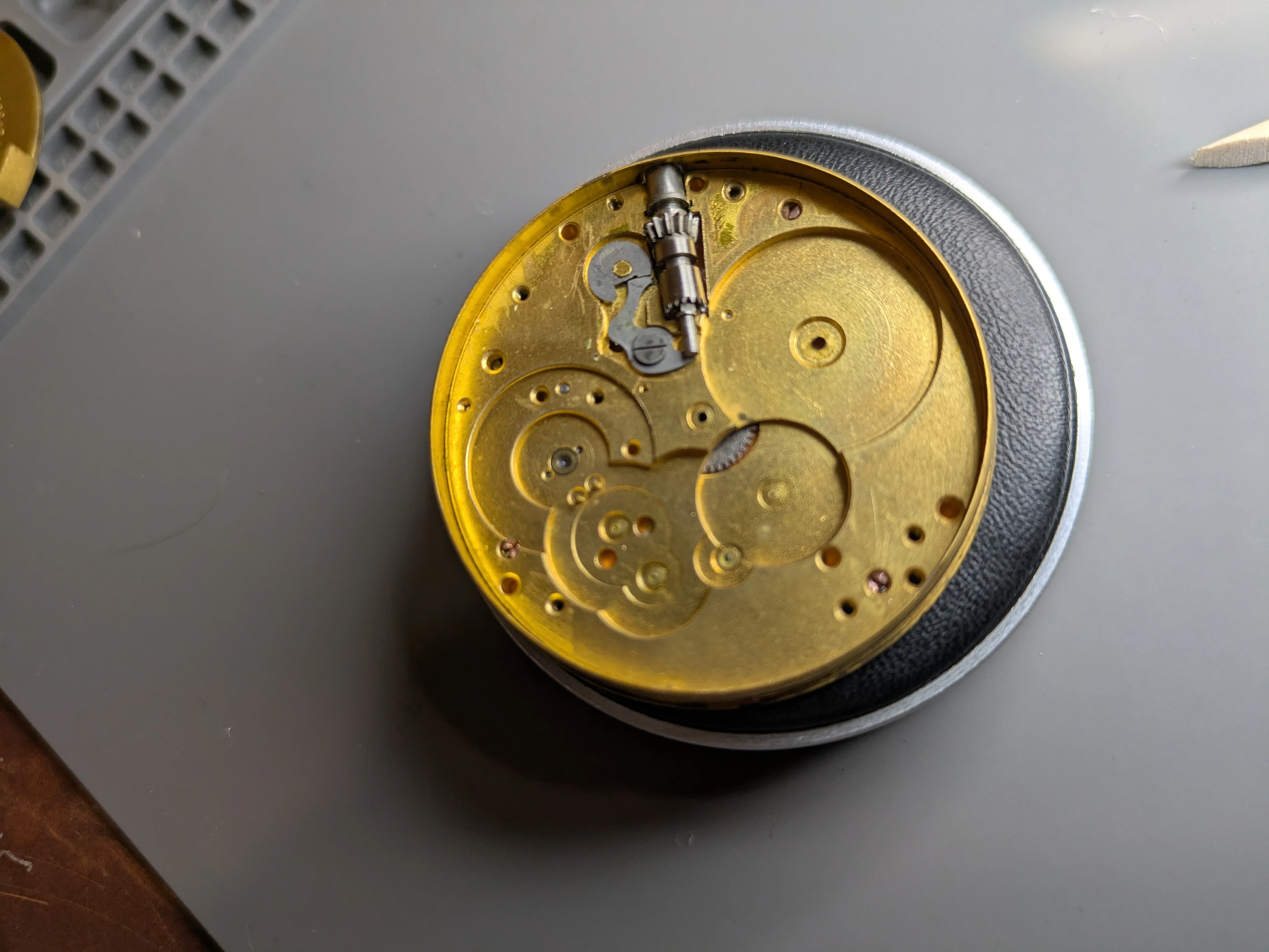Once I did this, it actually pivoted pretty nicely out of the case by pushing at about 6, and it rolled off the crown. I was a little concerned here at the time, as it seems a little short, but with no obvious way to remove the crown I presume this is the way it is supposed to work. The crown, separated from the movement, actually has a 2nd position that it clicks into. I find myself suspecting that it was 'gunked' into the movement (to be a theme!) and I just needed to hit it with my purse