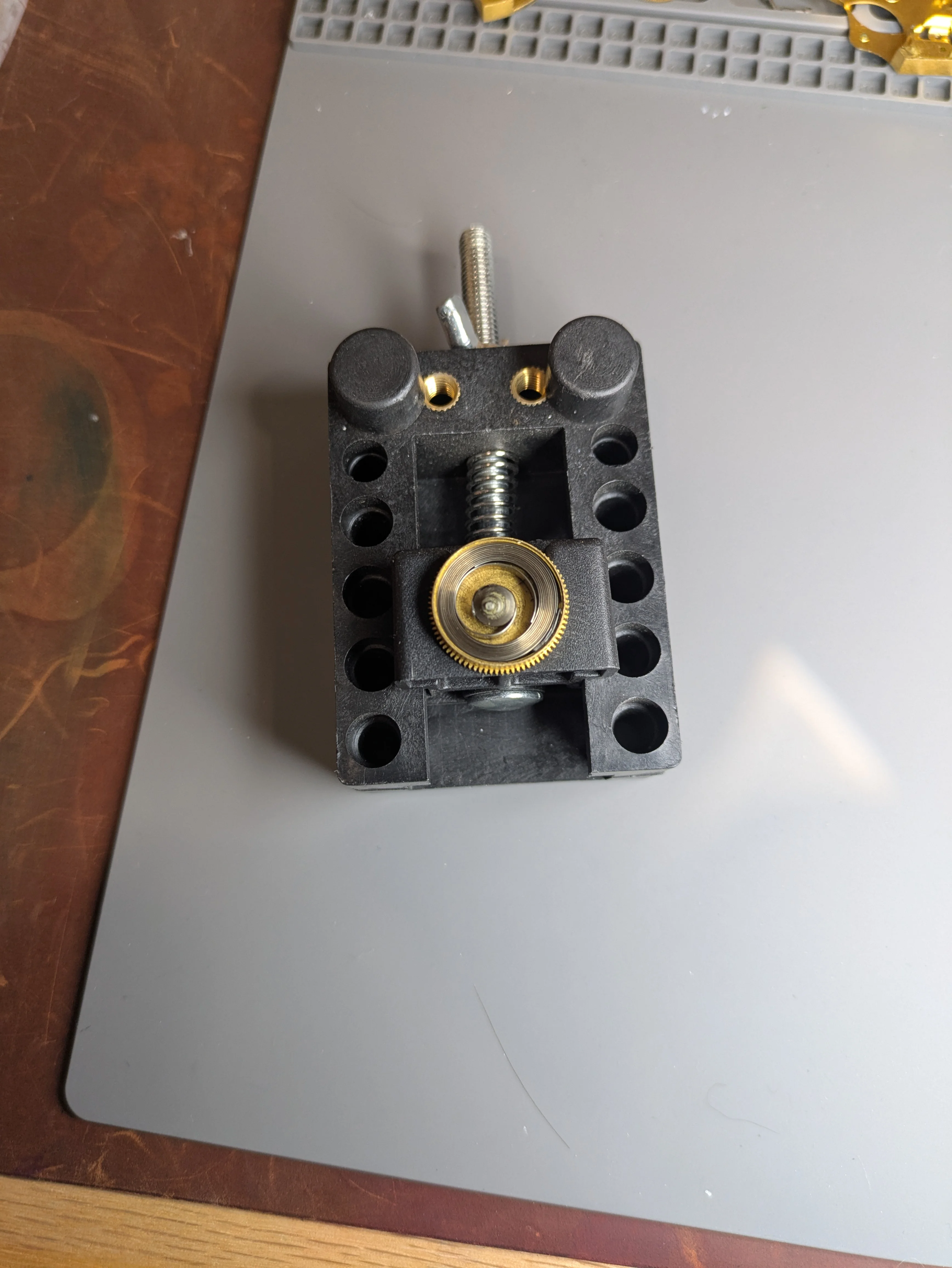 At this point, i was a little confused. There isn't any real obvious way to remove the dial. It seems to be bonded to some sort of metal plate, and there is no obvious mechanism on the side to remove it. There is one little 'switch' that doesn't actually seem to do anything. Additionally, there are these little copper-looking screws (that don't turn?) that protrude into the plate. You can see one under the balance wheel here, which I've removed: