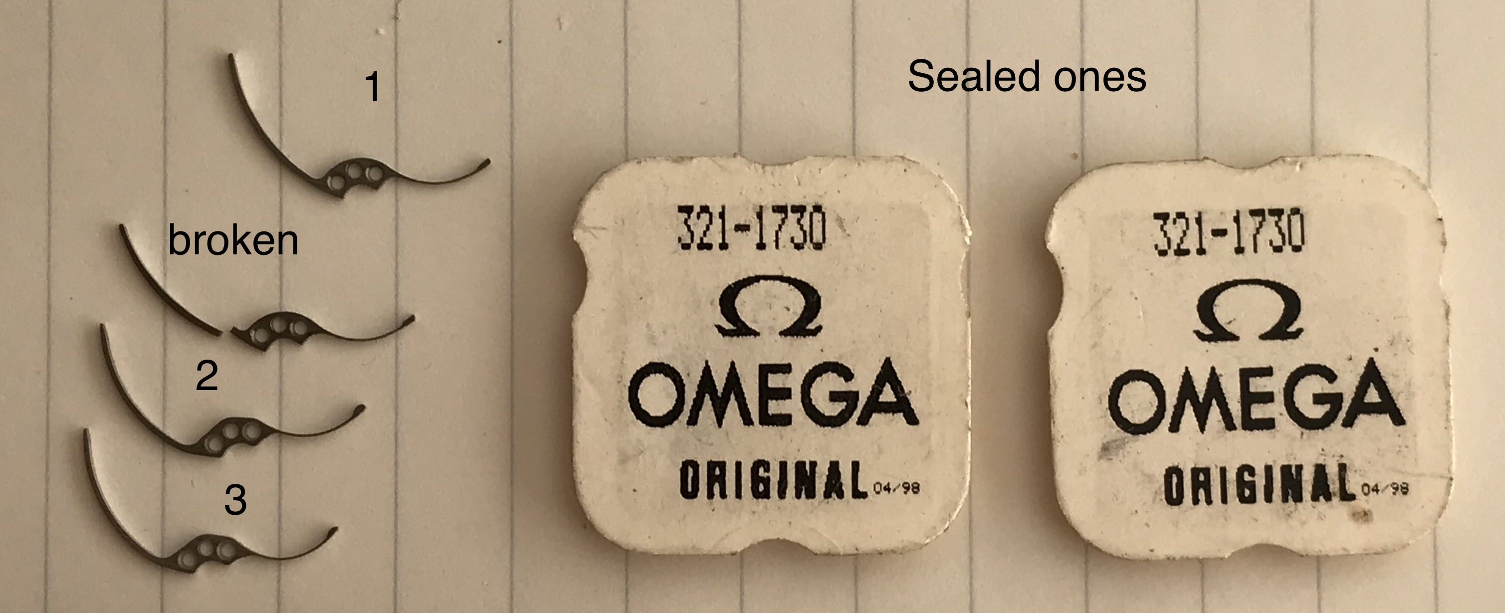 So, I ordered part 321-1730 (not to be confused with the two hole version for 320 movements) from four different sellers on eBay. One in the USA, one in Canada, one in the U.K., and one from South America. One seller had them in sealed Omega packets.