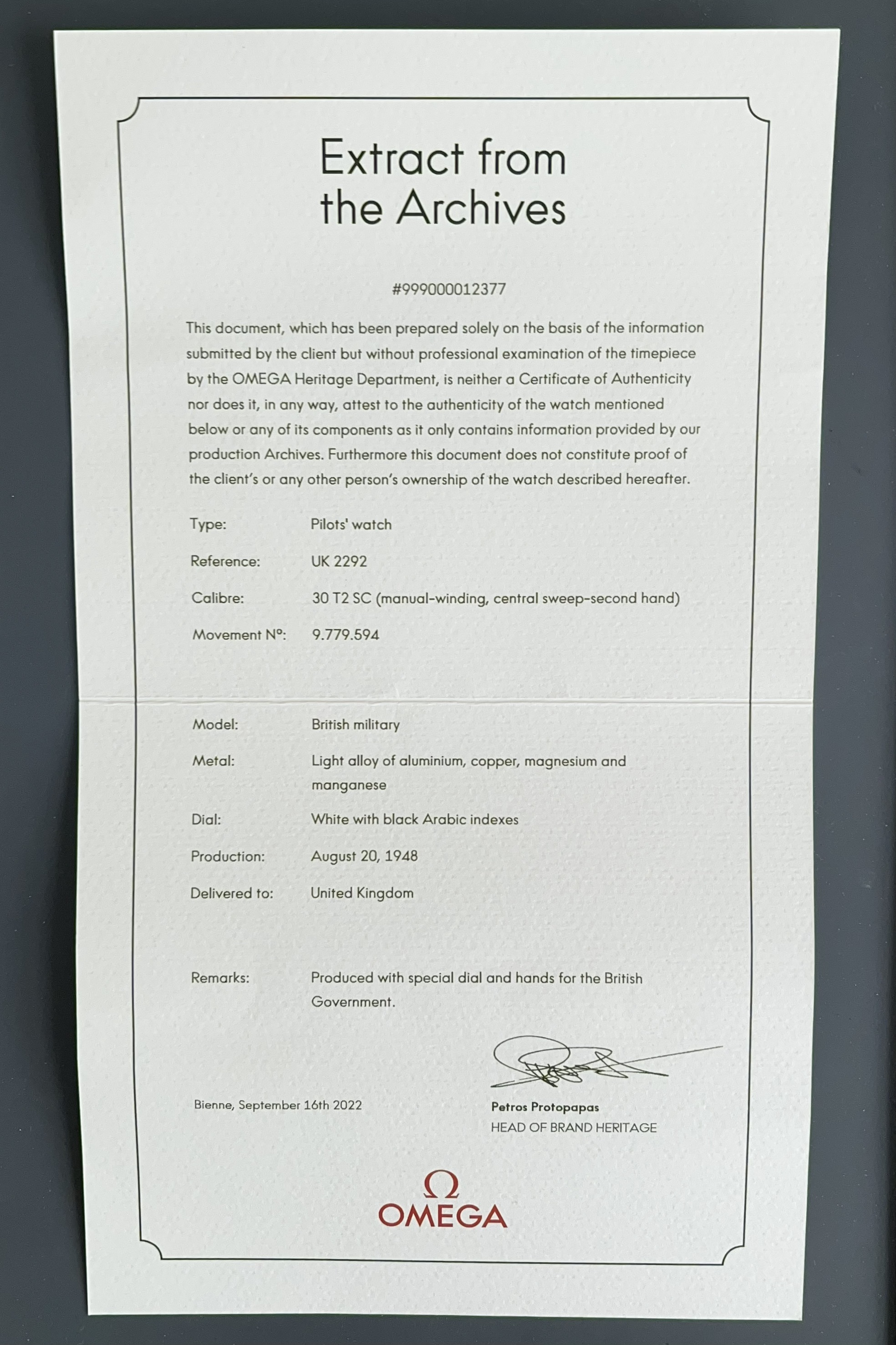 We are sorry to read that your archive extract mentioned an error, we have informed our brand heritage department and they have re-issued the document with the corrected production date of 20 August 1943.