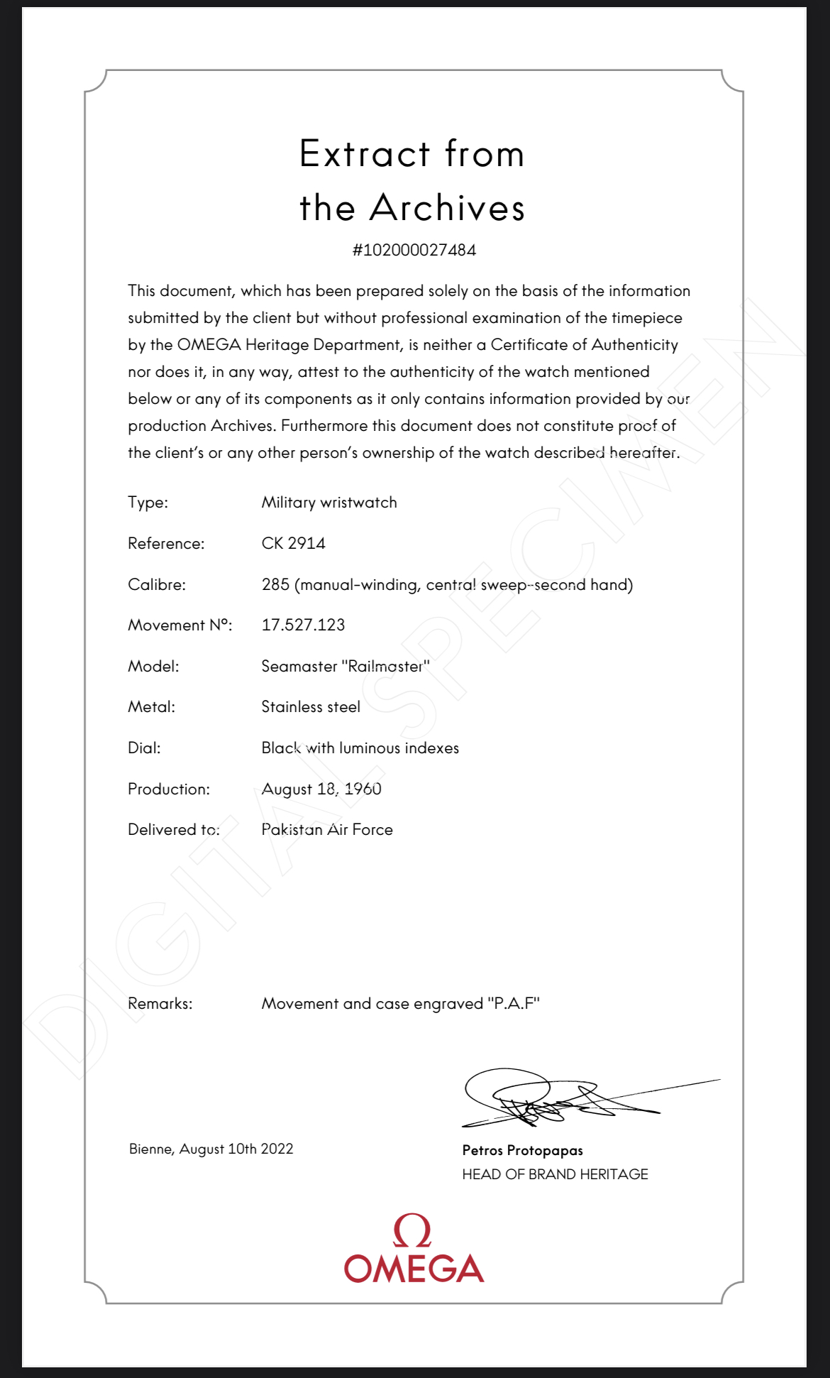 I don't expect much from the Omega Boutique at which I ordered the extract (Atlanta). The salesman that I worked with did not even know what an Extract from the Archives was until I explained it to him. And then they insisted on keeping the watch to send it to King of Prussia. Fortunately, a couple of days later they called back to say they didn't need the watch after all and I could pick it up.