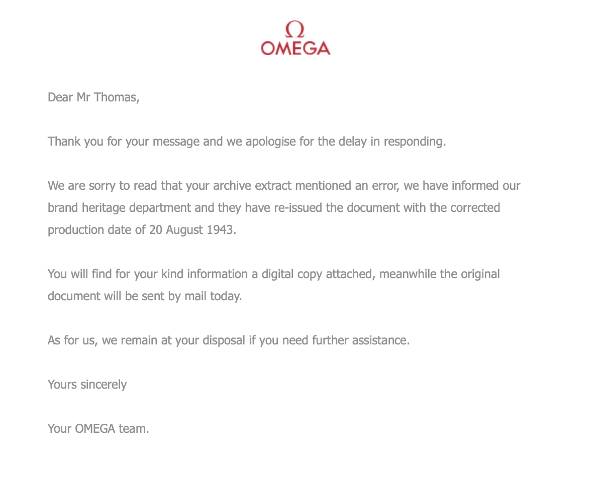We are sorry to read that your archive extract mentioned an error, we have informed our brand heritage department and they have re-issued the document with the corrected production date of 20 August 1943.