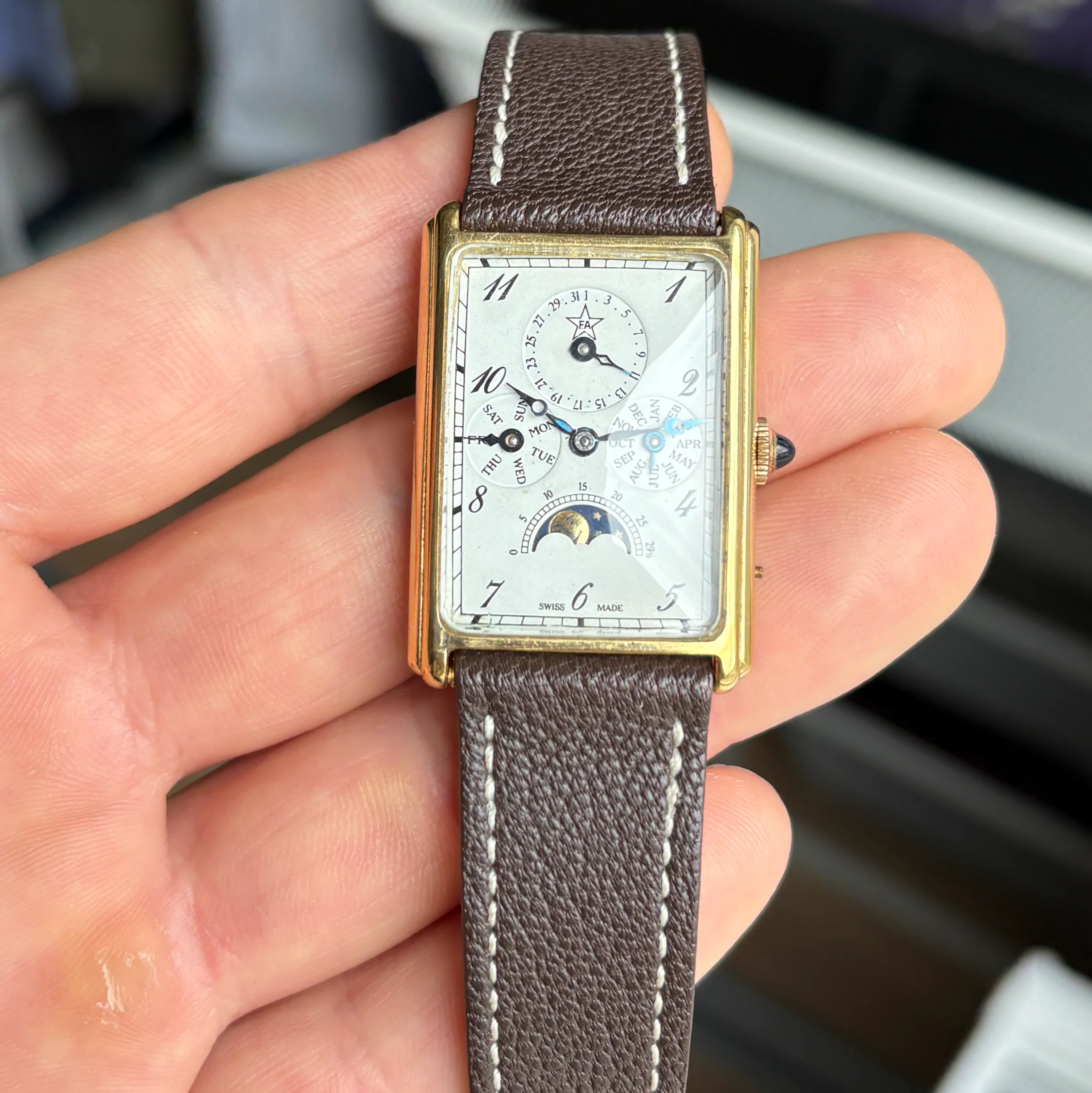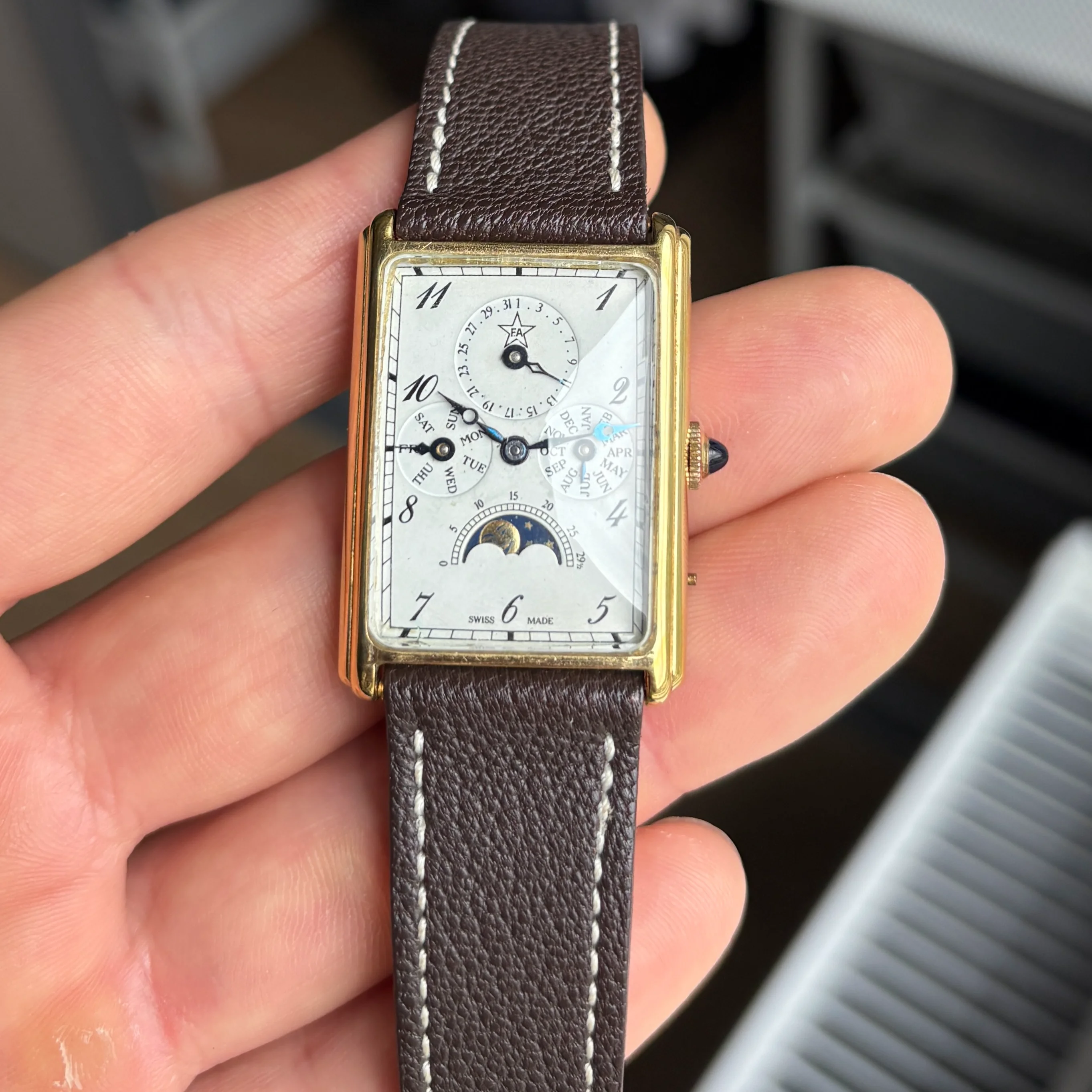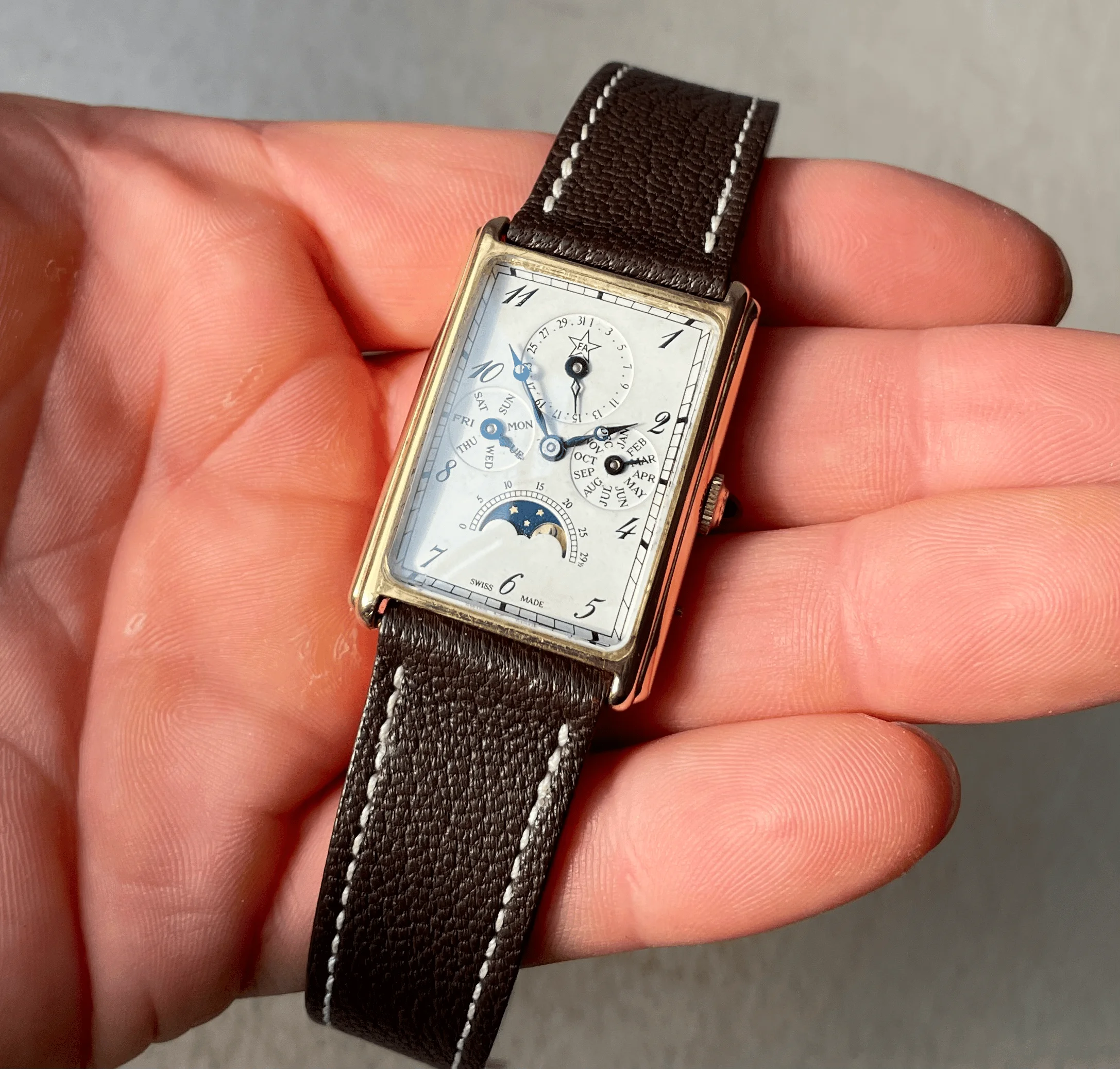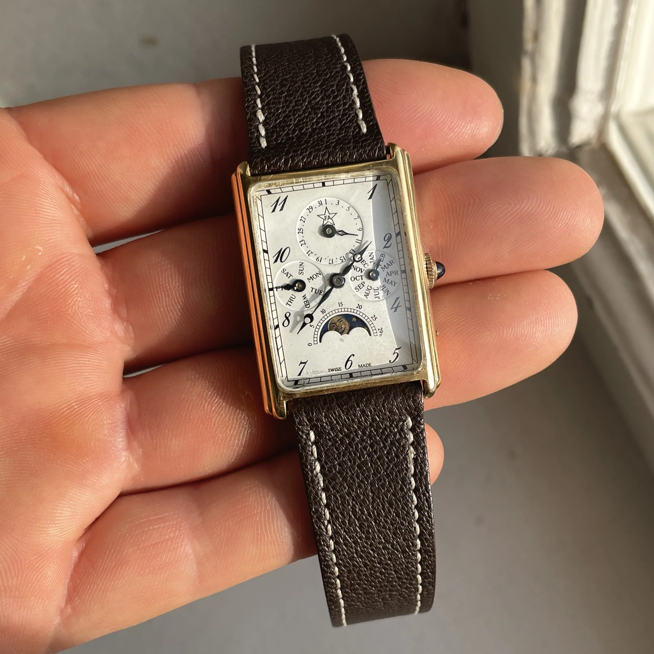 ·For sale is a very cool manual triple date moonphase from the 80s in a square case, these are very uncommon and this one is branded F.A but there was also some branded Sinn or Chronoswiss.