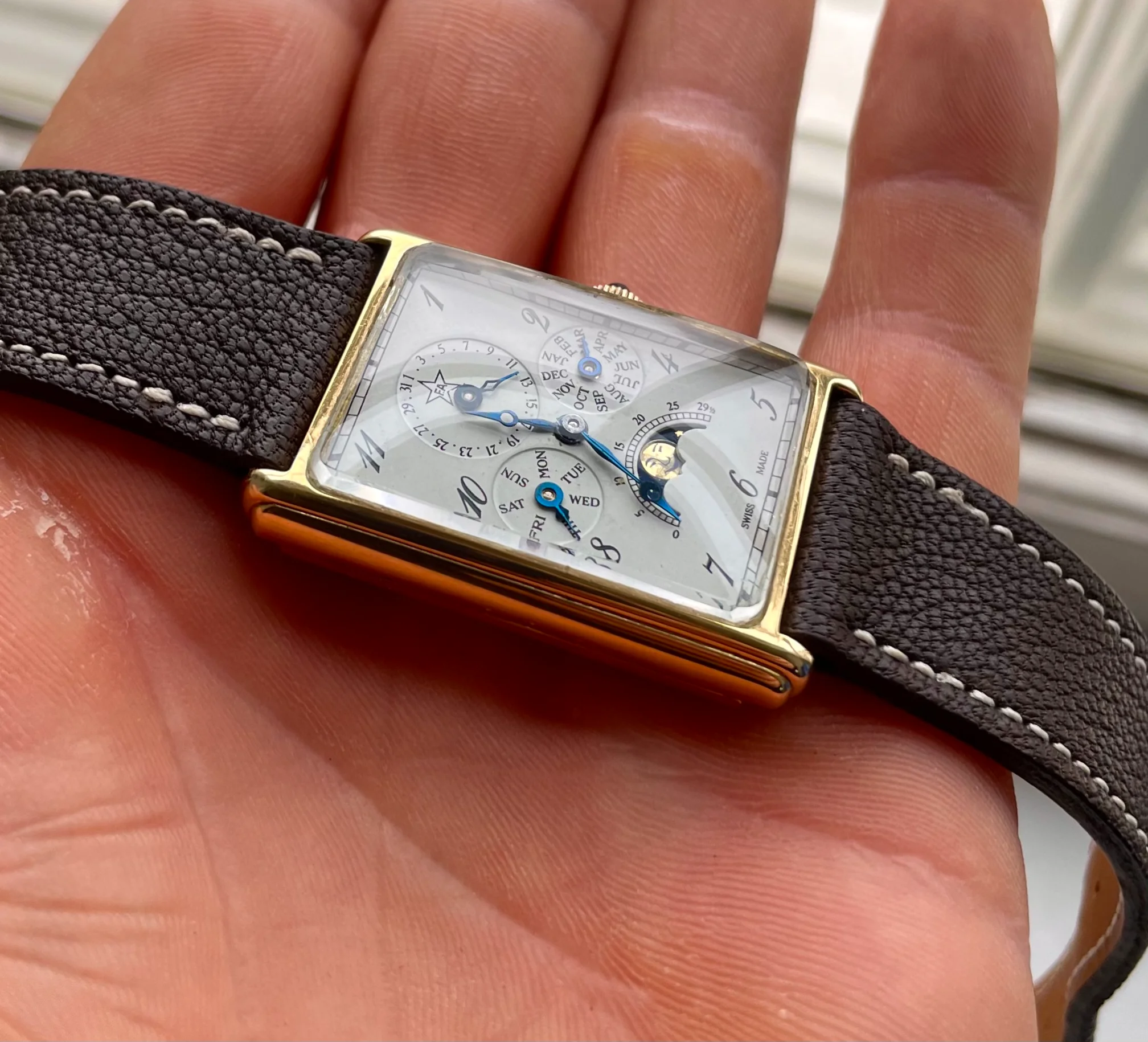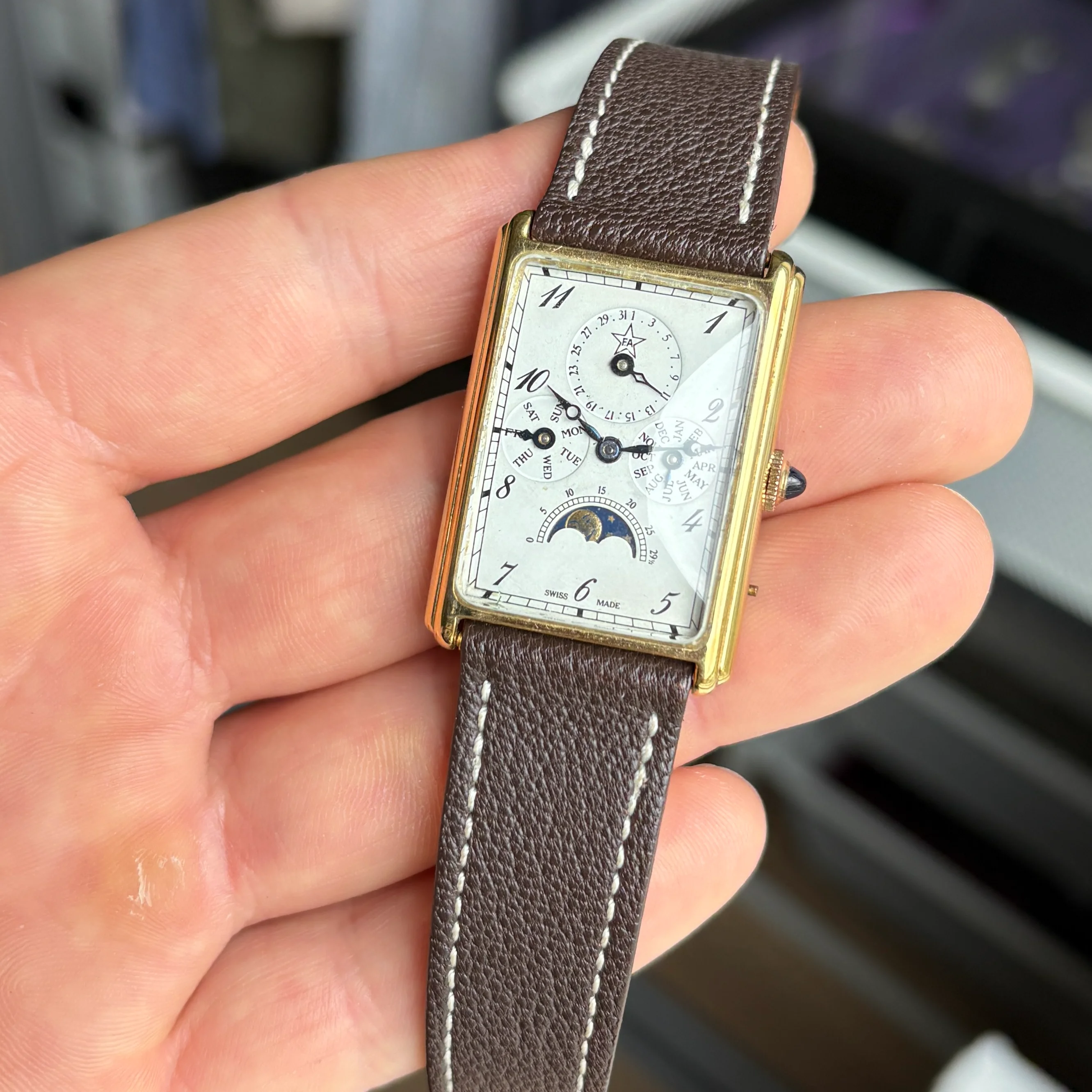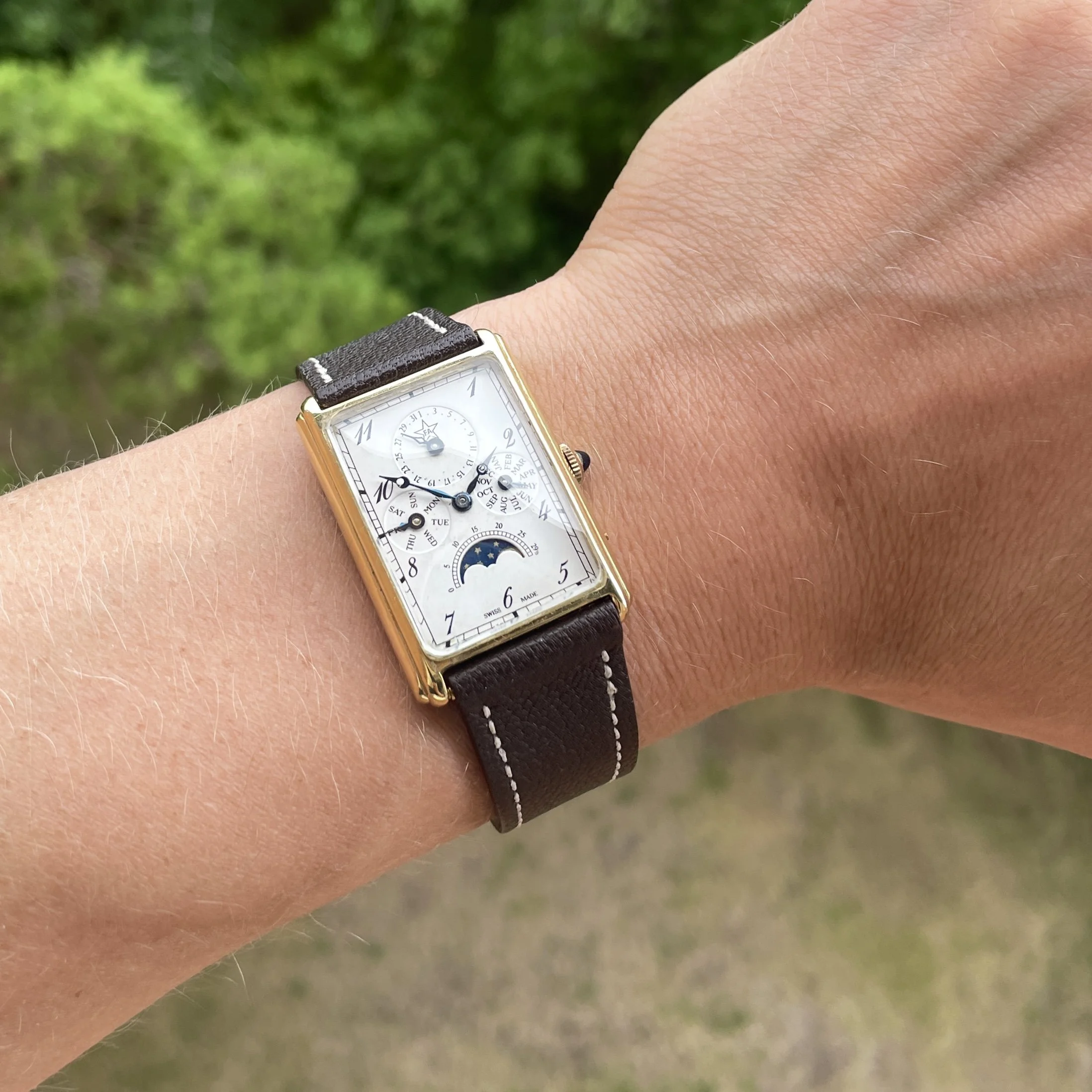 ·For sale is a very cool manual triple date moonphase from the 80s in a square case, these are very uncommon and this one is branded F.A but there was also some branded Sinn or Chronoswiss.