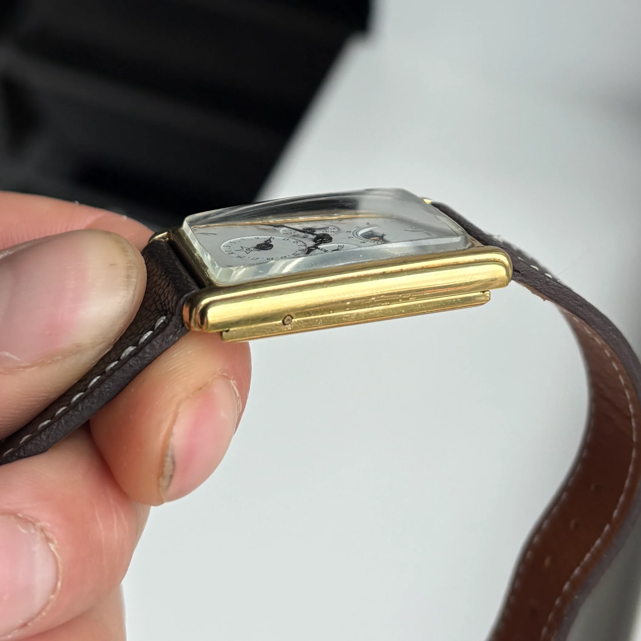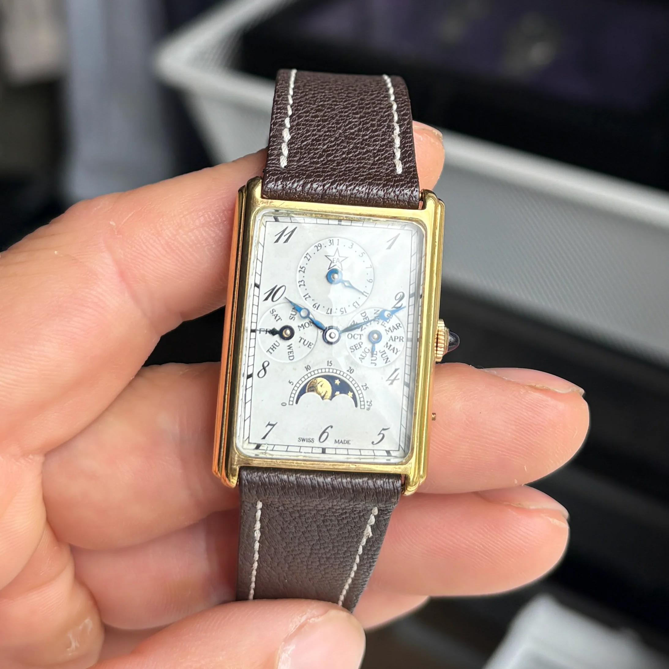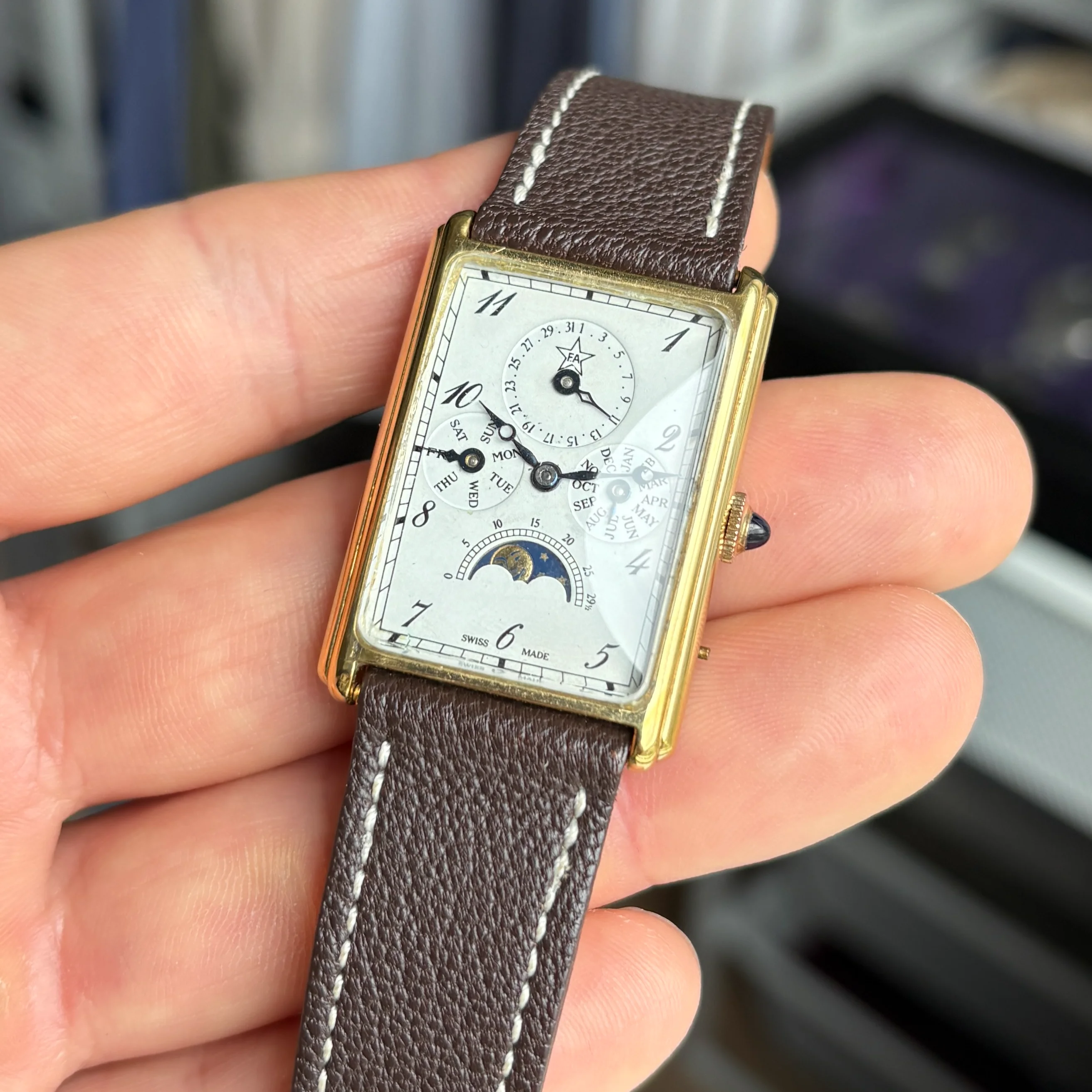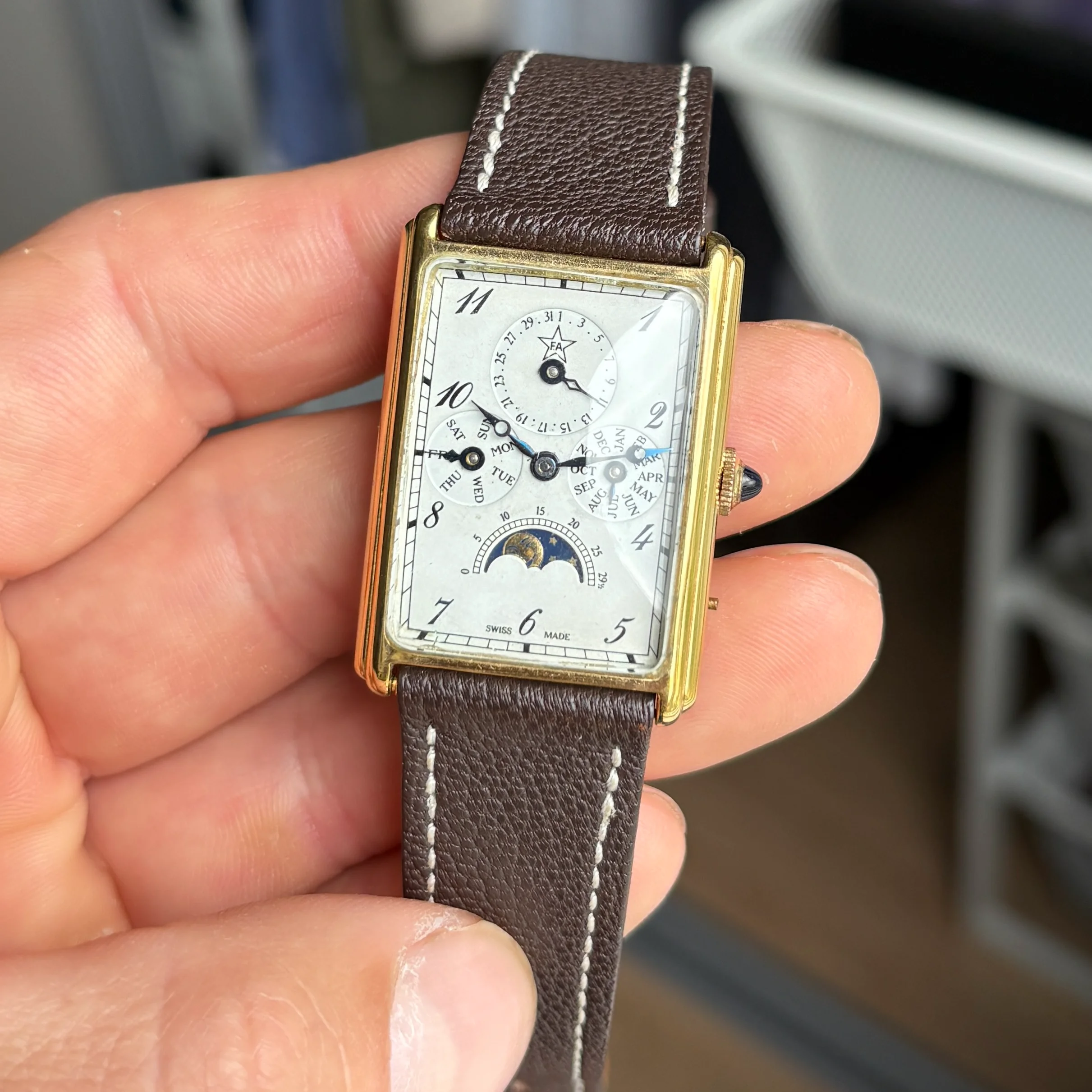 ·For sale is a very cool manual triple date moonphase from the 80s in a square case, these are very uncommon and this one is branded F.A but there was also some branded Sinn or Chronoswiss.