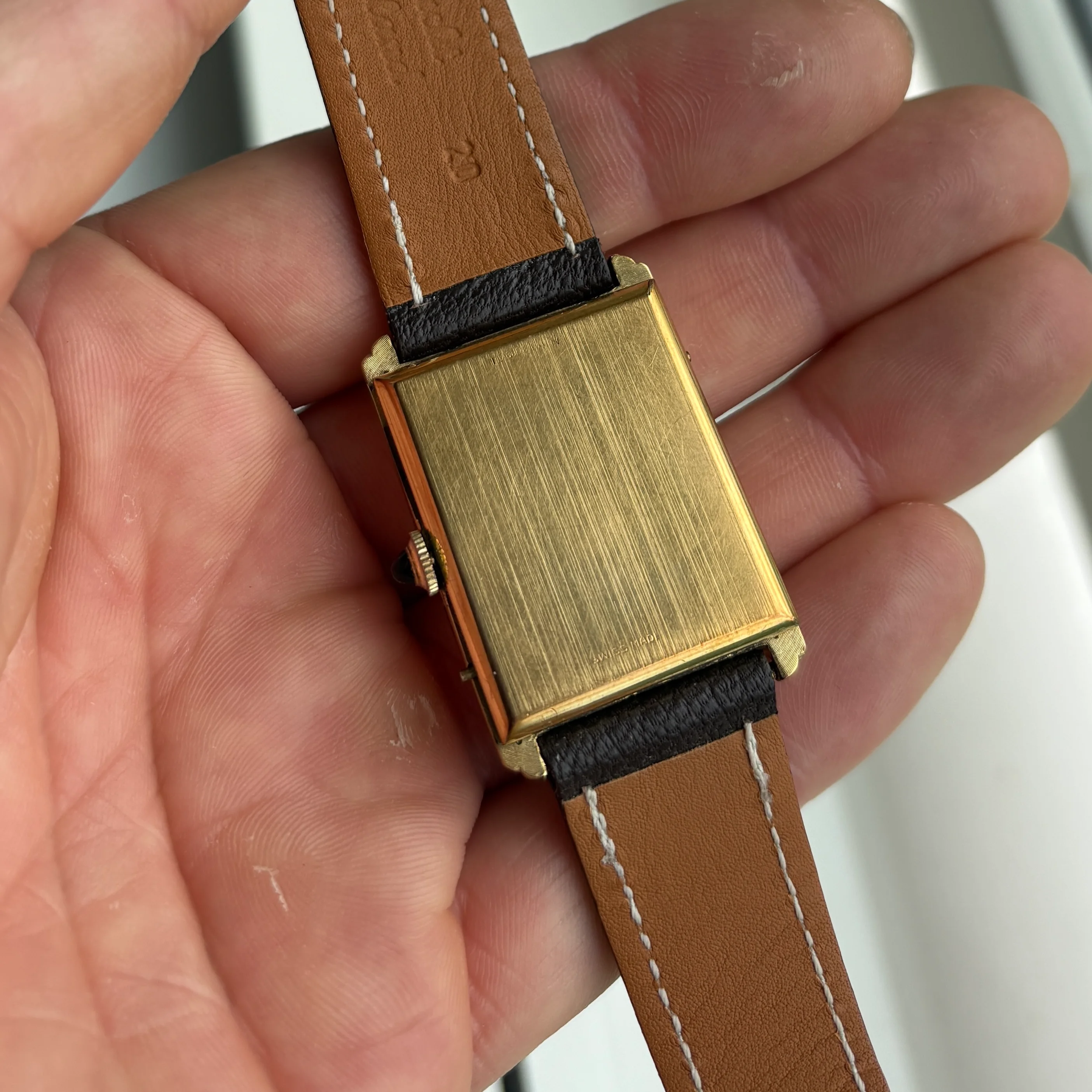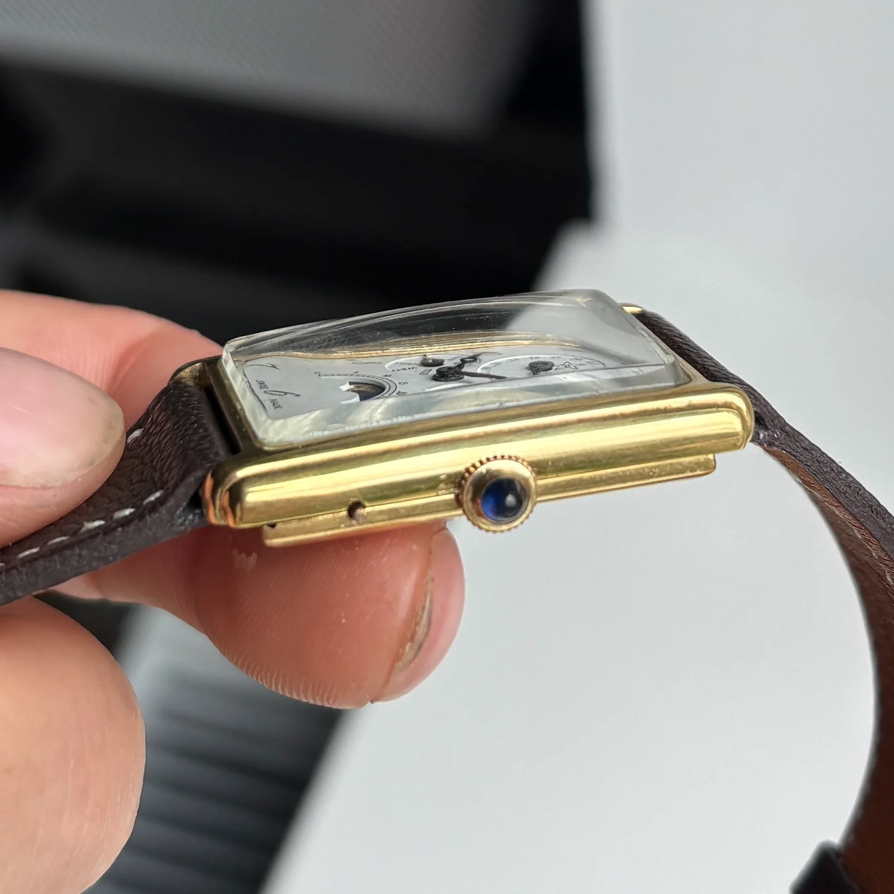 Case is goldfilled without any signs of gold wear and measures a good 26x38mm, the crown features a nice blue sapphire. Lug width is 20mm and the watch will be delivered on a high quality grained calf leather.