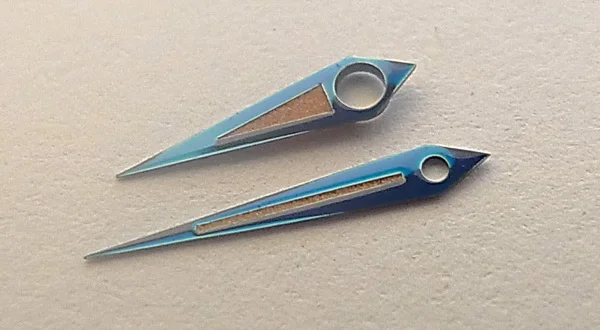 Rare blued Omega hands with original honey aged luminous. Hands are a coated blue and not heat treated. Color is even. Seems to be a best fit for Caliber 500 models with inside seconds