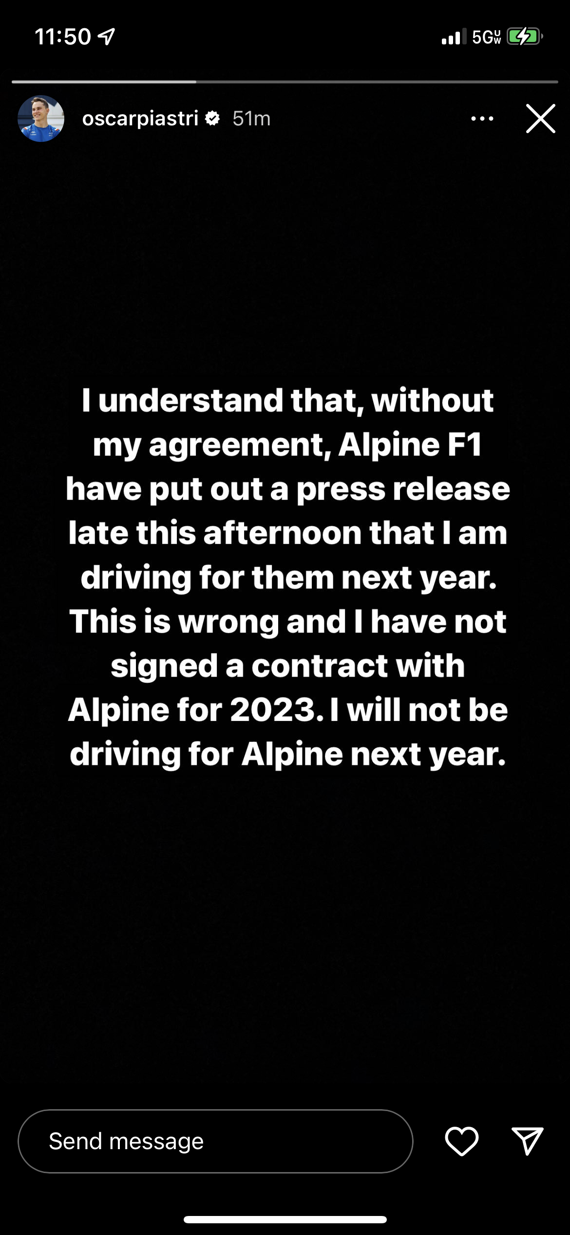 Piastri has put out a statement saying that he will not be driving for Alpine in 2023. 🍿