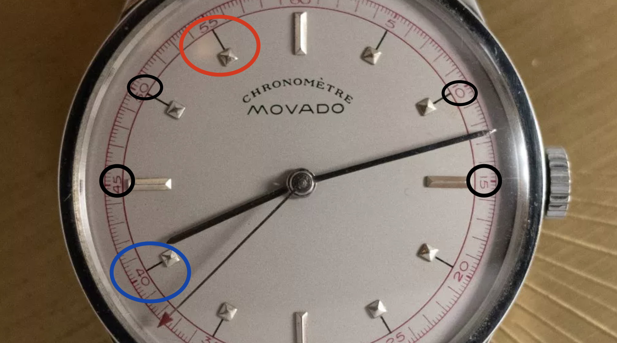 I also notice some alignment issues (blue circle shows bad alignment between the black line and red minute tick and the red circle shows bad alignment between the black line and the index). I'm not sure if these are due to crystal distortions or if they're actually there. Even if they do exist... they could potentially be explained by the factory tolerances of 1930's dial manufacturing. But it seems a bit on the generous side.