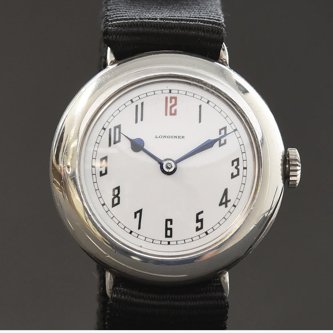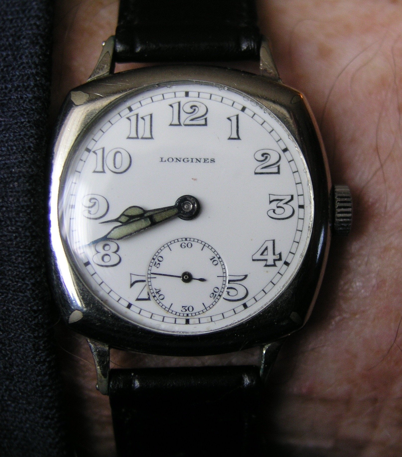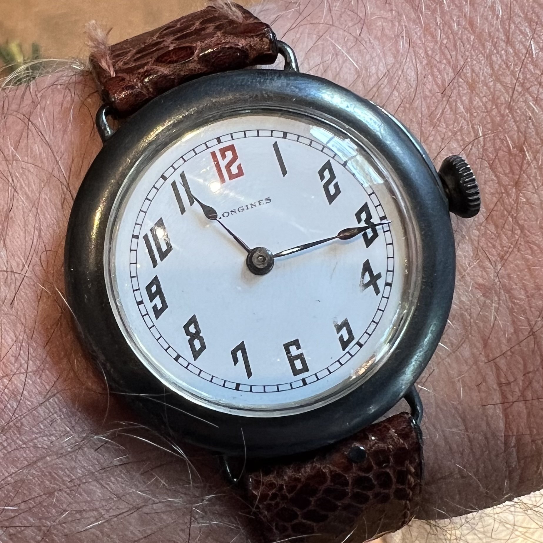 CASE/CROWN: ~32mm .925 silver, externally heavily oxidized to black, which I particularly like. Interior was exceptionally clean and untarnished. Lug width was about 16mm, and it had a hinged caseback and dust covers with hallmarks and stamped serial that matched the movement (3,3XX,XXX range). There were no “Swiss” or “Longines” signatures on the case, leading me to believe it was produced locally for the movement. The crown was particularly interesting as it perfectly matched the case patina and looked very at-home on the case, but does not match many of the more “onion-style” crowns I’ve seen on contemporary examples. Caseback hinge was tight, case was clean with no sign of repairs. Crystal was acrylic, in good shape.