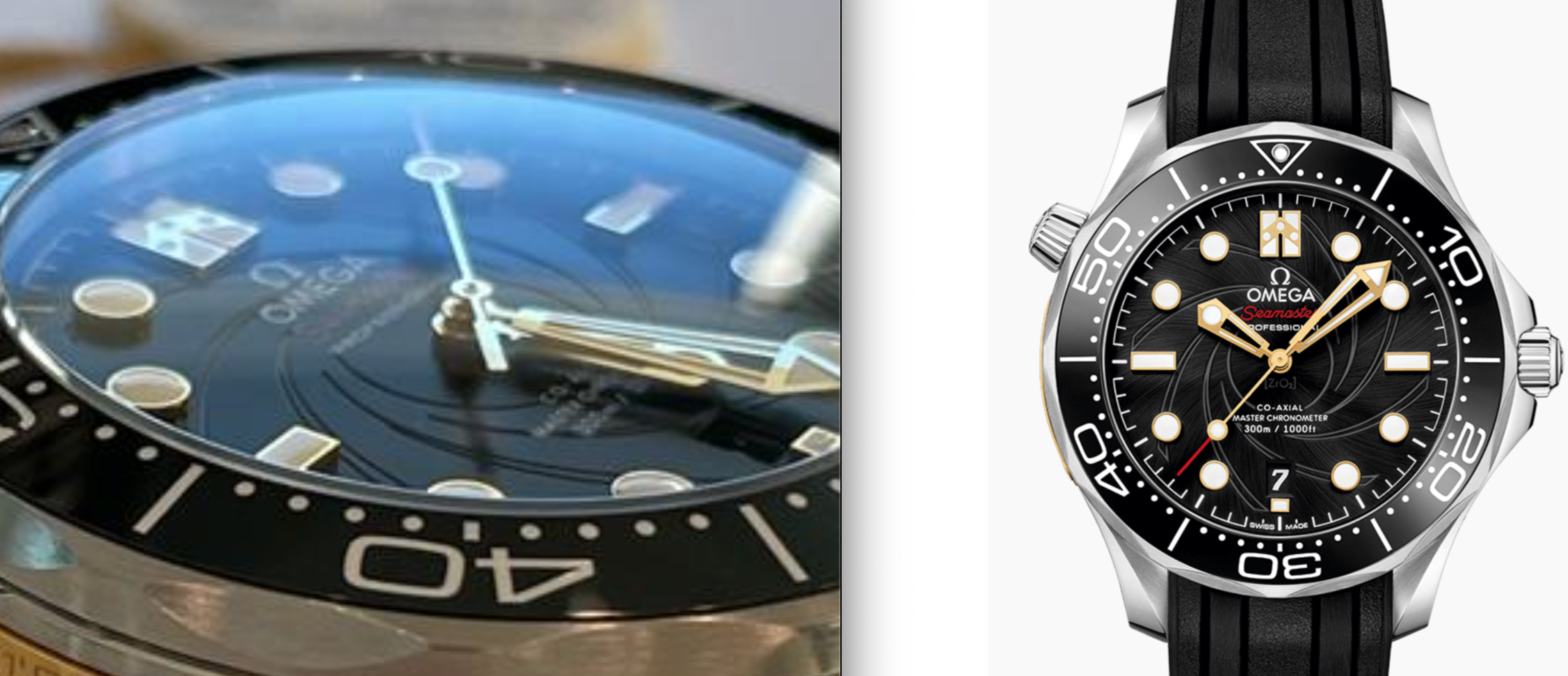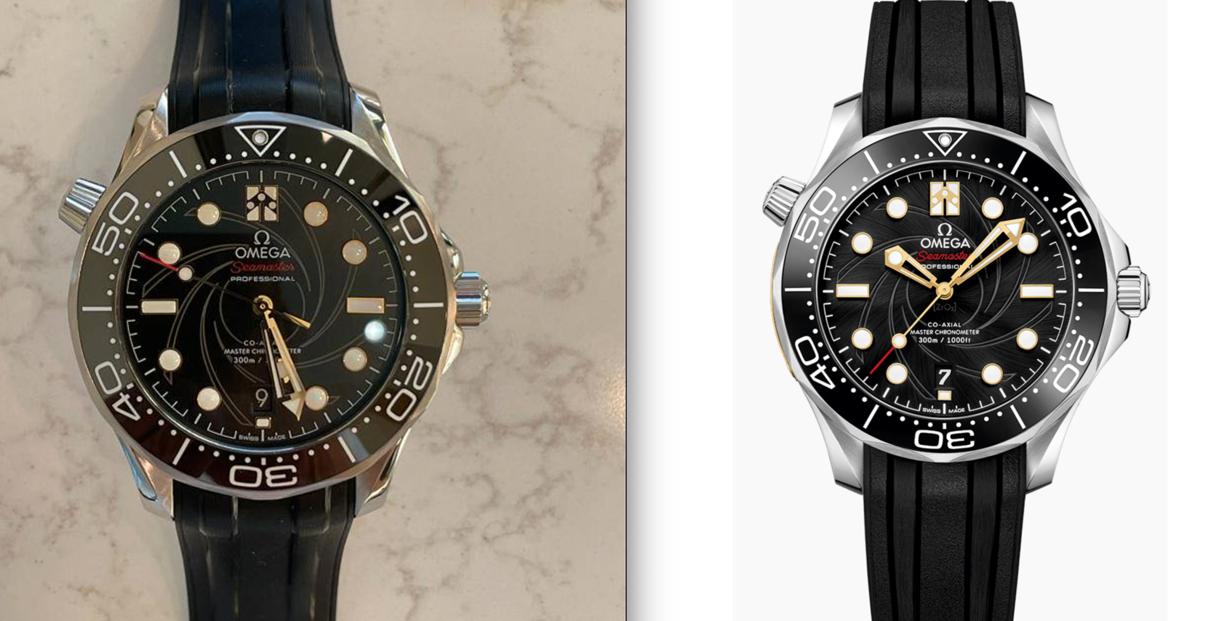 2. Maybe this is due to the lighting in your images compared to the bright light from Omega, but you can see a dial texture, almost like a sunburst effect on the dial on the right, whereas yours does not appear to have this. This image of yours is the best example and I feel, even in your lighting, we should see that texture. I hope this makes sense.
