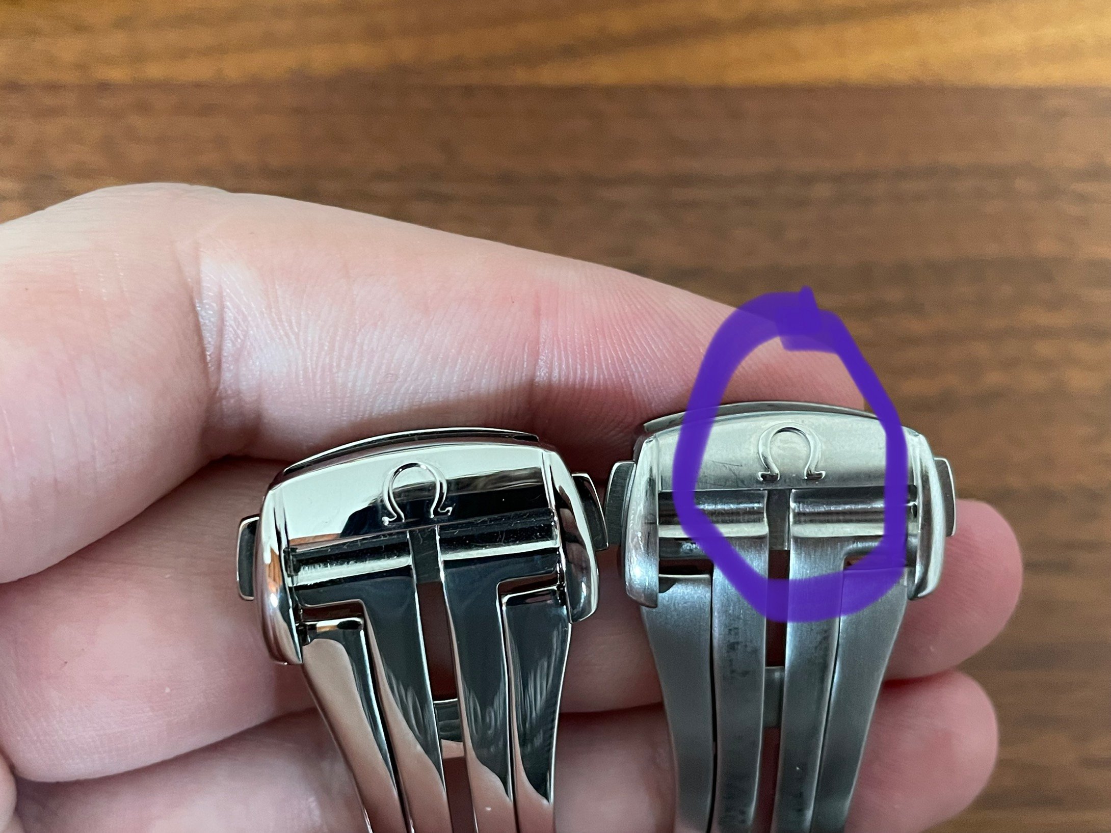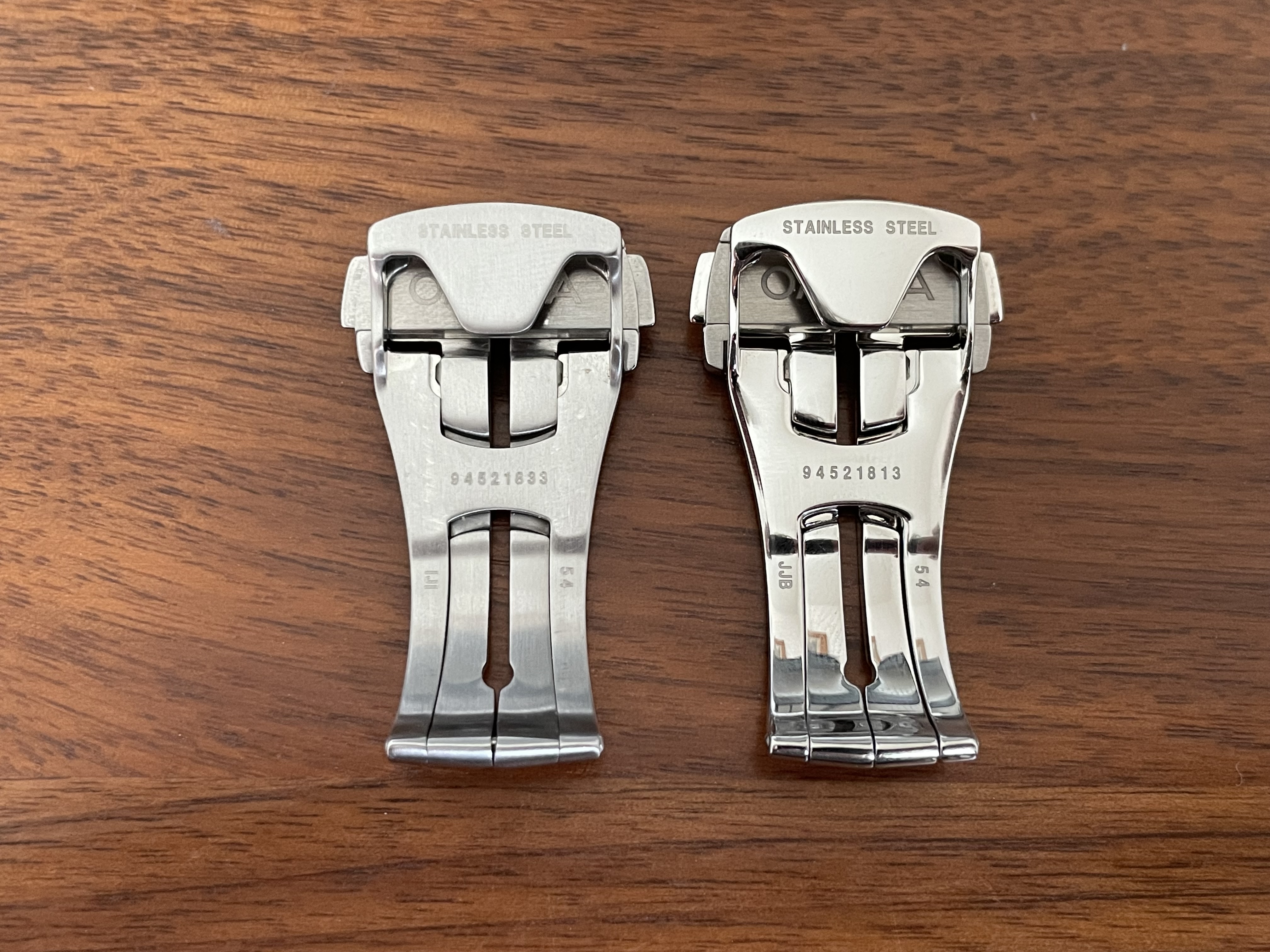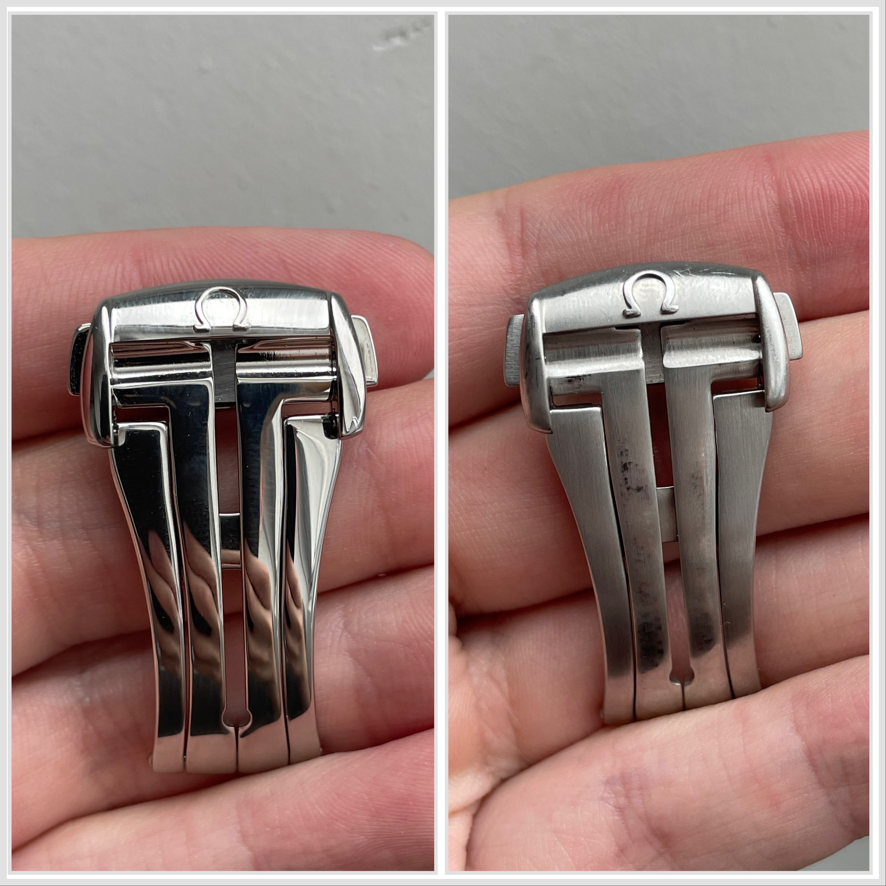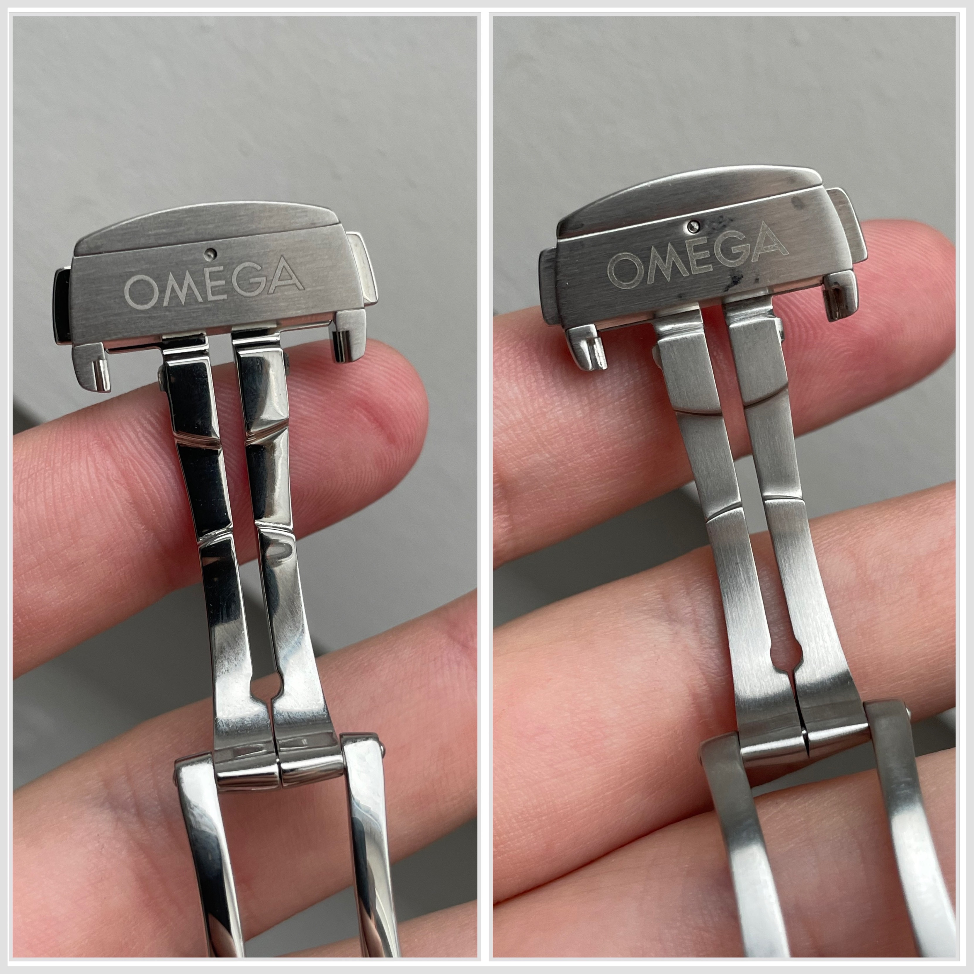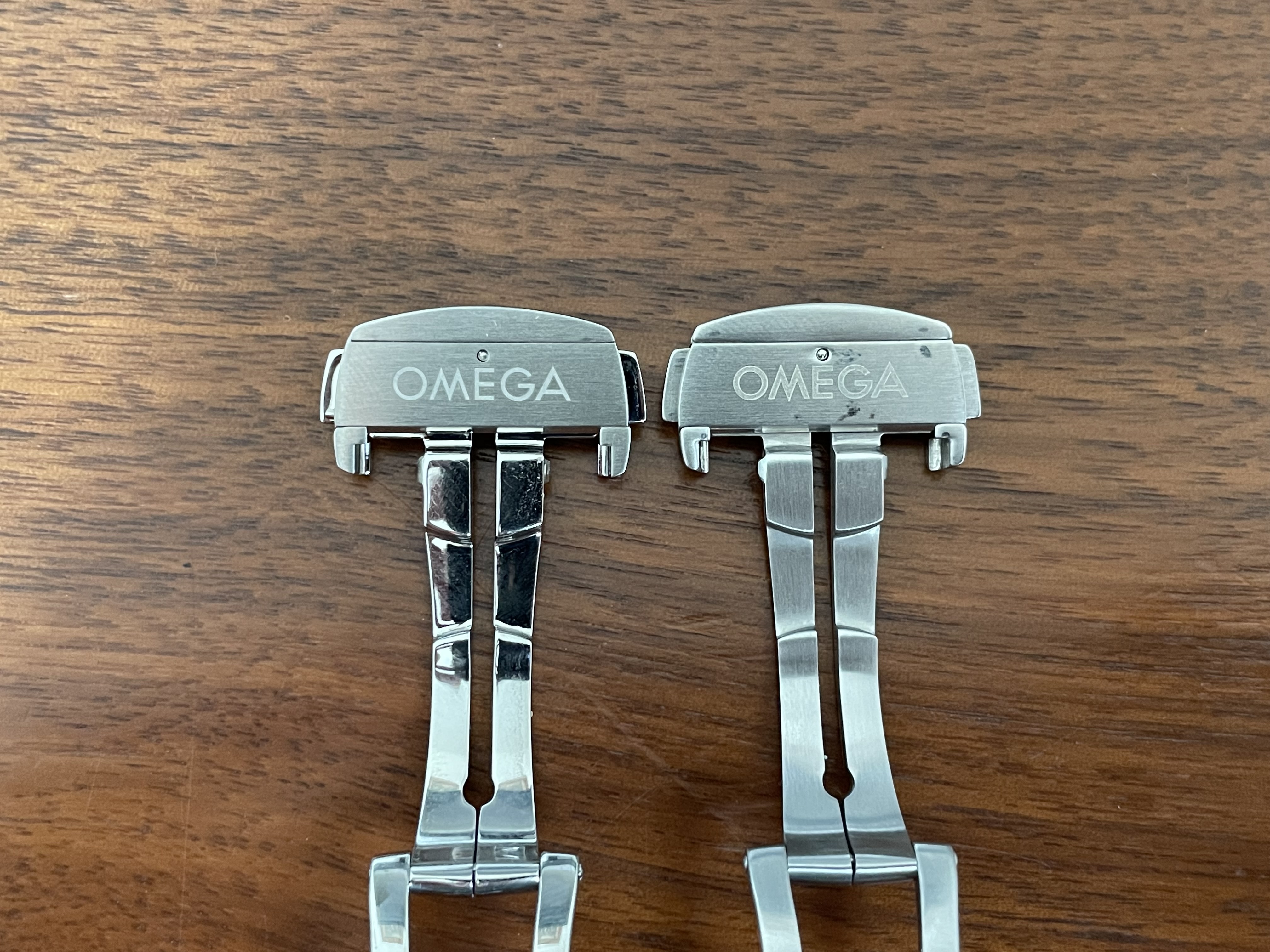 I have these two Omega deployant clasps, but I am not sure if they are original or good fakes. I noticed that they have slightly different dimensions and the lettering seems to be slightly different too. The logo also seems to be slightly different. Or is one simply older than the other and Omega has made some small changes? If someone could shed some light on this I would be very grateful. Here are a few pictures: