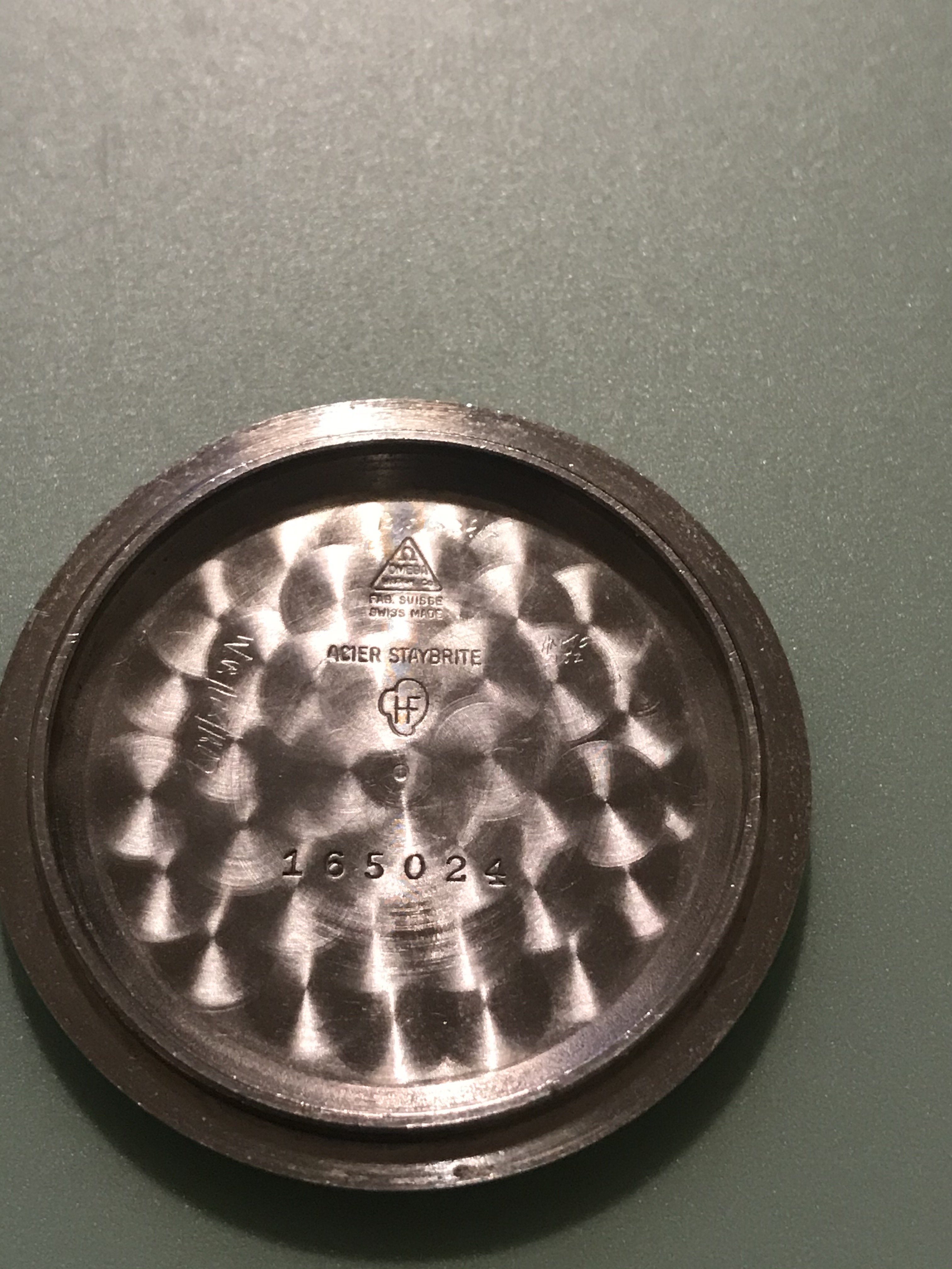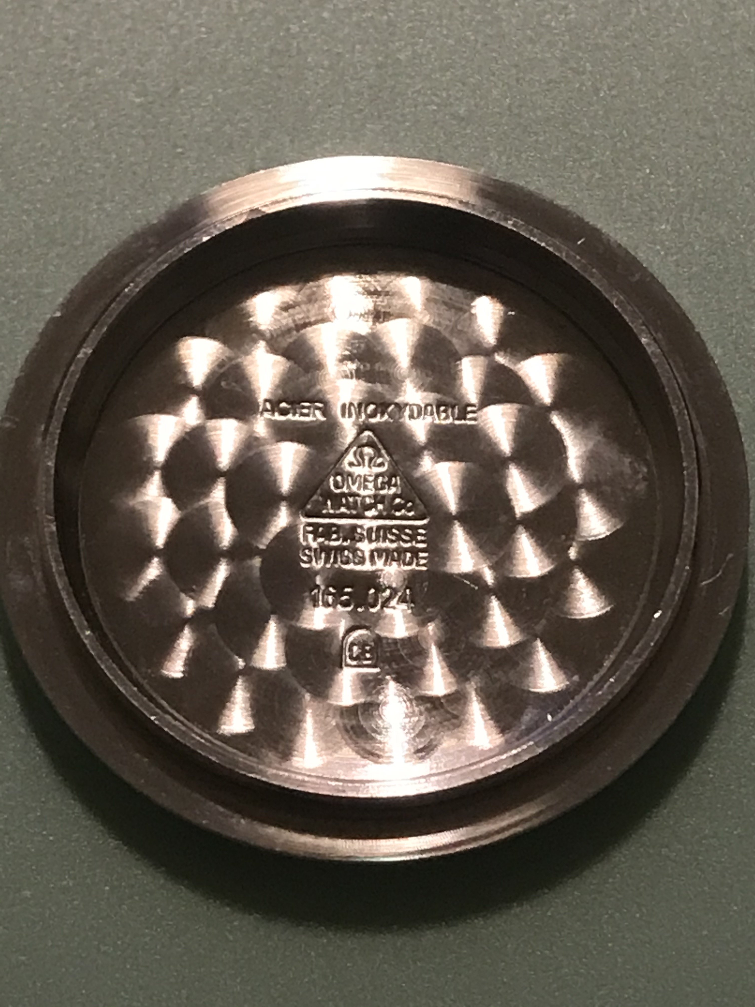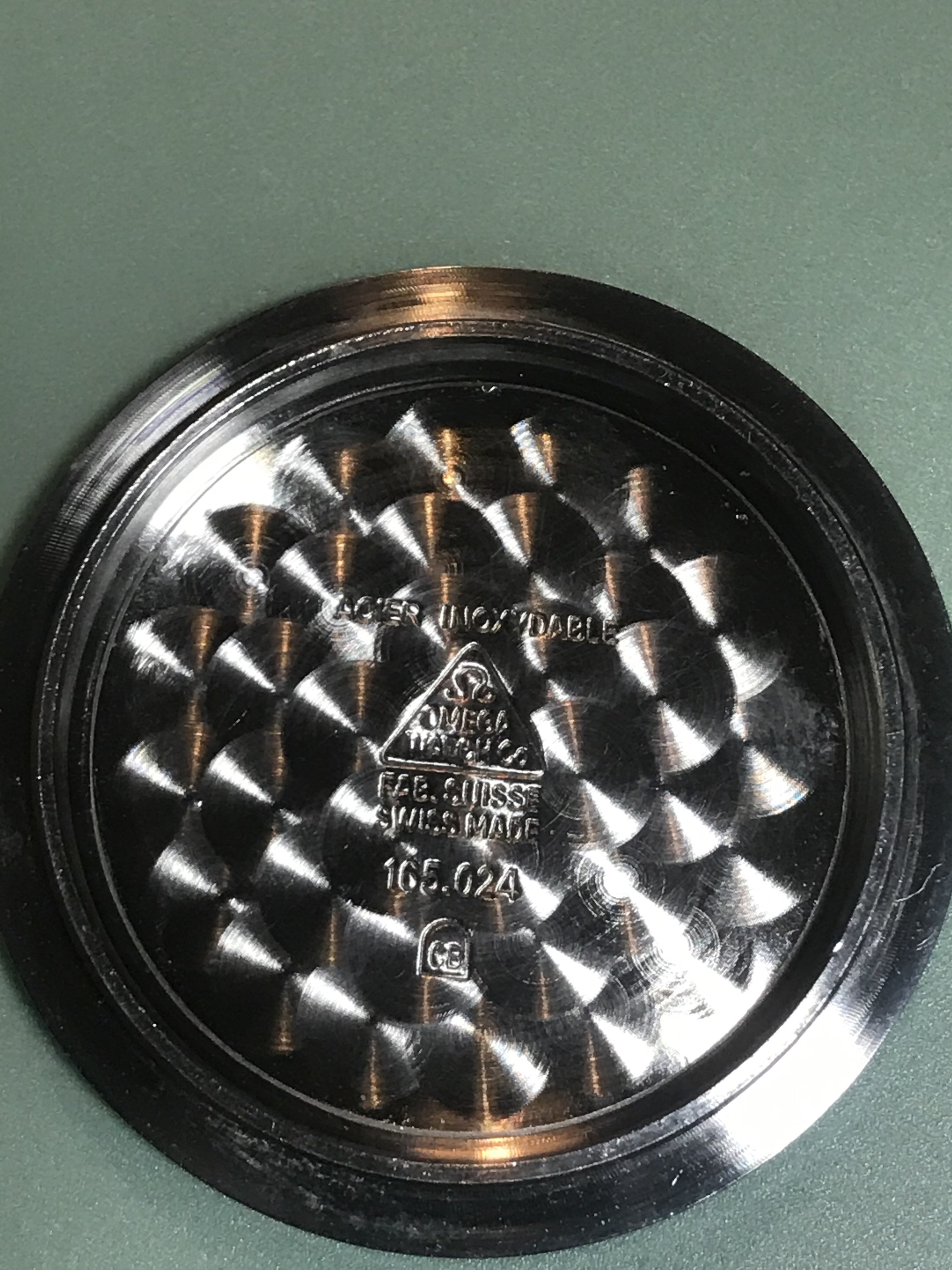 In the photos I have used a genuine period used 165024 caseback by HF, a modern 165.024 omega case back, and the fake one that has been polished to give it a used feel.