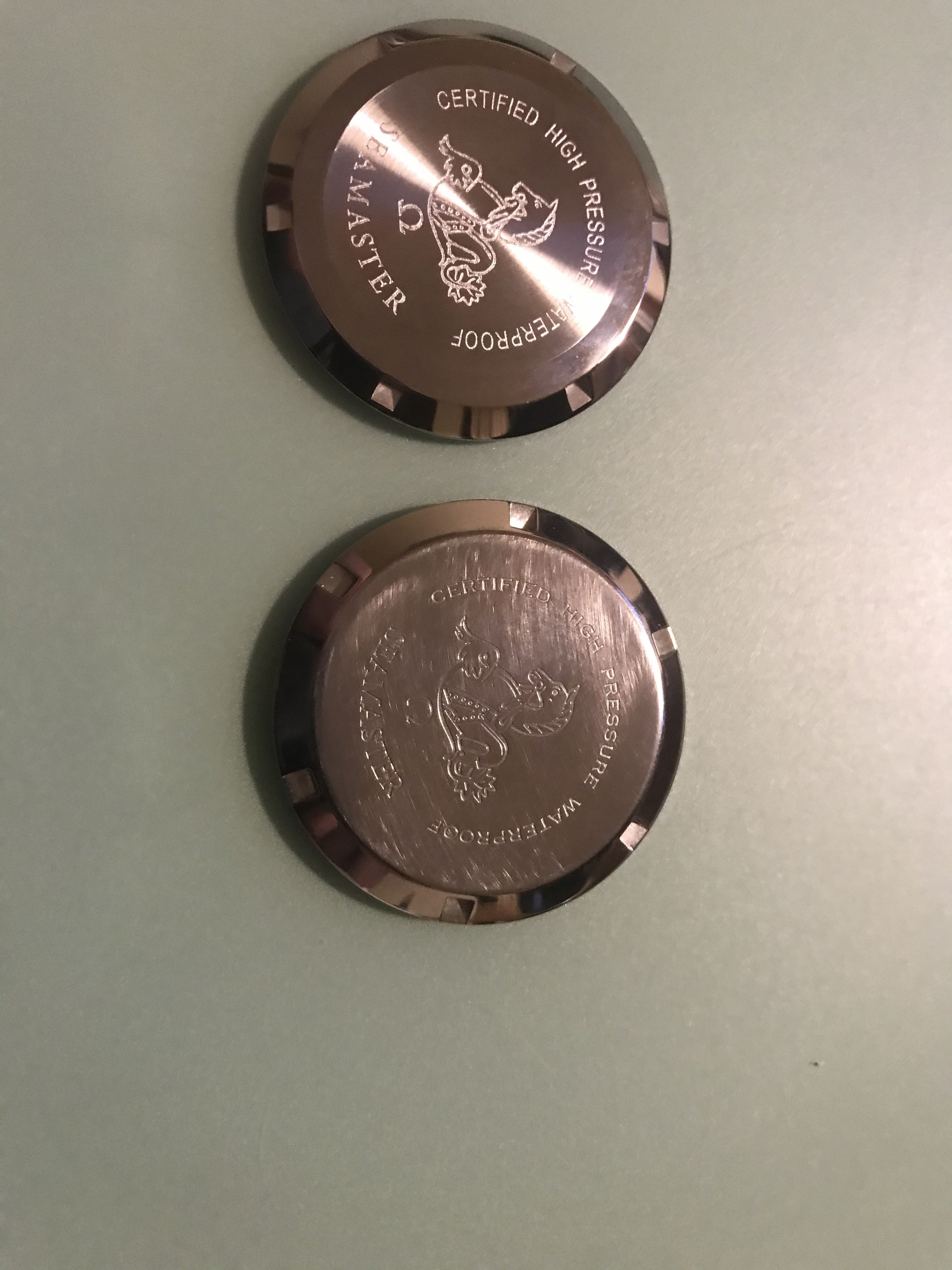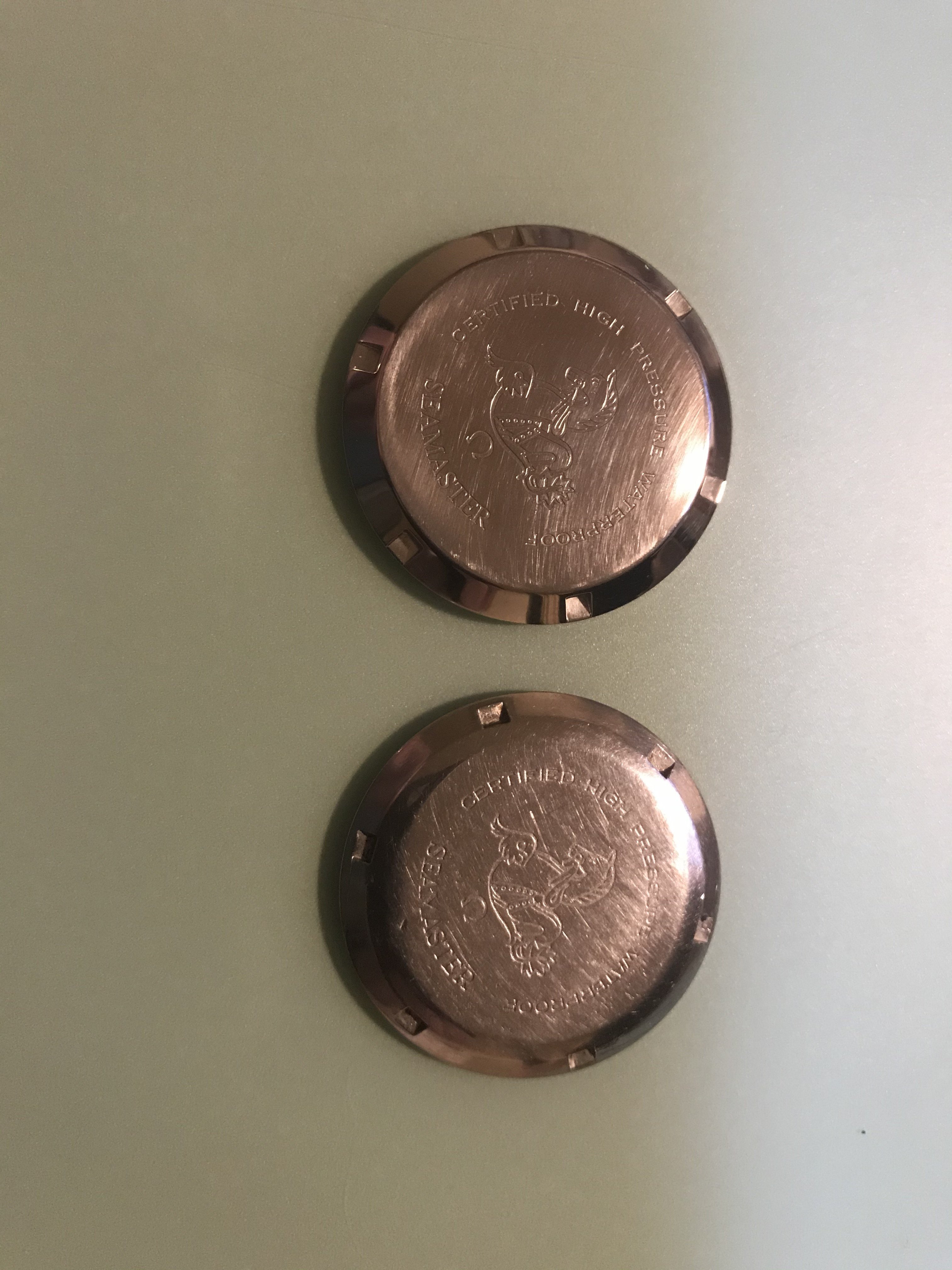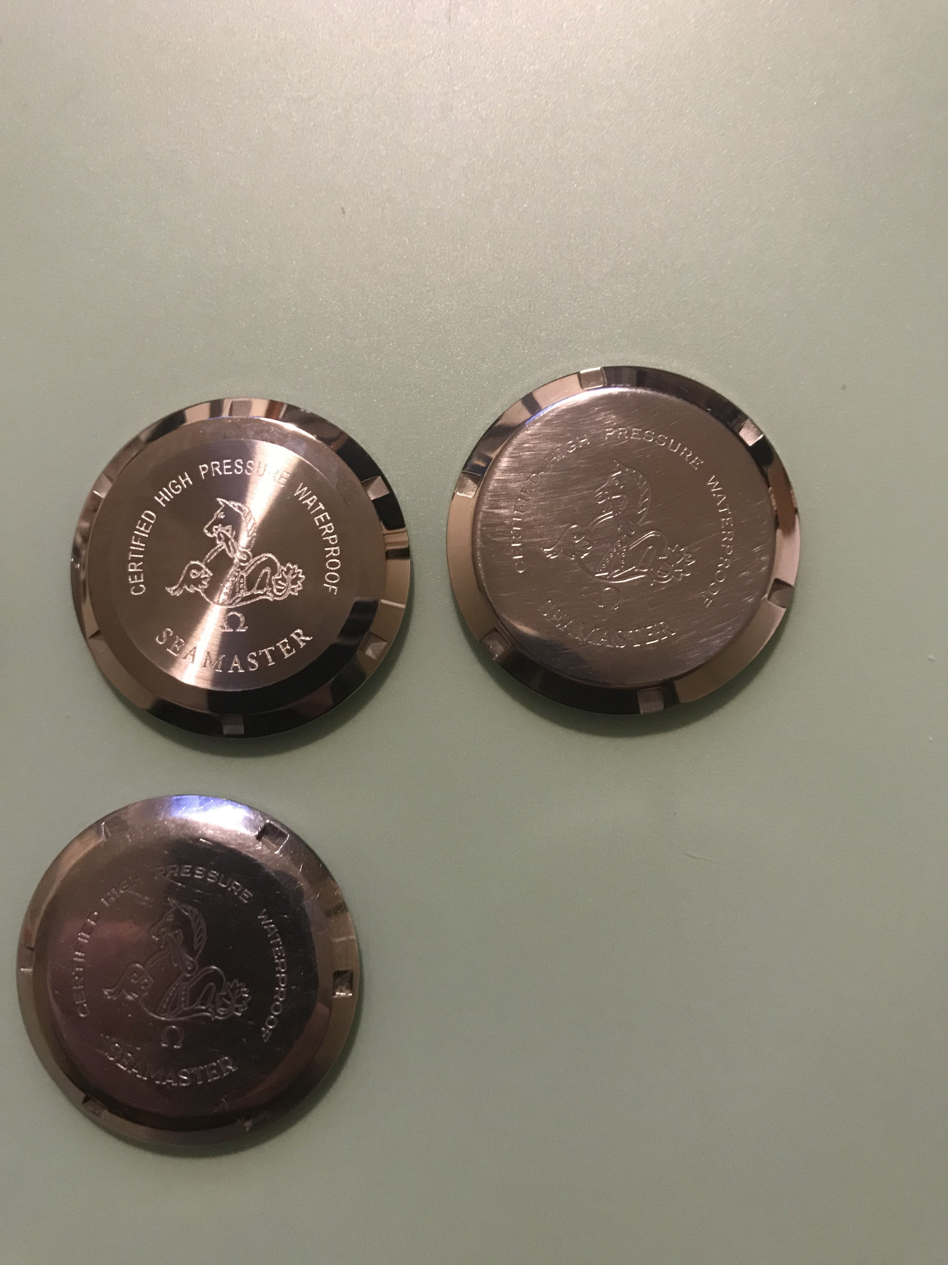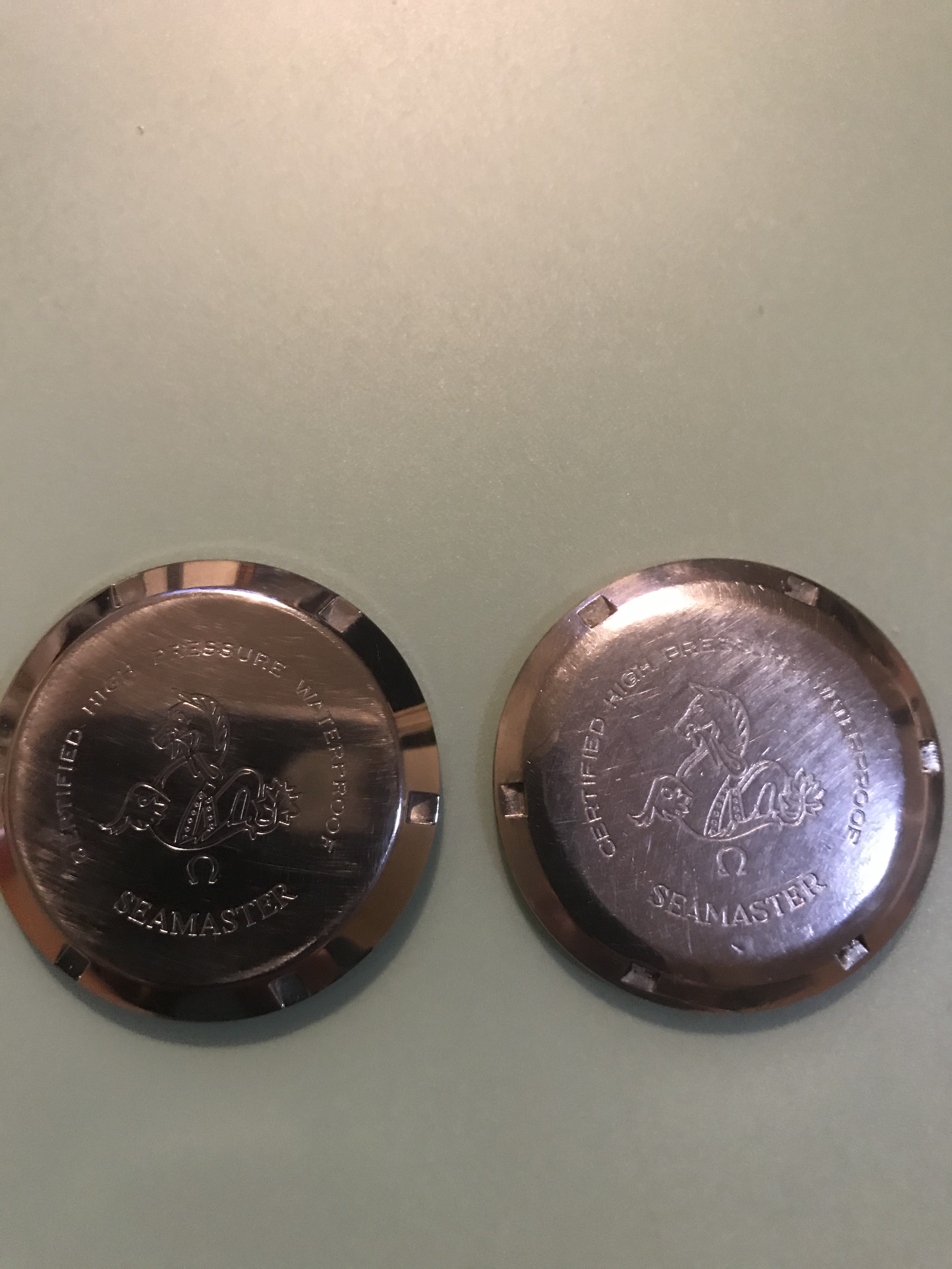 In the photos I have used a genuine period used 165024 caseback by HF, a modern 165.024 omega case back, and the fake one that has been polished to give it a used feel.
