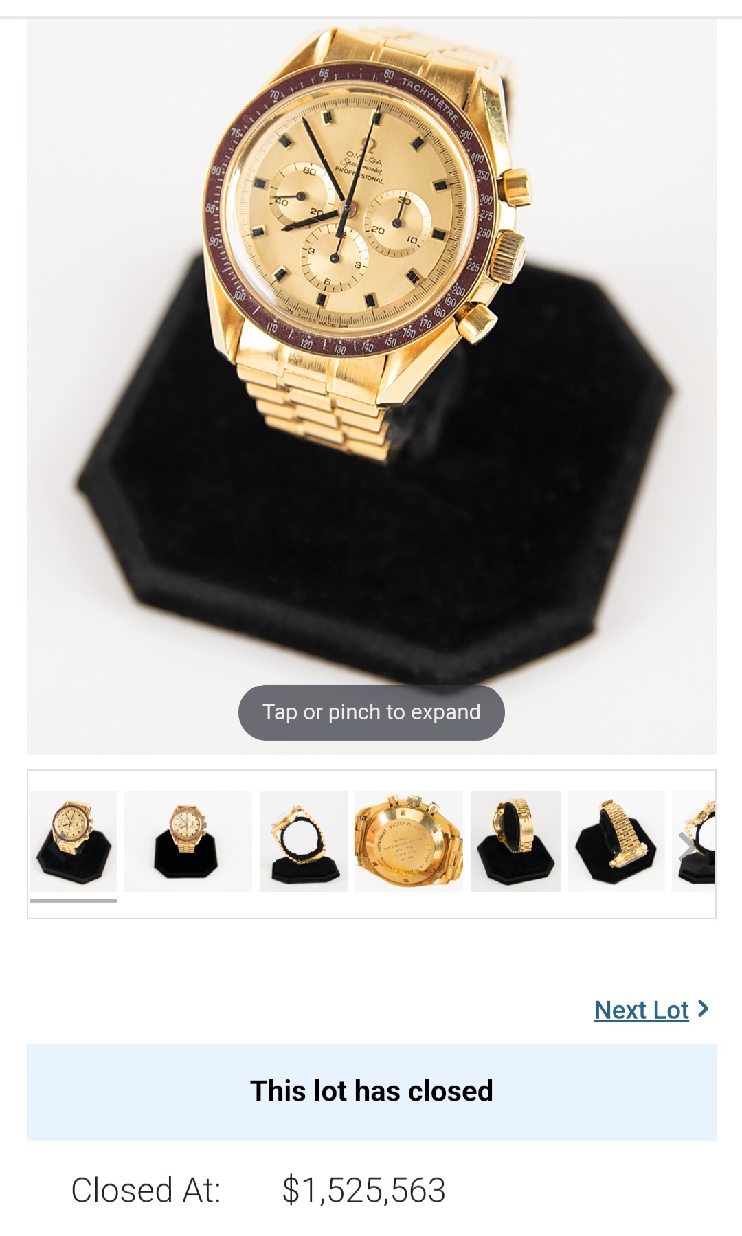 Schirra's 18K gold Omega Speedmaster sold for $1,906,953.75 ($1,525,563 before buyer's premium). The Apollo 15 lunar surface-worn Bulova sold for $1,592,500 (with buyer's premium).