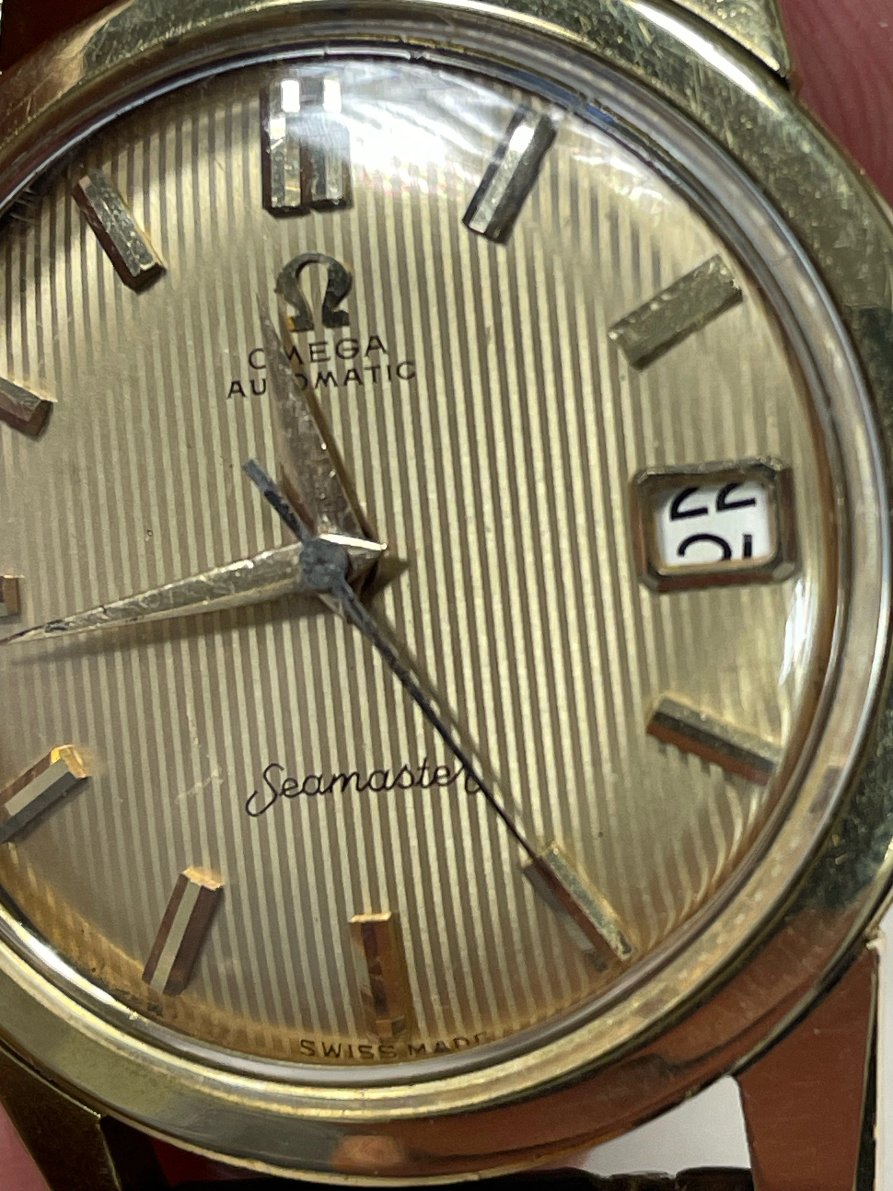 Now, my piece here is a 2992-4 with movement number 18,046,xxx, running on caliber 503 (20 jewels). The case is gold-capped, the crown is the original cloverleaf crown with flat feet logo, and the crystal is the correct Omega-signed version with date magnifier.