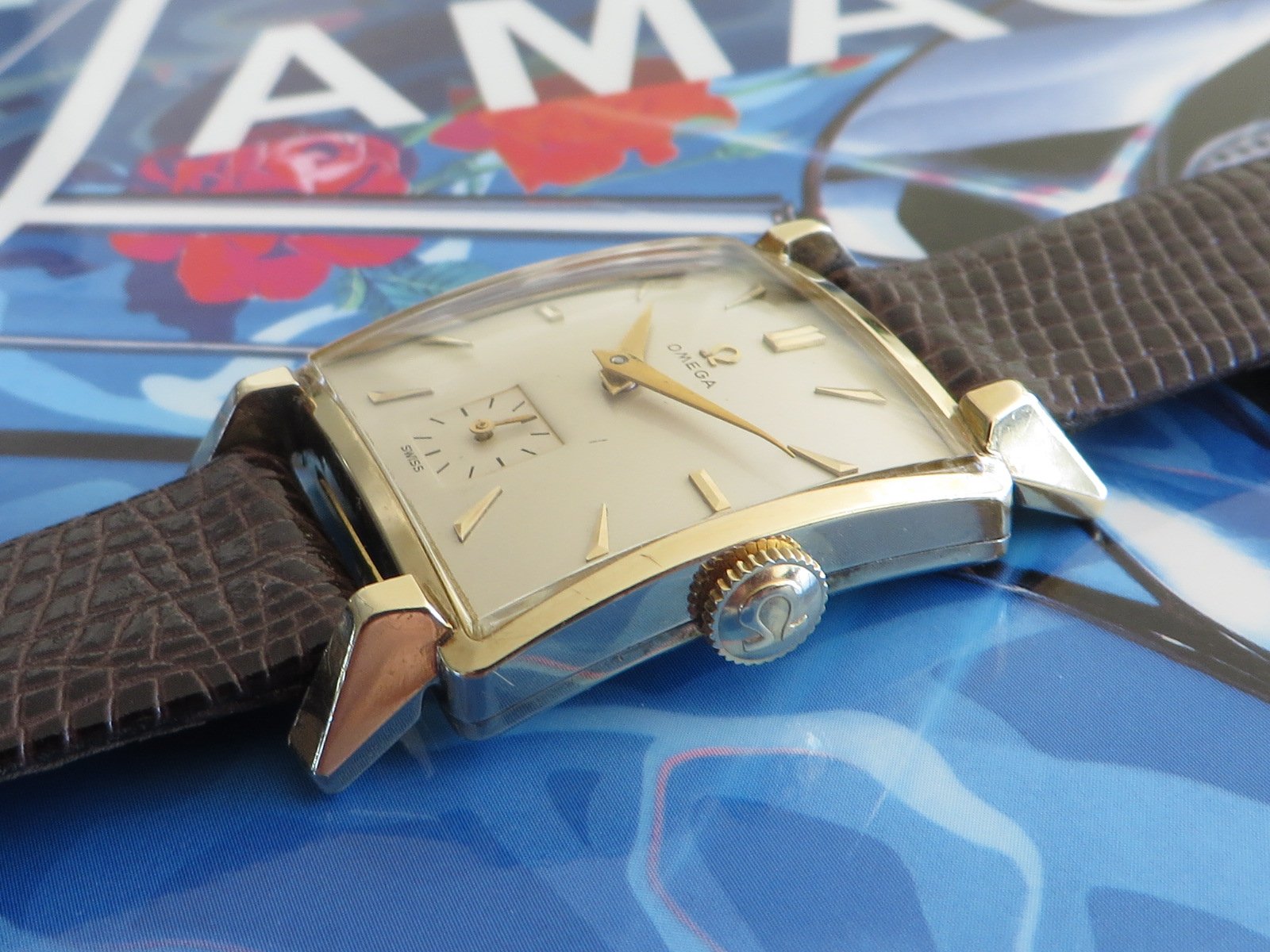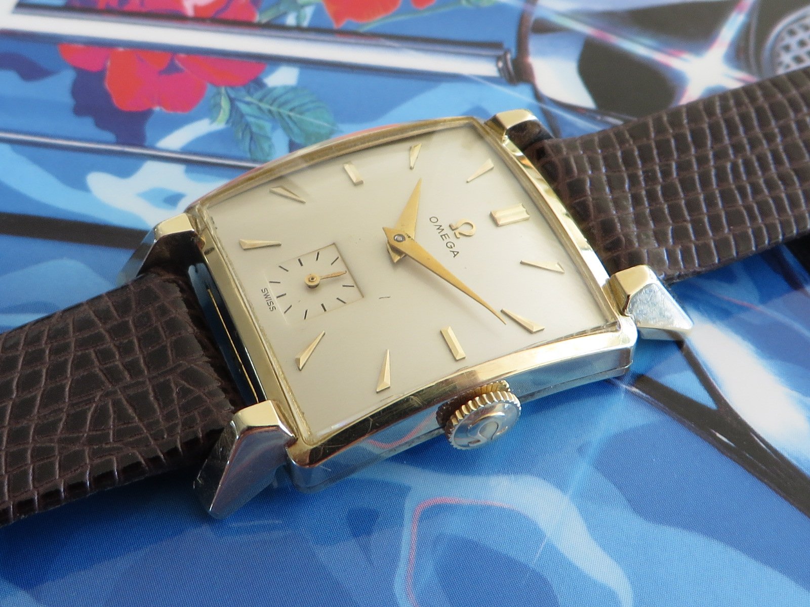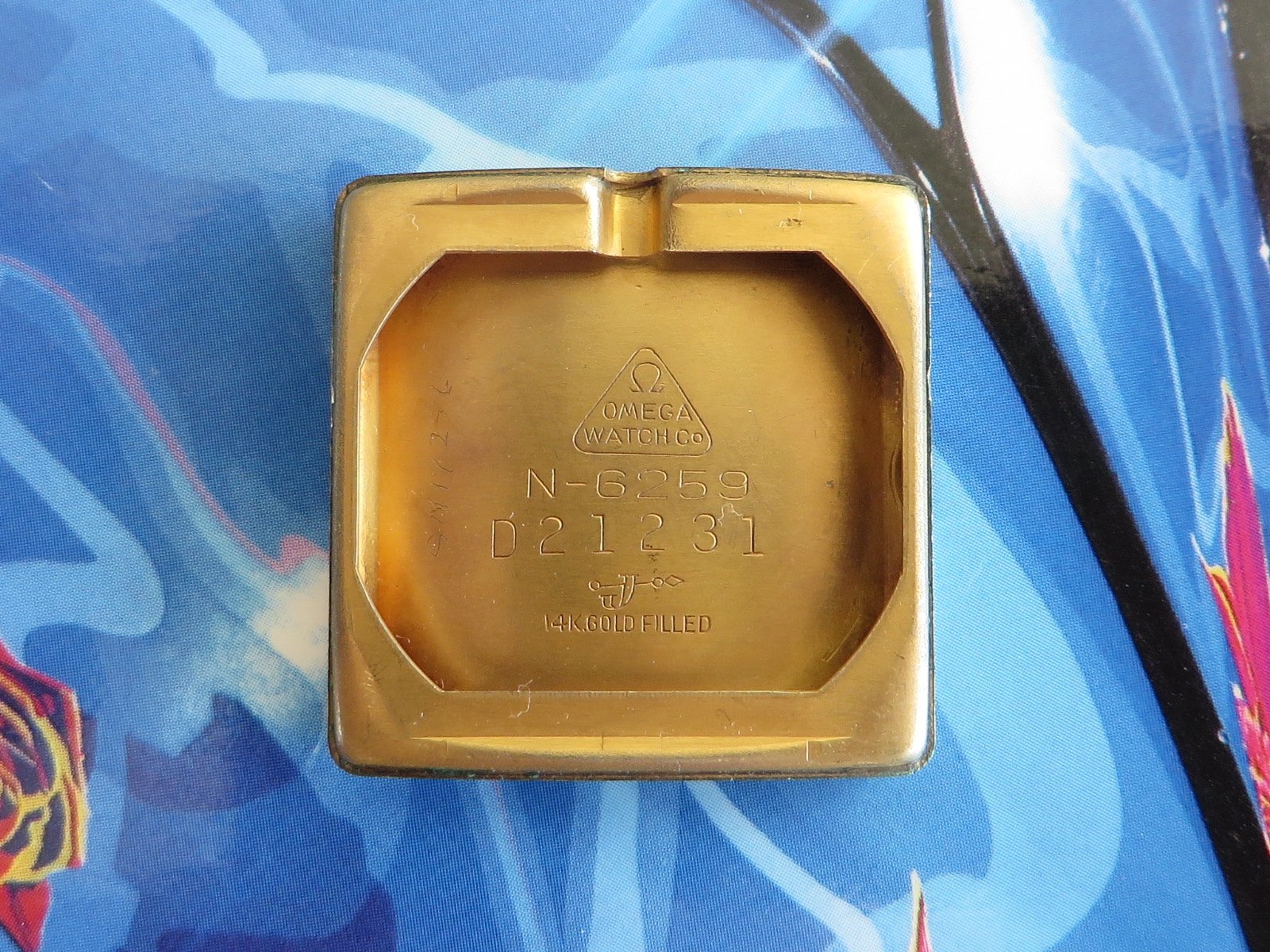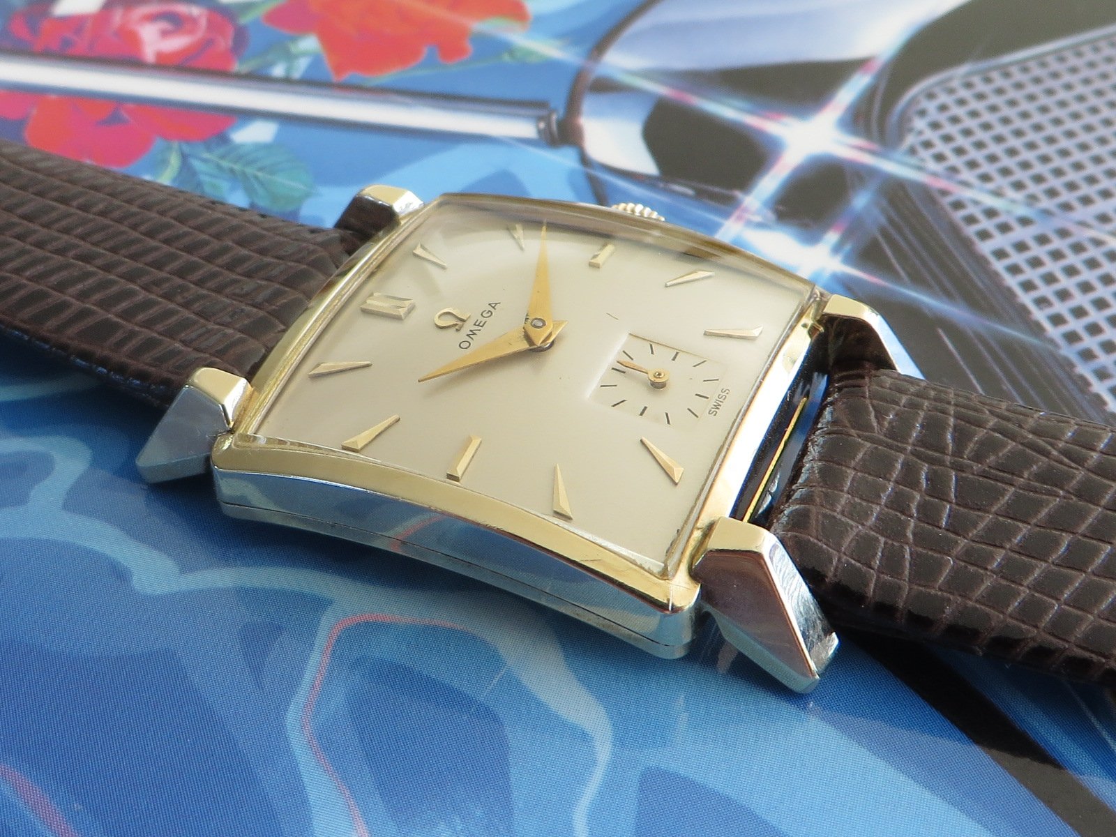 路路Vintage Omega AficionadoBeautiful reference N-6259 extra fancy curved back (think Gruen Curvex) 14K yellow gold-filled dress watch with double arched top and multi-faceted lugs. Nice crisp edges and the glass crystal is free of cracks or chips. Fitted with a vintage JB Champion lizard calf strap and includes the original red Omega box.