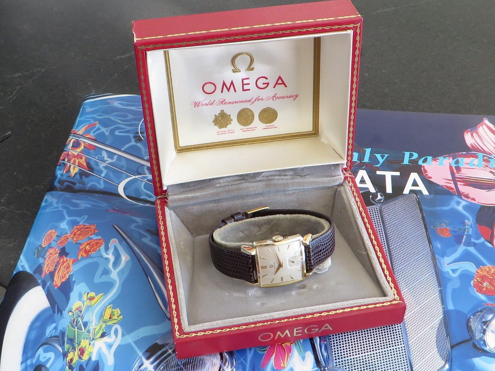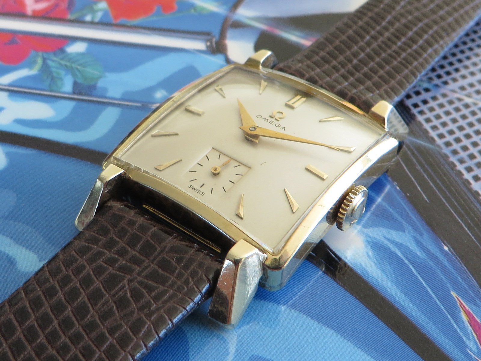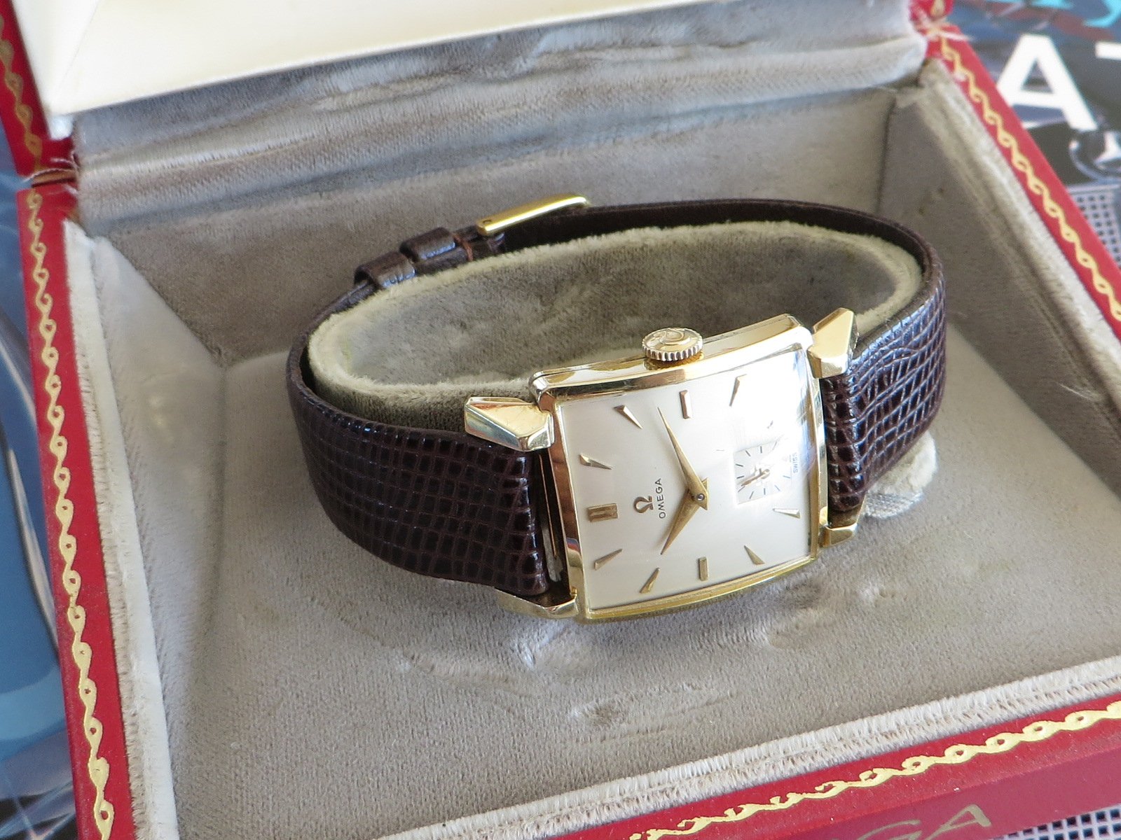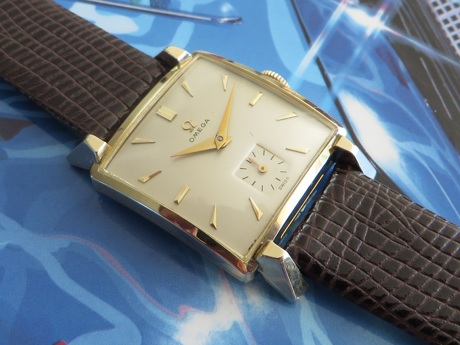 路路Vintage Omega AficionadoBeautiful reference N-6259 extra fancy curved back (think Gruen Curvex) 14K yellow gold-filled dress watch with double arched top and multi-faceted lugs. Nice crisp edges and the glass crystal is free of cracks or chips. Fitted with a vintage JB Champion lizard calf strap and includes the original red Omega box.