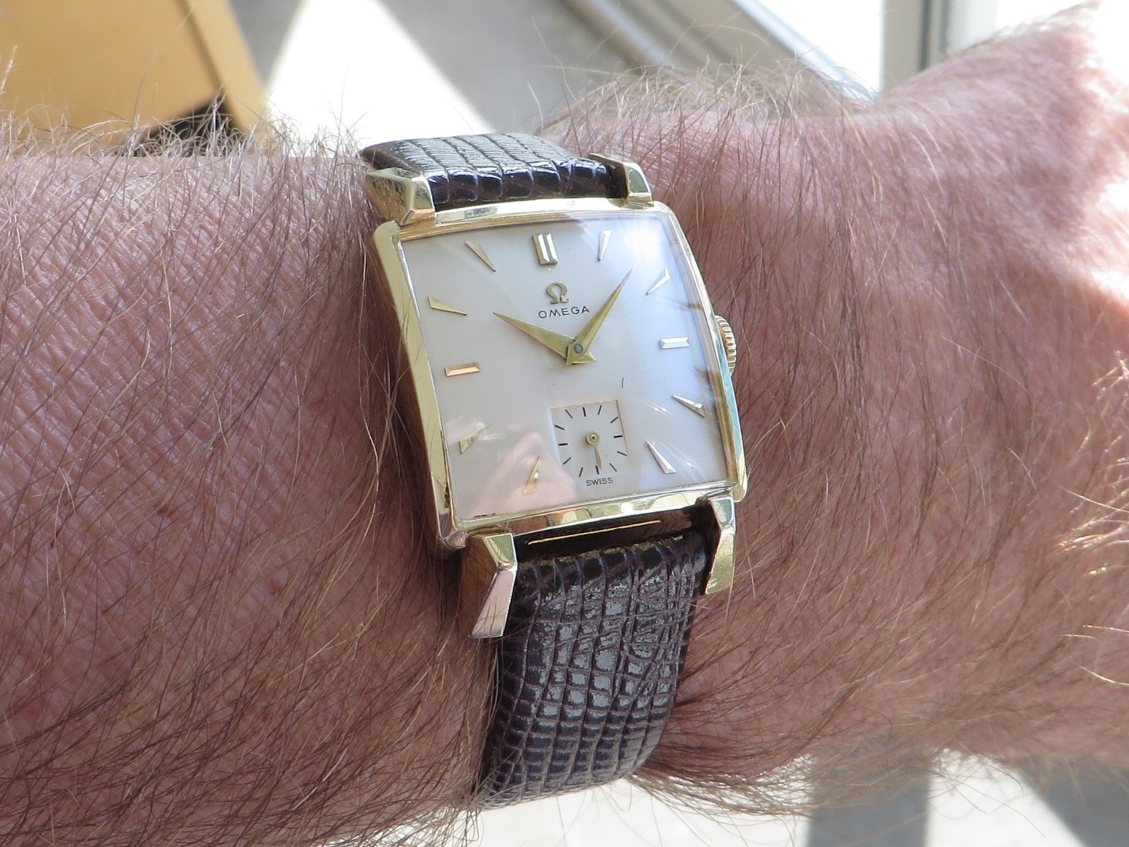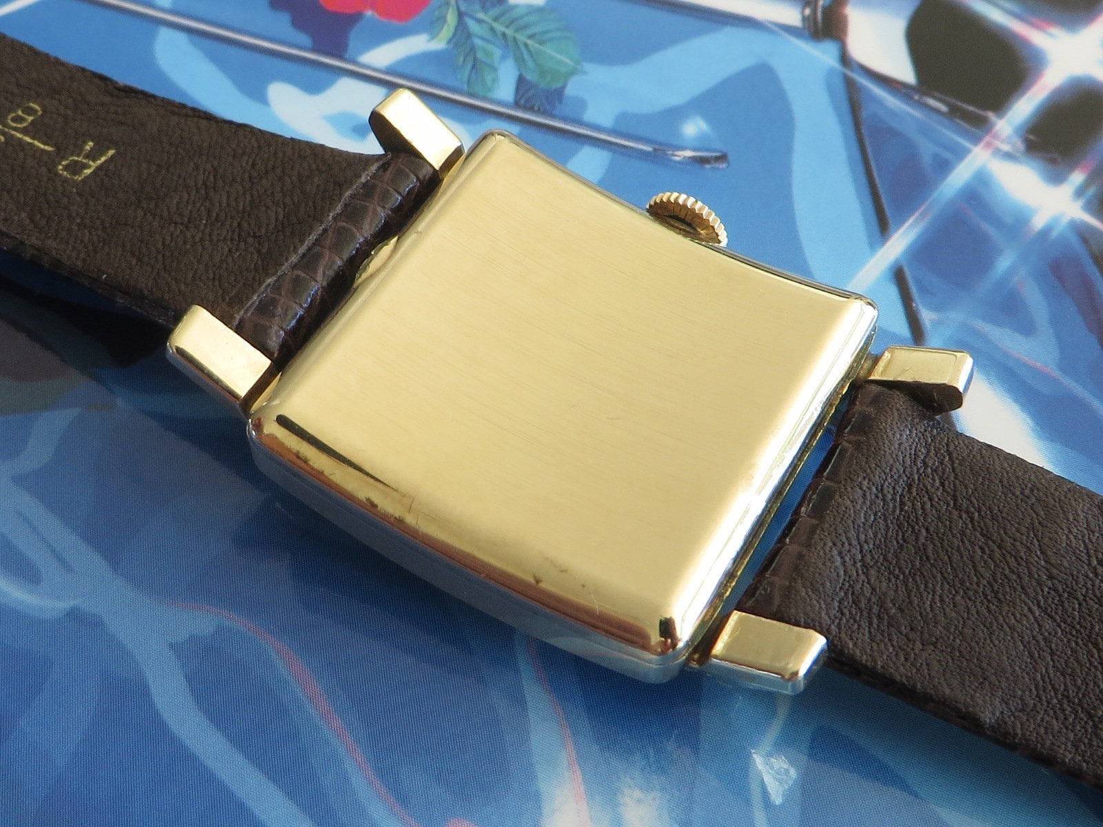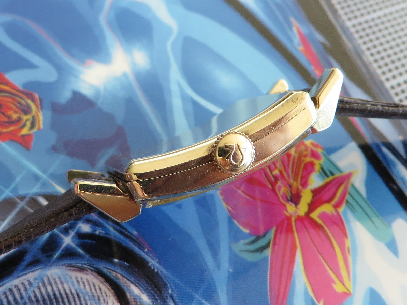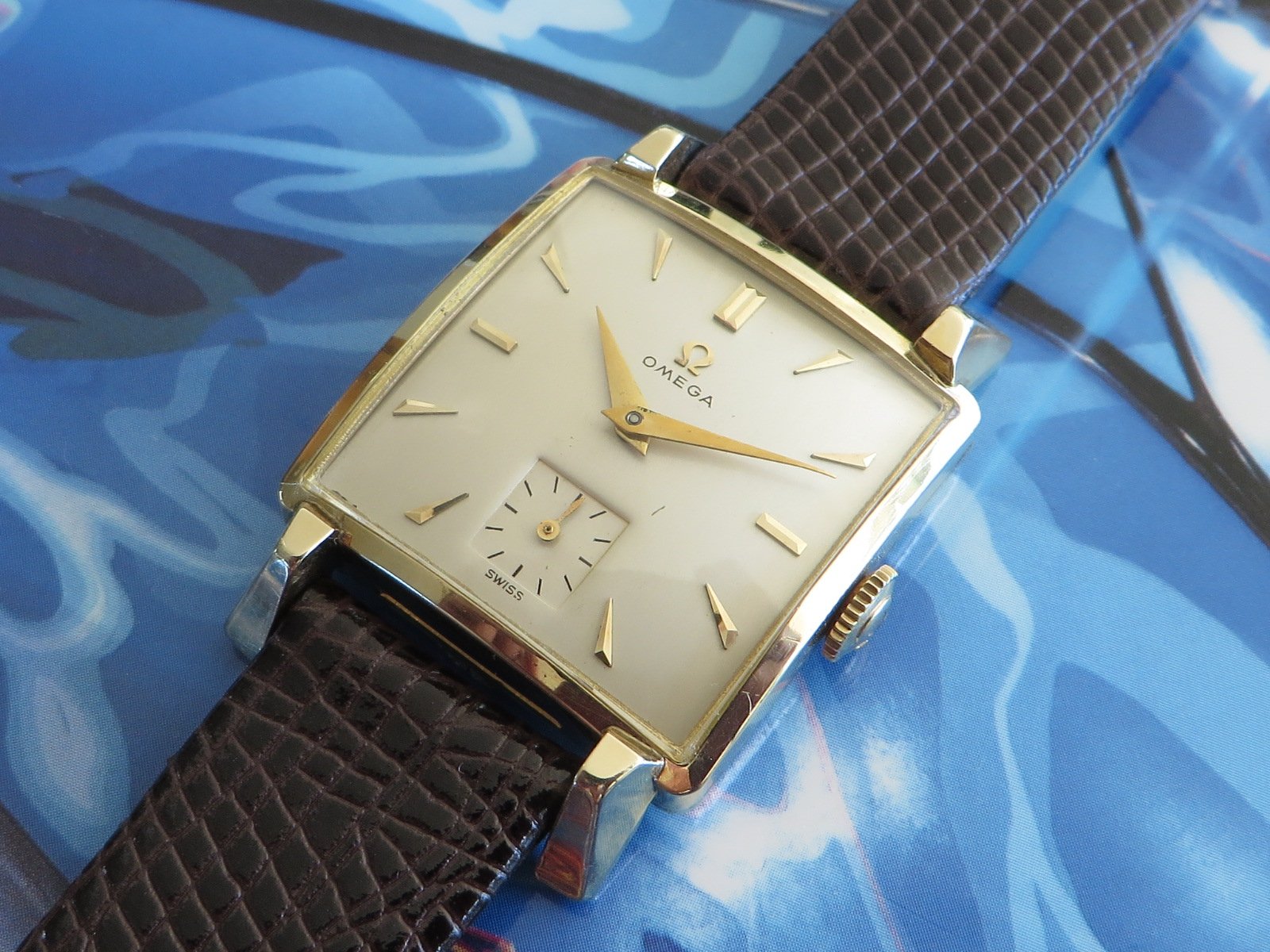 路路Vintage Omega AficionadoBeautiful reference N-6259 extra fancy curved back (think Gruen Curvex) 14K yellow gold-filled dress watch with double arched top and multi-faceted lugs. Nice crisp edges and the glass crystal is free of cracks or chips. Fitted with a vintage JB Champion lizard calf strap and includes the original red Omega box.