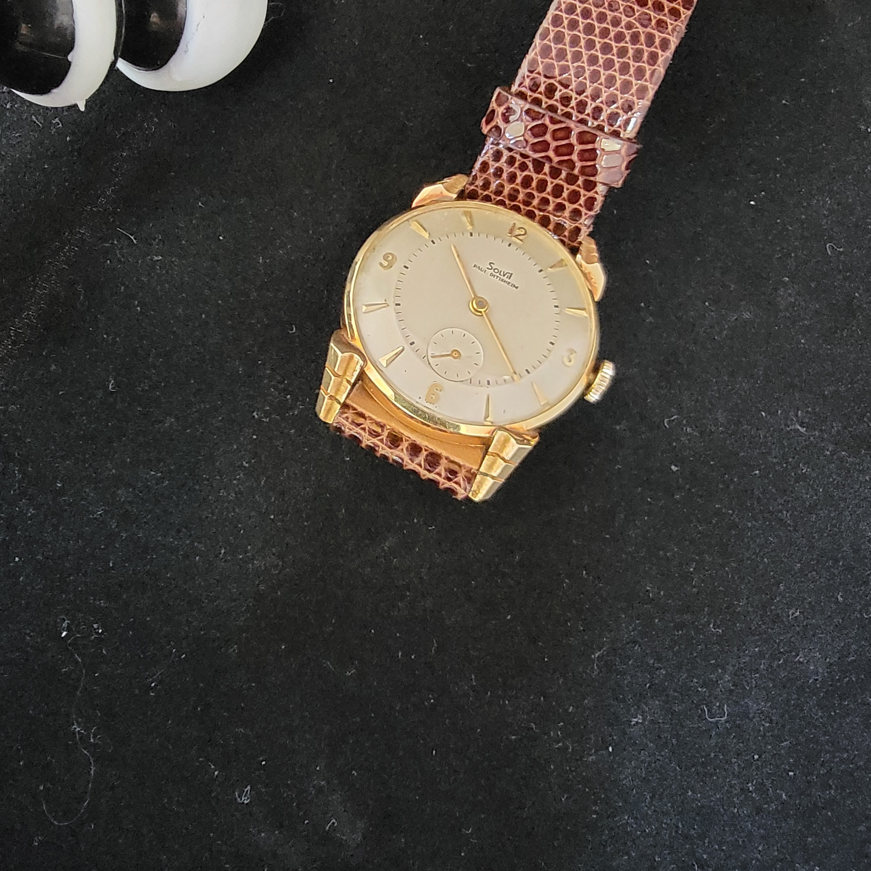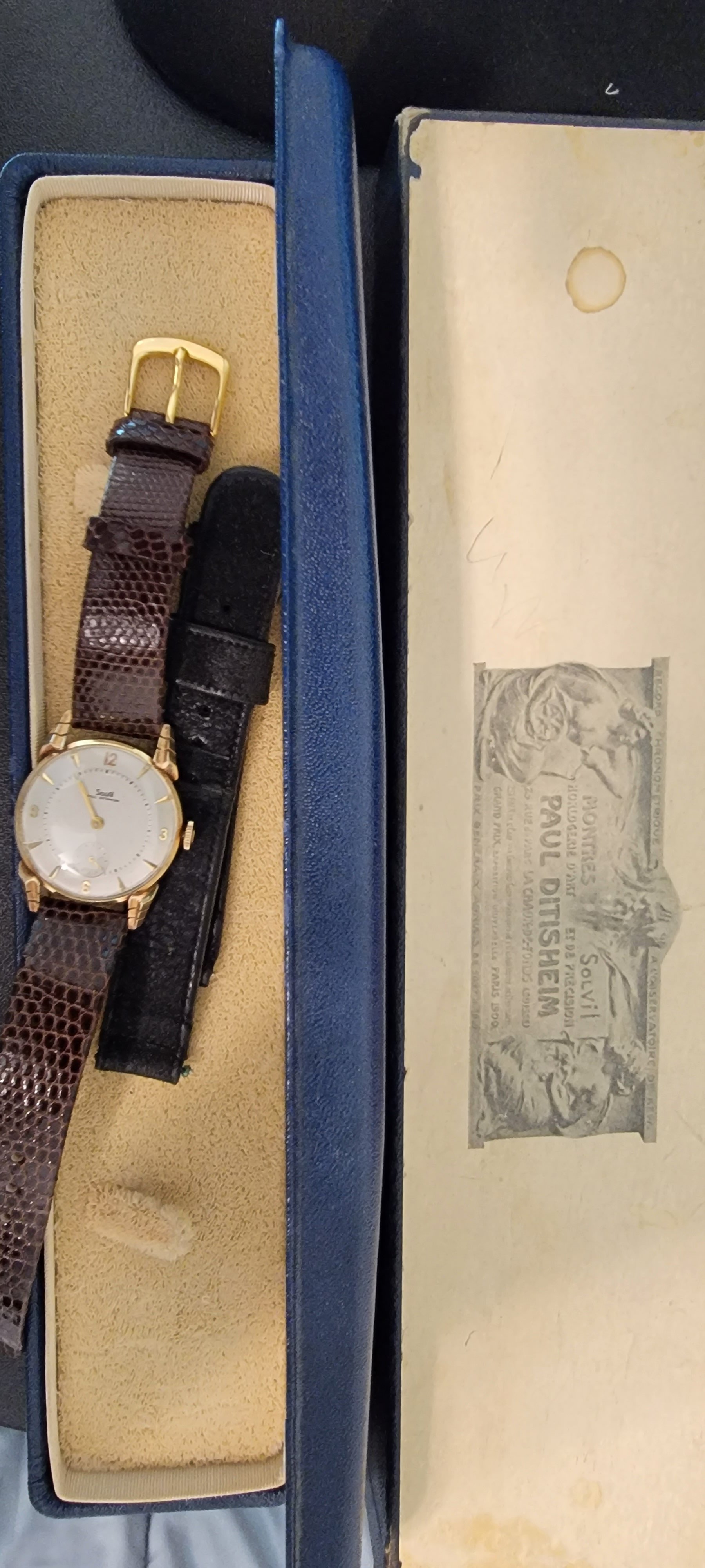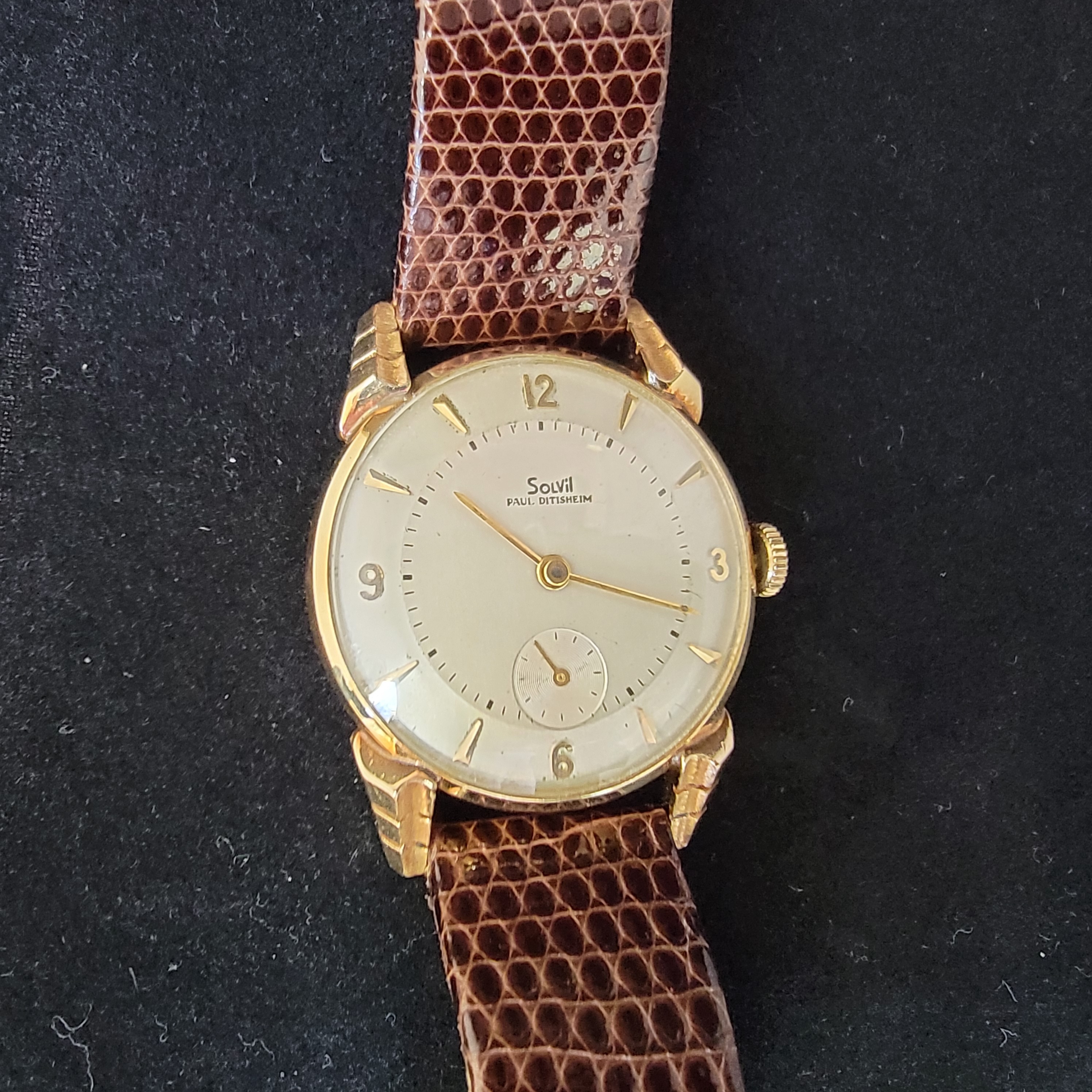 ·70+ yr old 14k solid gold Solvil Paul Ditisheim with original inner and outer boxes and strap. Probably no one at your watch gtg will have this one.
