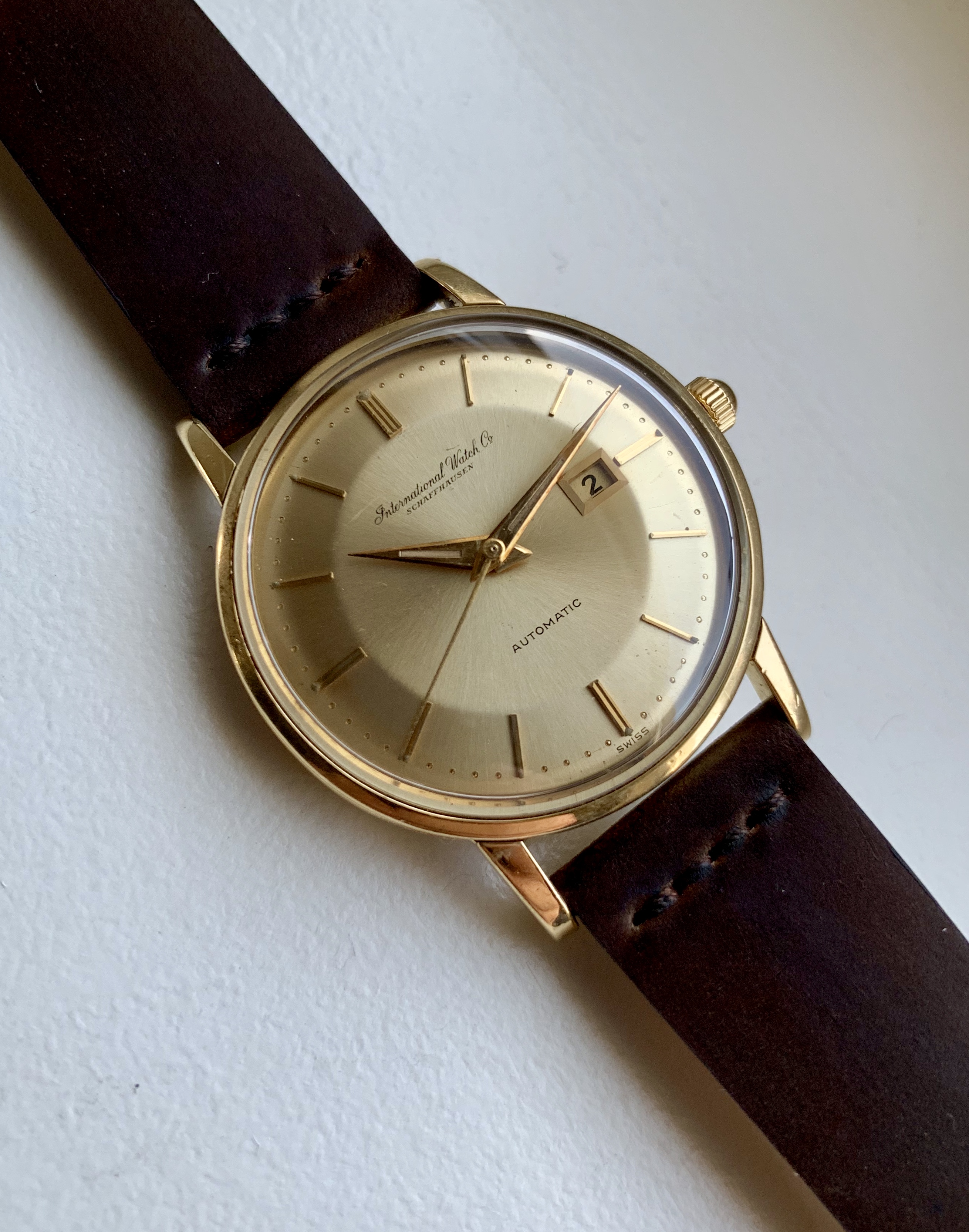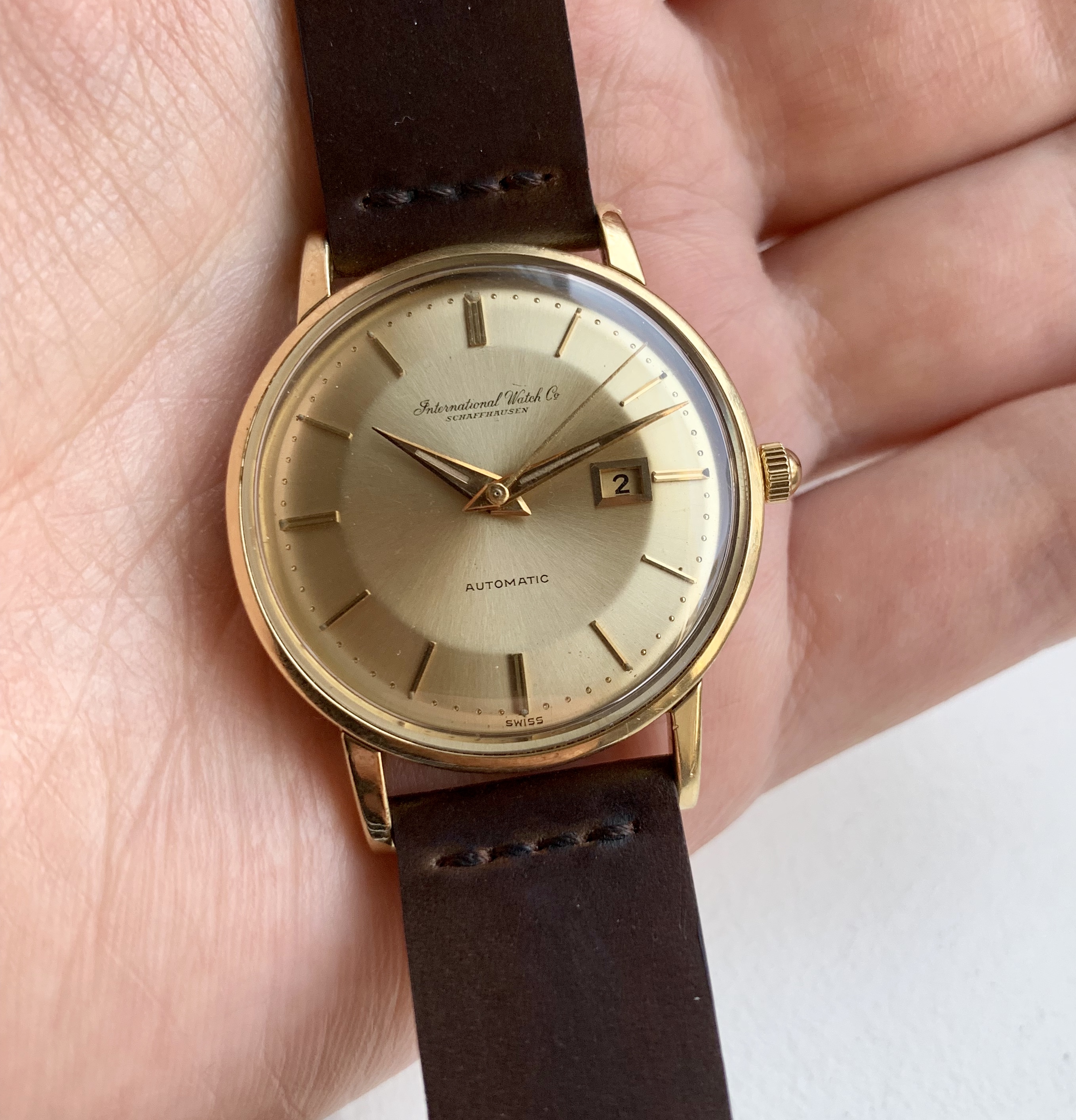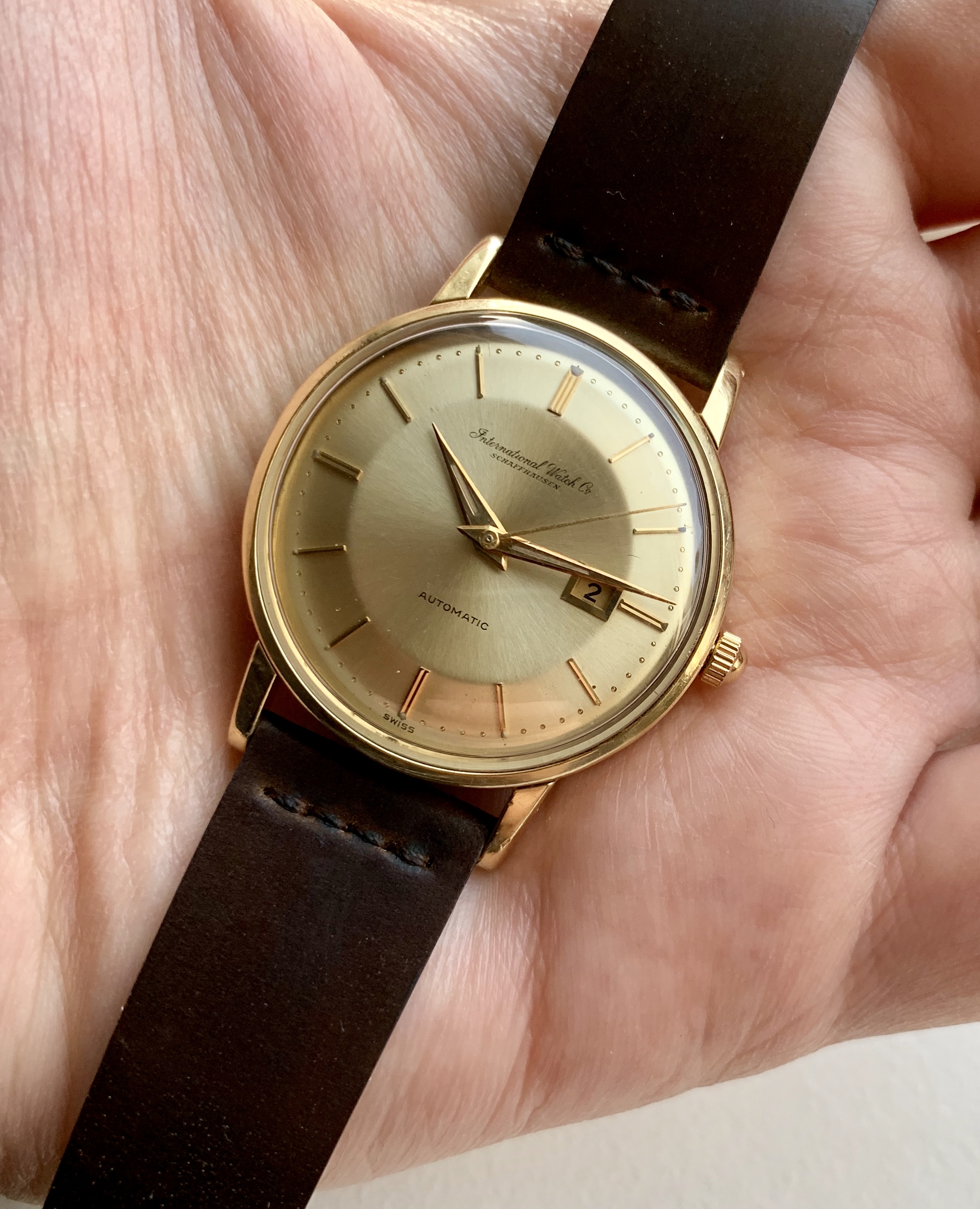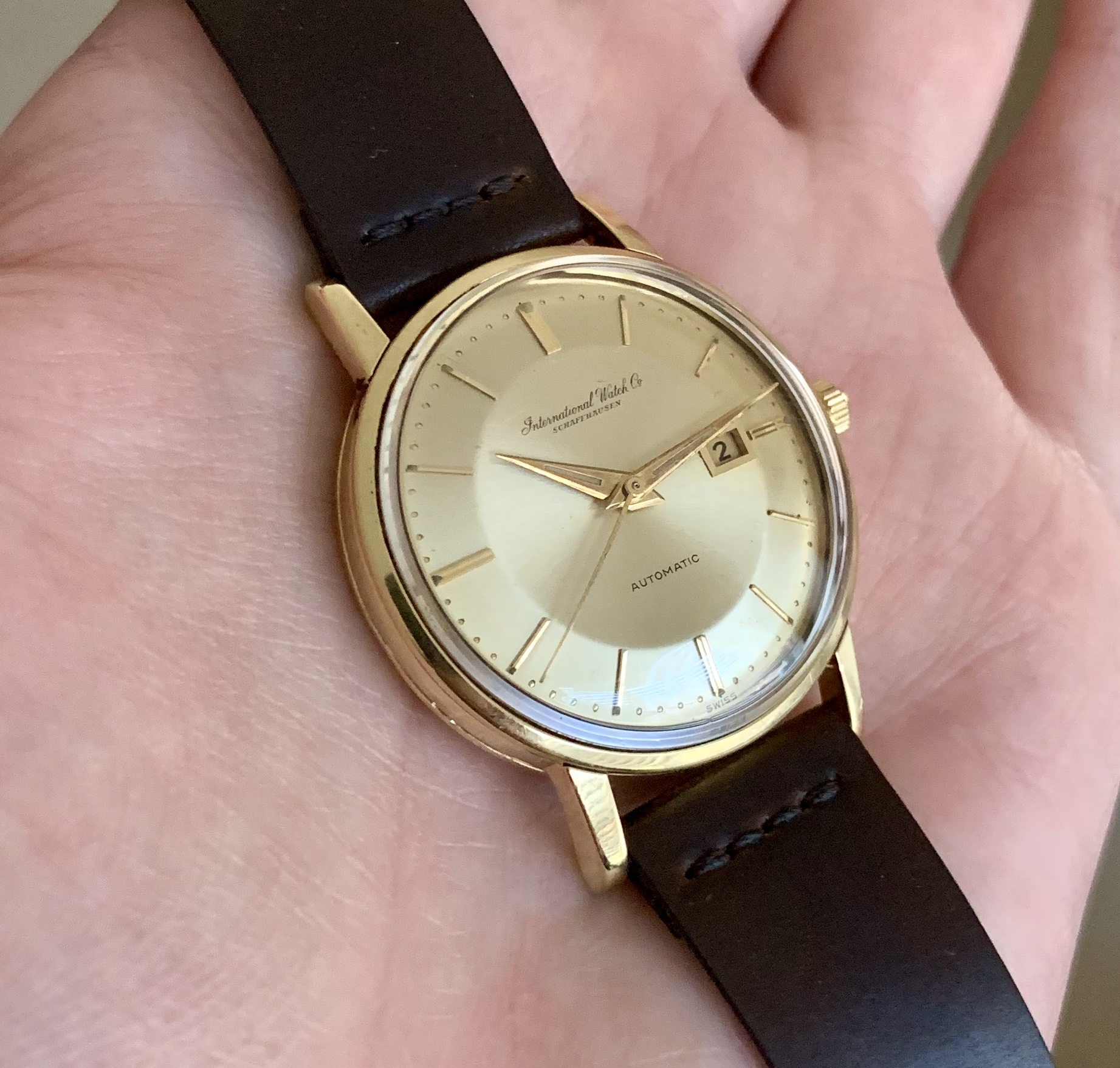 The watch features IWC’s version of a ‘pie-pan’ dial, which based on my research is less common than the pie-pan dials on Omega Constellation models. The dial on this particular model might be solid gold - I’m not sure if the solid gold dials were limited to the De Luxe lineup. The sunburst dial is in well preserved condition. Original dauphine style hands with lume intact. The second hand appears to be a replacement.