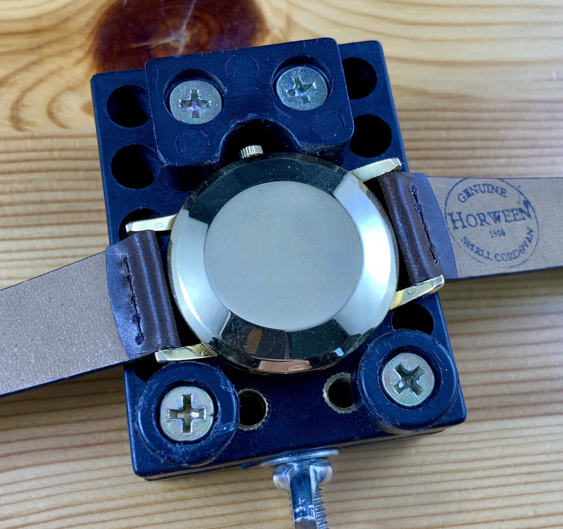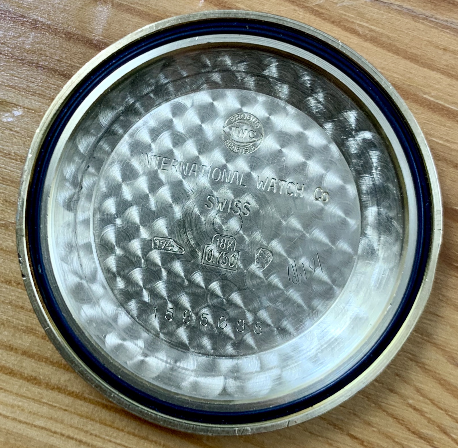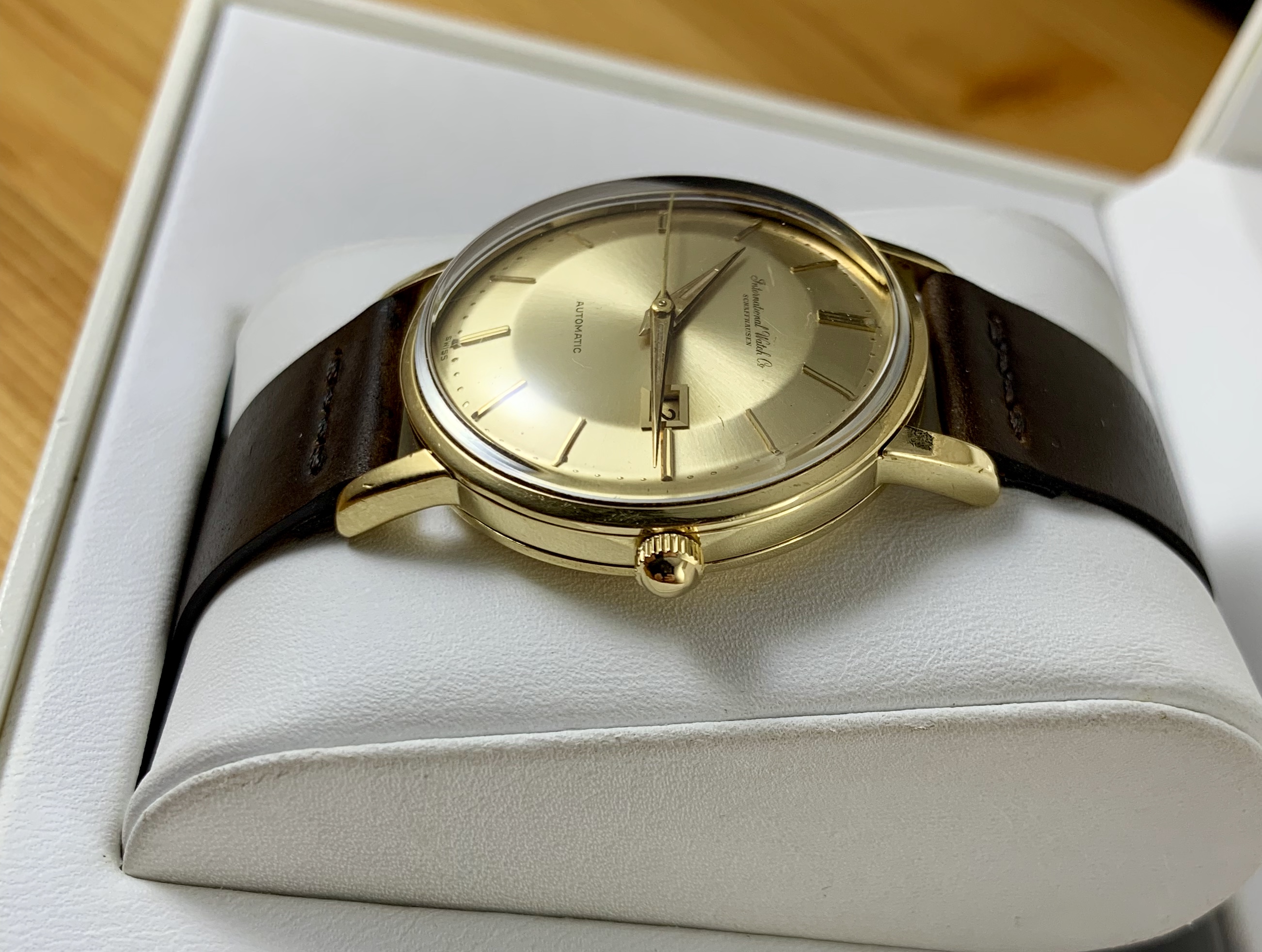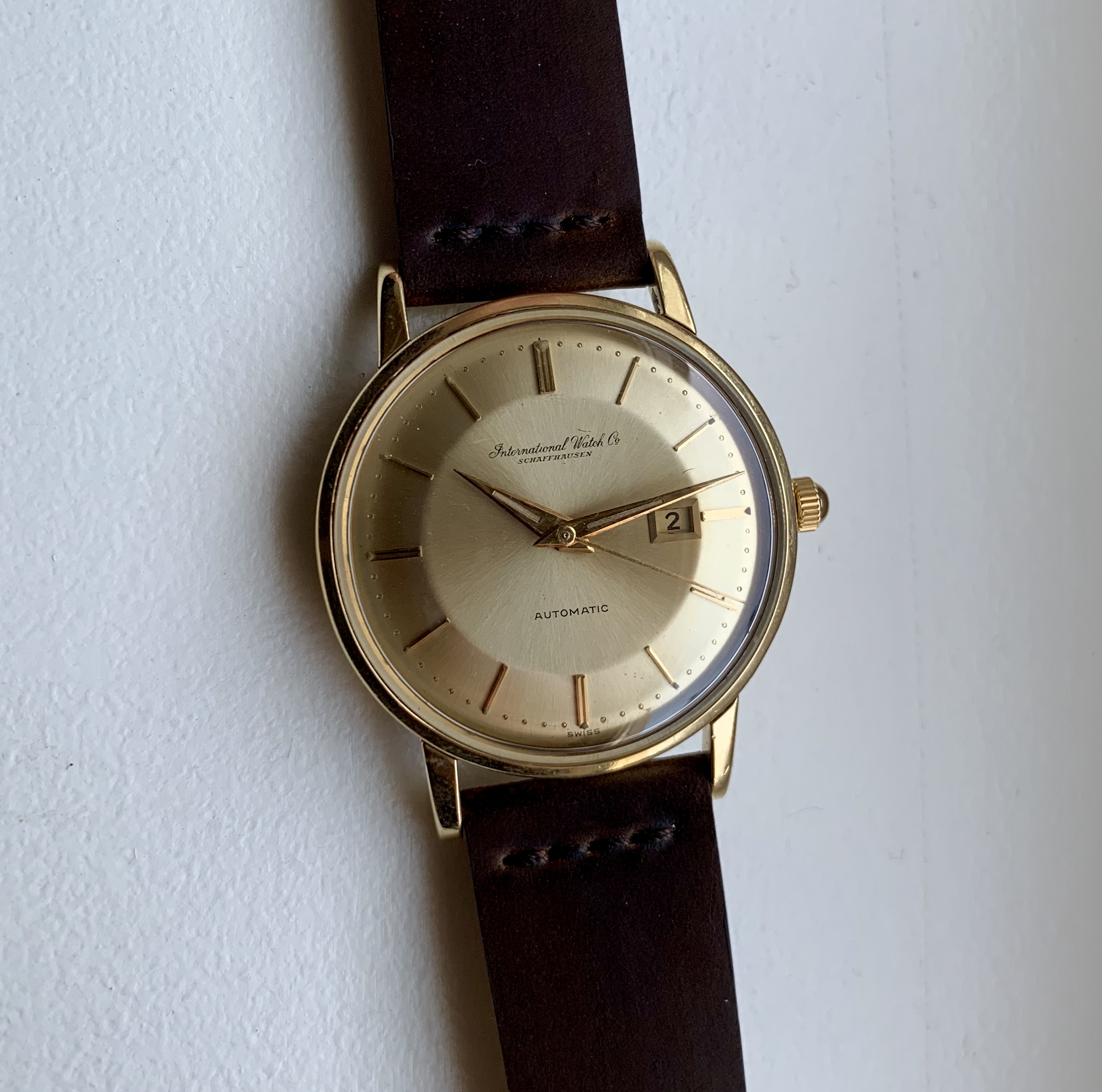 The watch features IWC’s version of a ‘pie-pan’ dial, which based on my research is less common than the pie-pan dials on Omega Constellation models. The dial on this particular model might be solid gold - I’m not sure if the solid gold dials were limited to the De Luxe lineup. The sunburst dial is in well preserved condition. Original dauphine style hands with lume intact. The second hand appears to be a replacement.