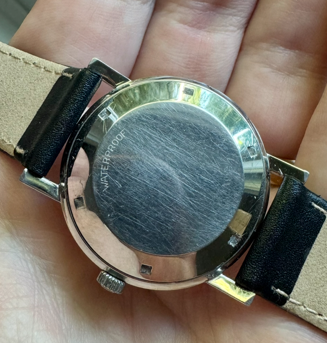 Inside is an automatic movement, most likely a cal. 2542PC. The case back is screwed on tight and I’d prefer not to risk scratching the case. I had the watch serviced in 2018, and it continues to keep time.