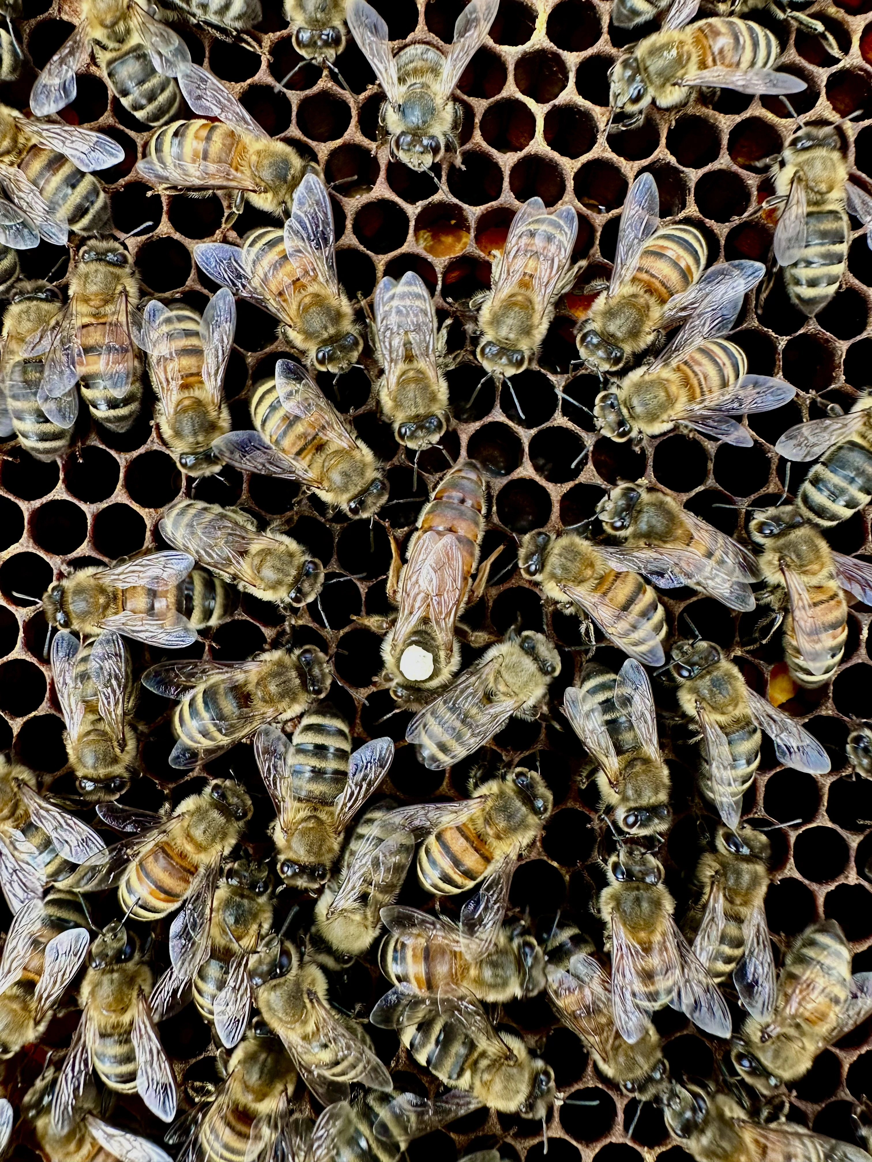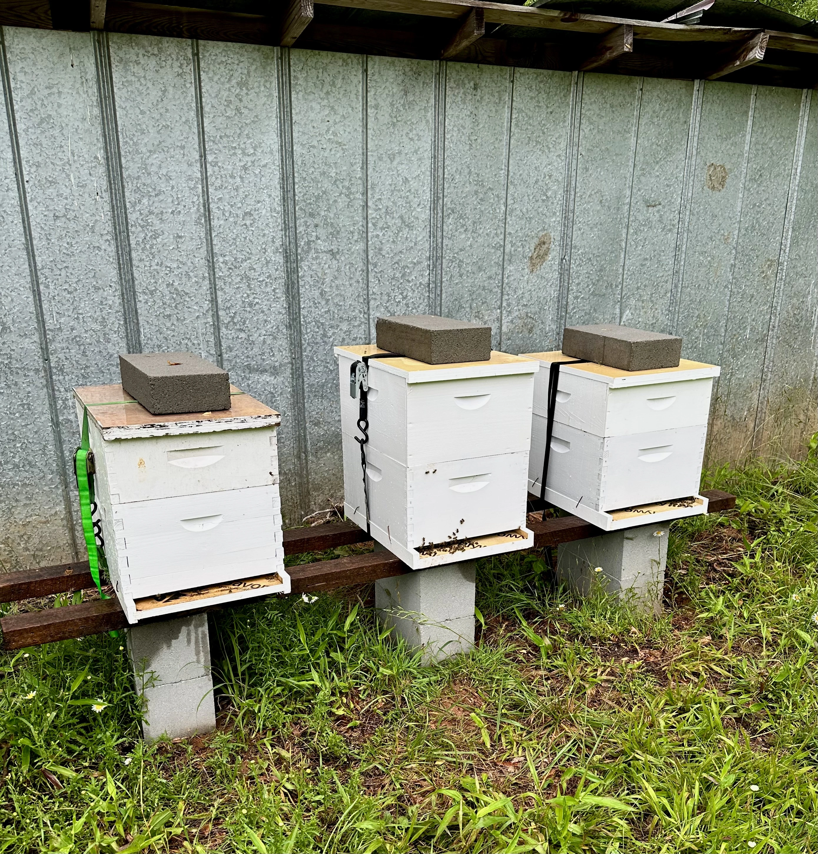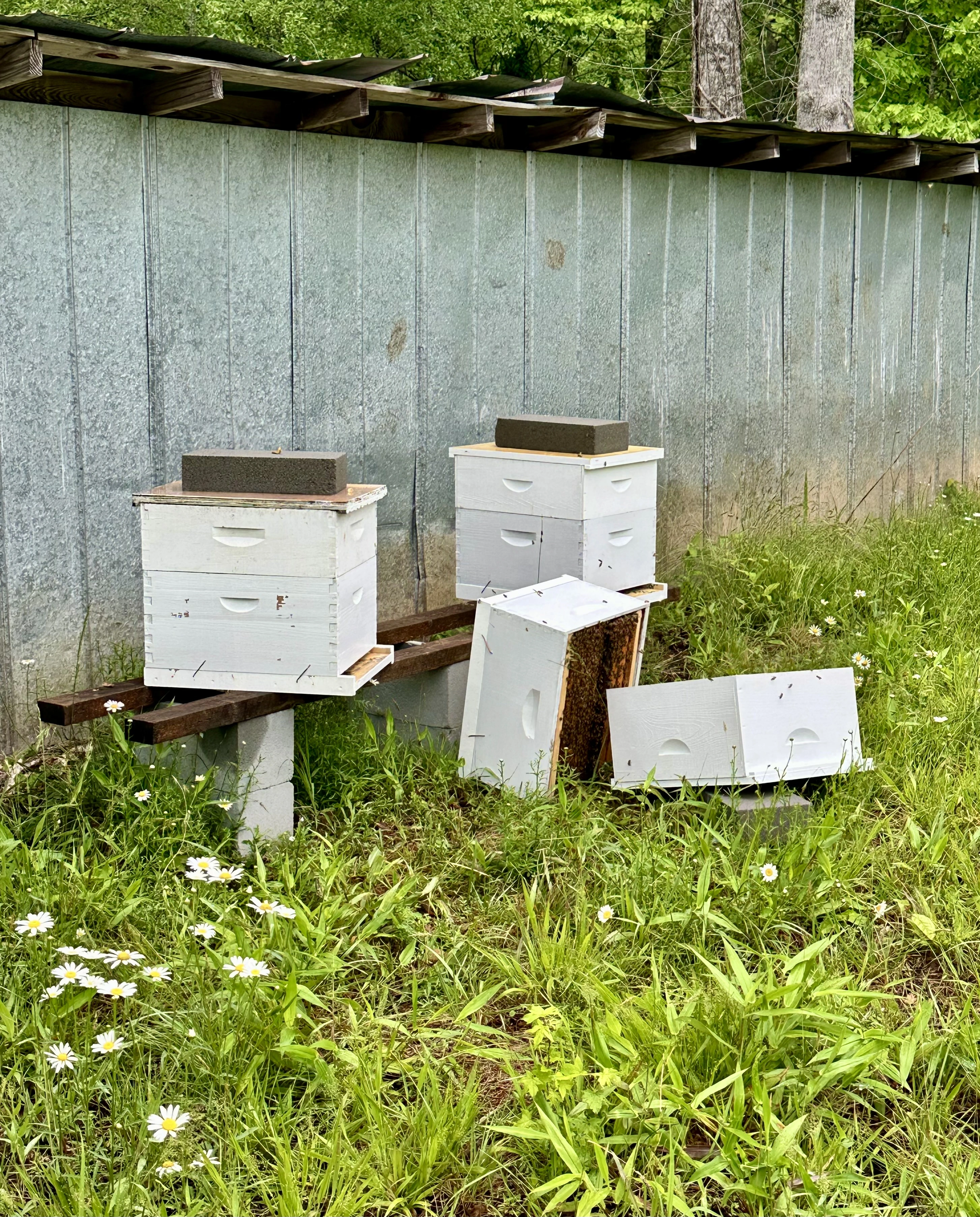 Honey bees are a new adventure for the Mrs and me. The queens are producing much brood and there is some capped honey. A bear turned over one of my hives last weekend. Luckily, the racks and brood were left unharmed. I reset the hive last Sunday, strapping them together to prevent them coming apart. I’ll work them today, check their status, and make sure my queen is still ok.