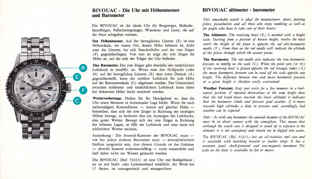 The Favre-Leuba Bivouac Ref. 53203 was launched in 1962 and was the first wrist watch with Altimeter / Barometer function.