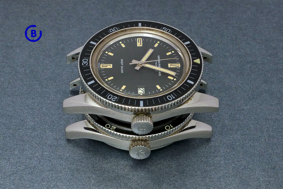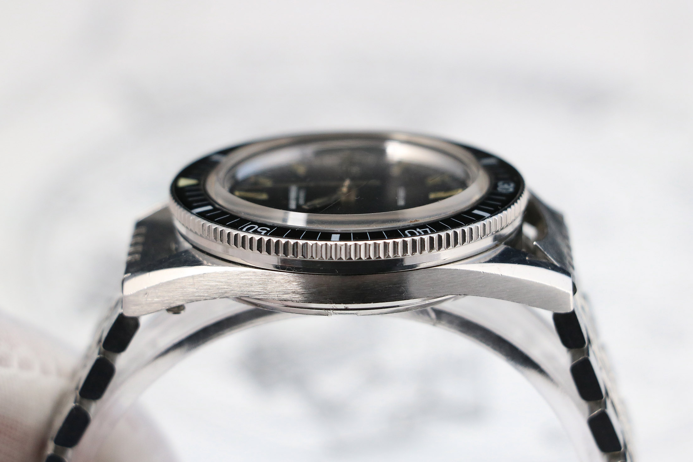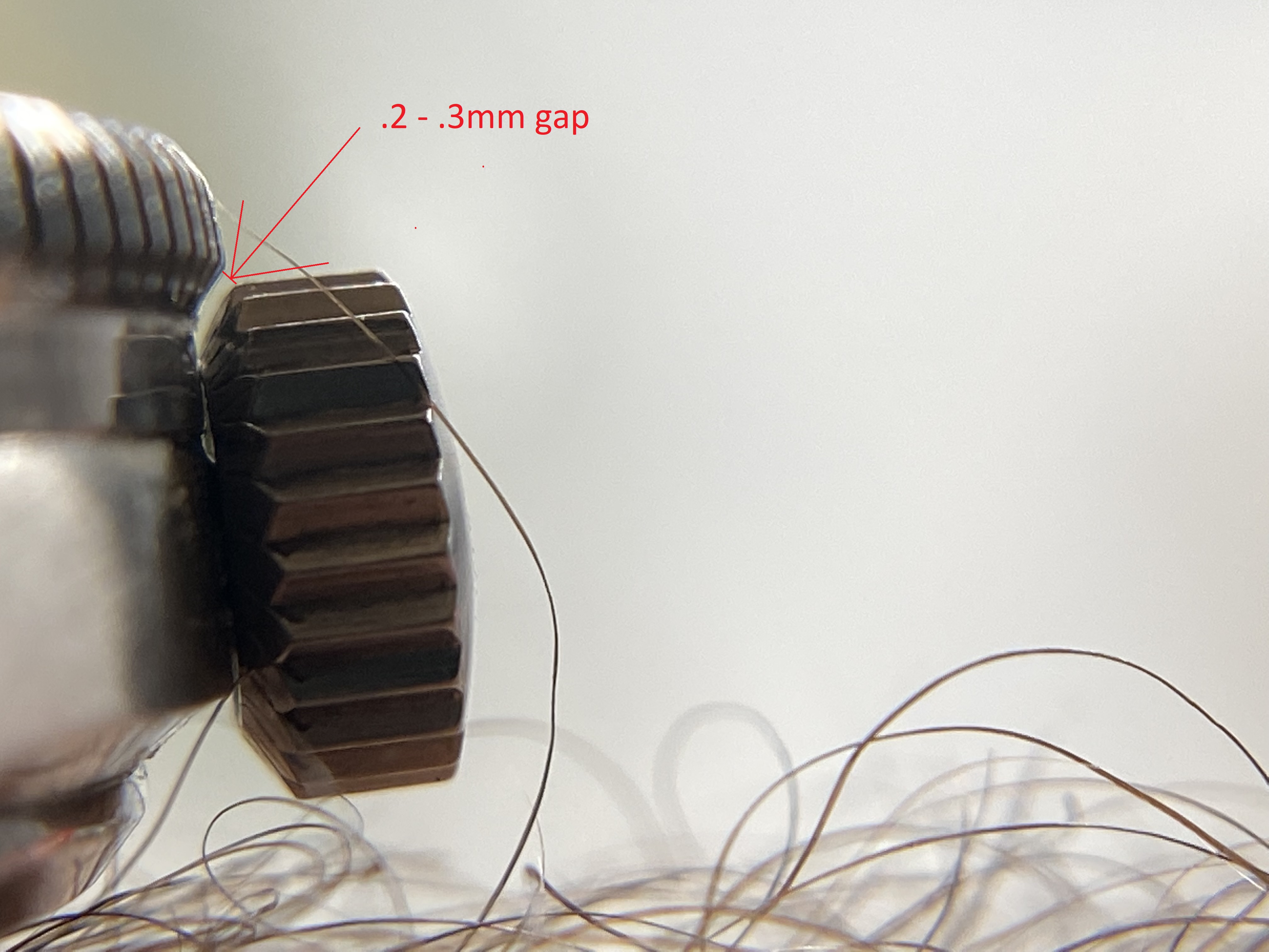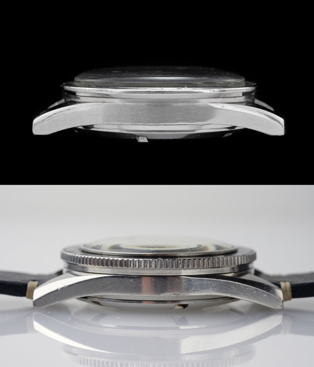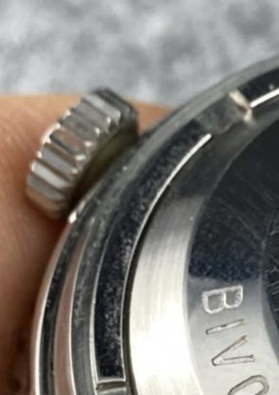 3. crown to bezel gap .2-.3mm. This is an important dimension as these watches have crowns that are very tightly fitted and must have enough clearance off of the midcase to clear the bezel teeth. As you can see, this is a very tight little gap. a .3mm business card can be pushed into the gap with some pressure required due to friction.