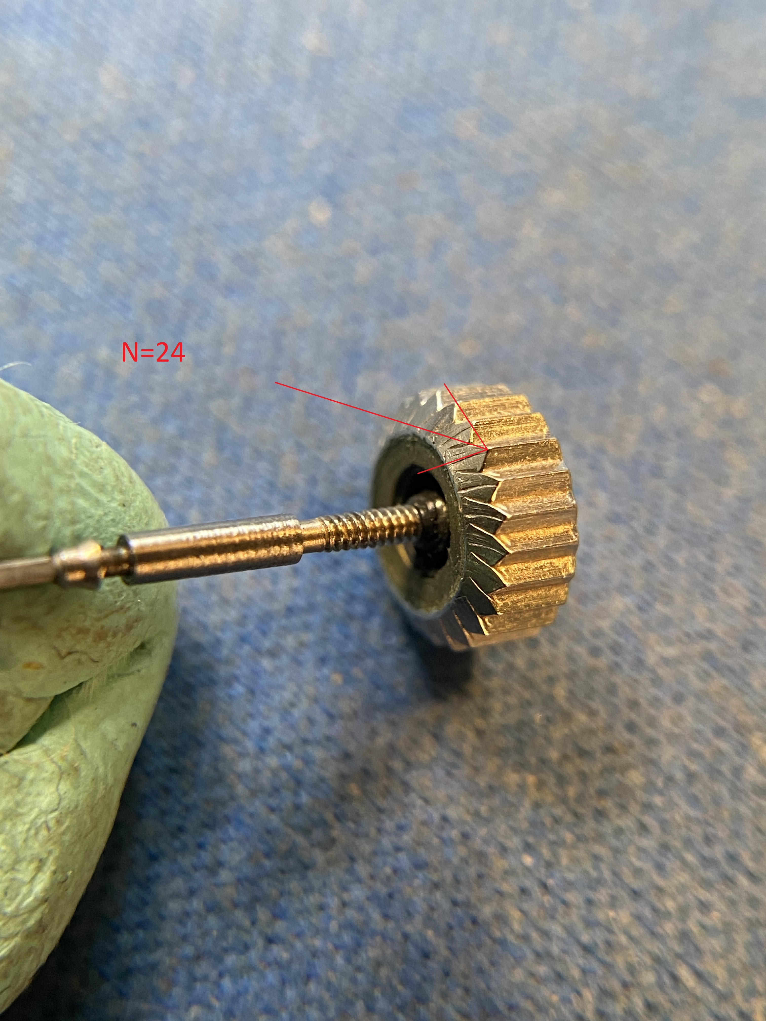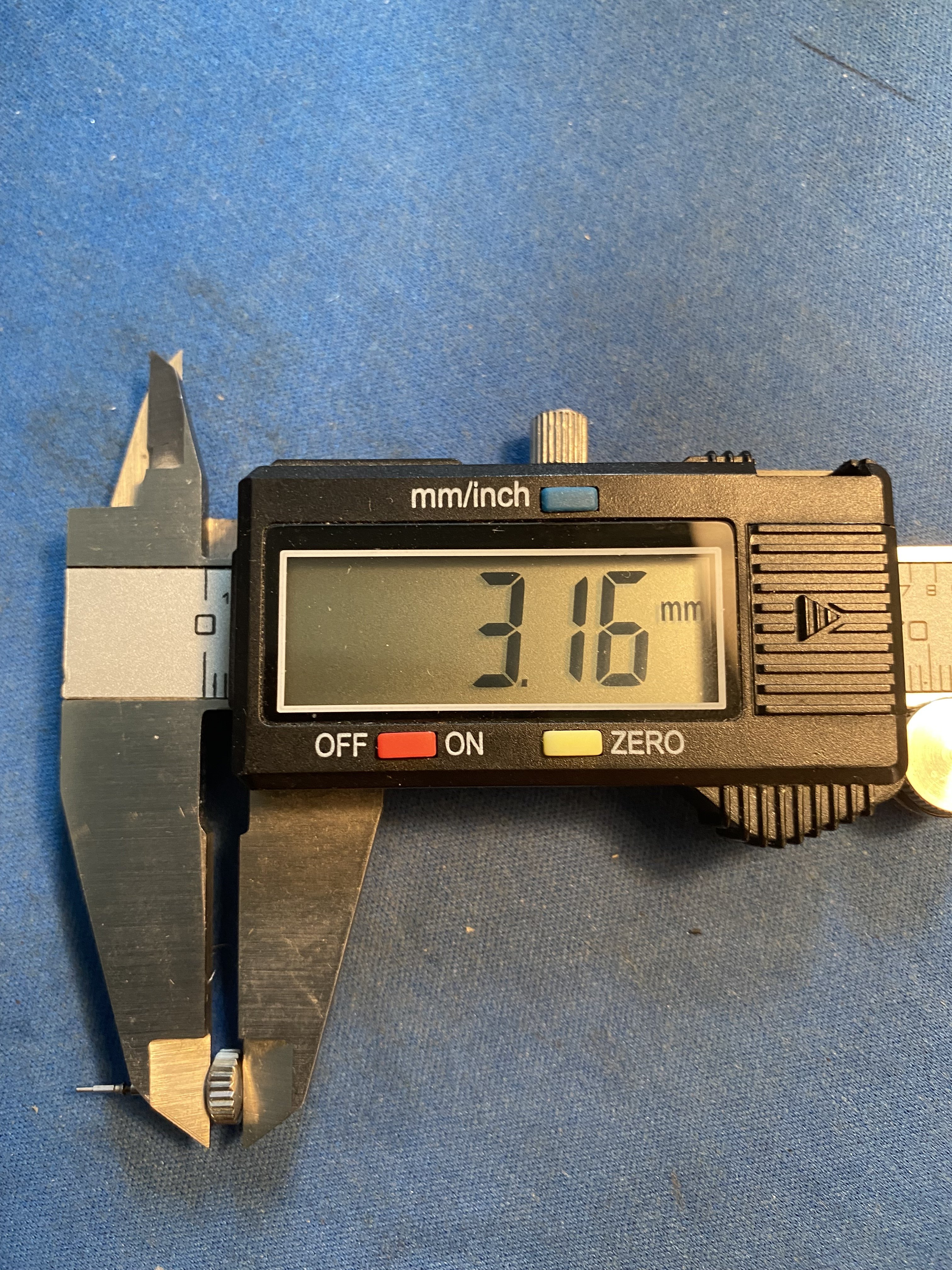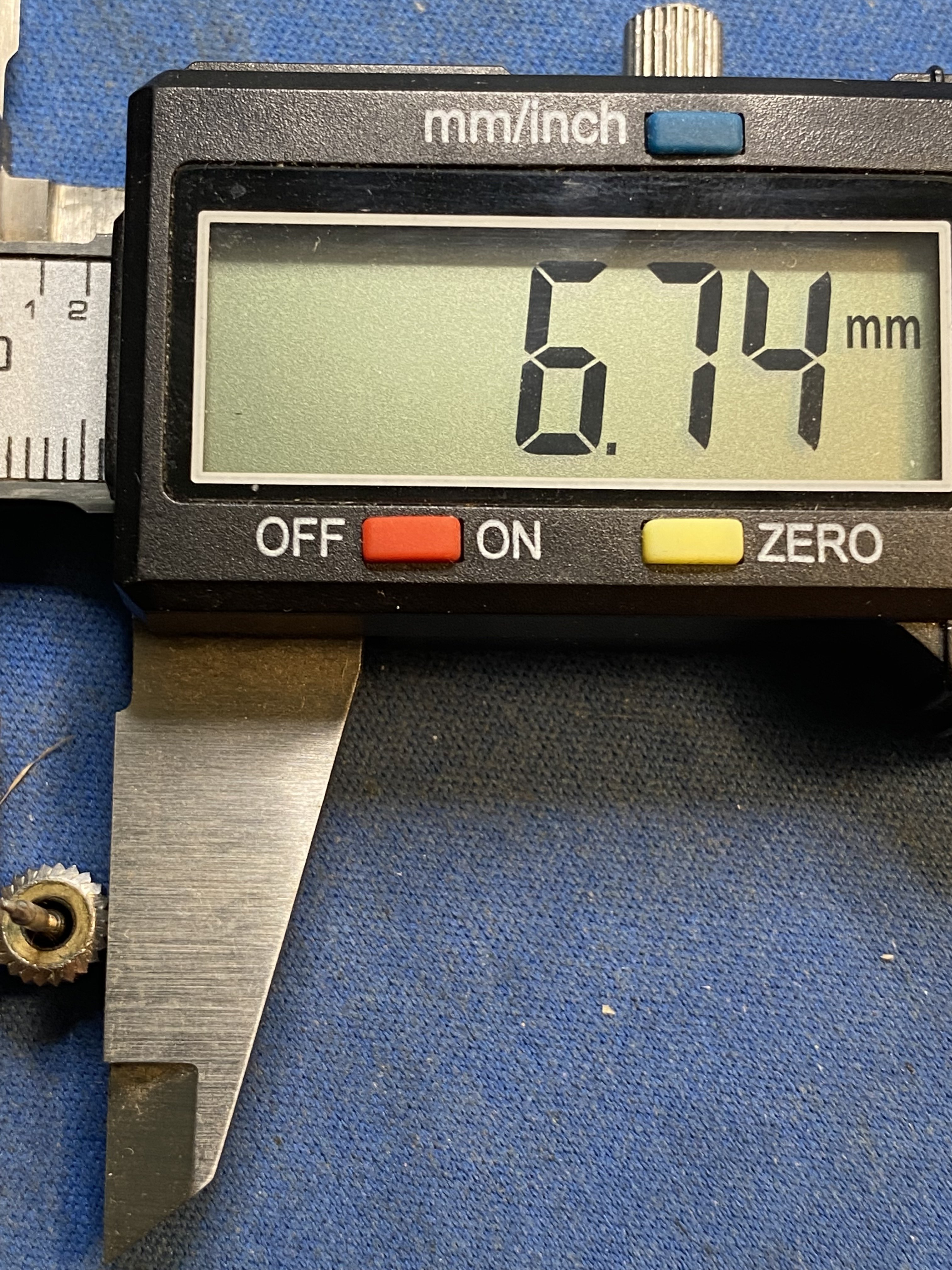 I think this is the original crown. Please note that it may appear off center while in the jaws of the micrometer, and this is due to the camera/view angle. I corrected for anything off center and gave an average number based on at least 5 readings for each dimension. Still, all dimensions must be considered approximations. Probably accurate to within plus or minus .05-.1 mm