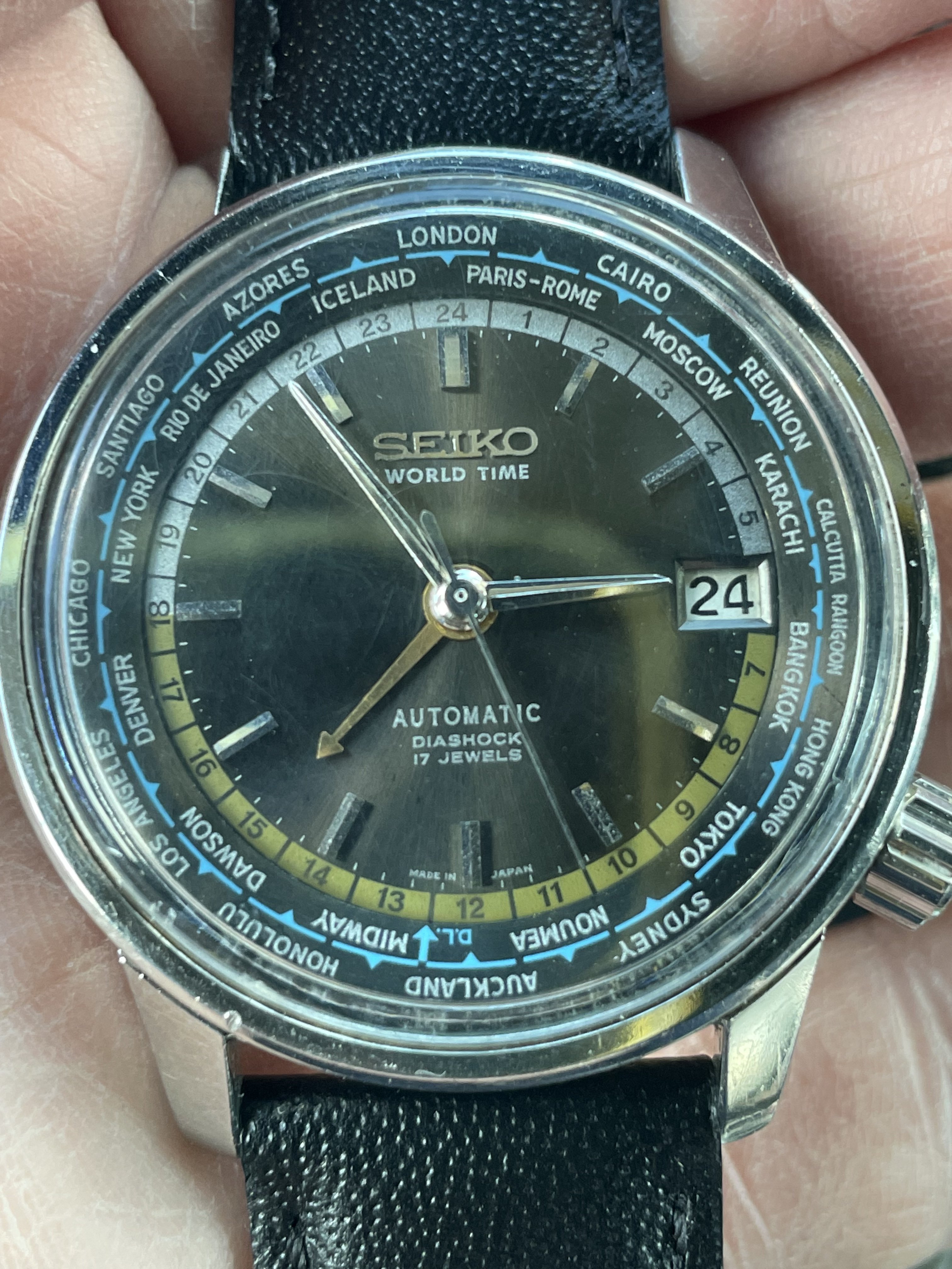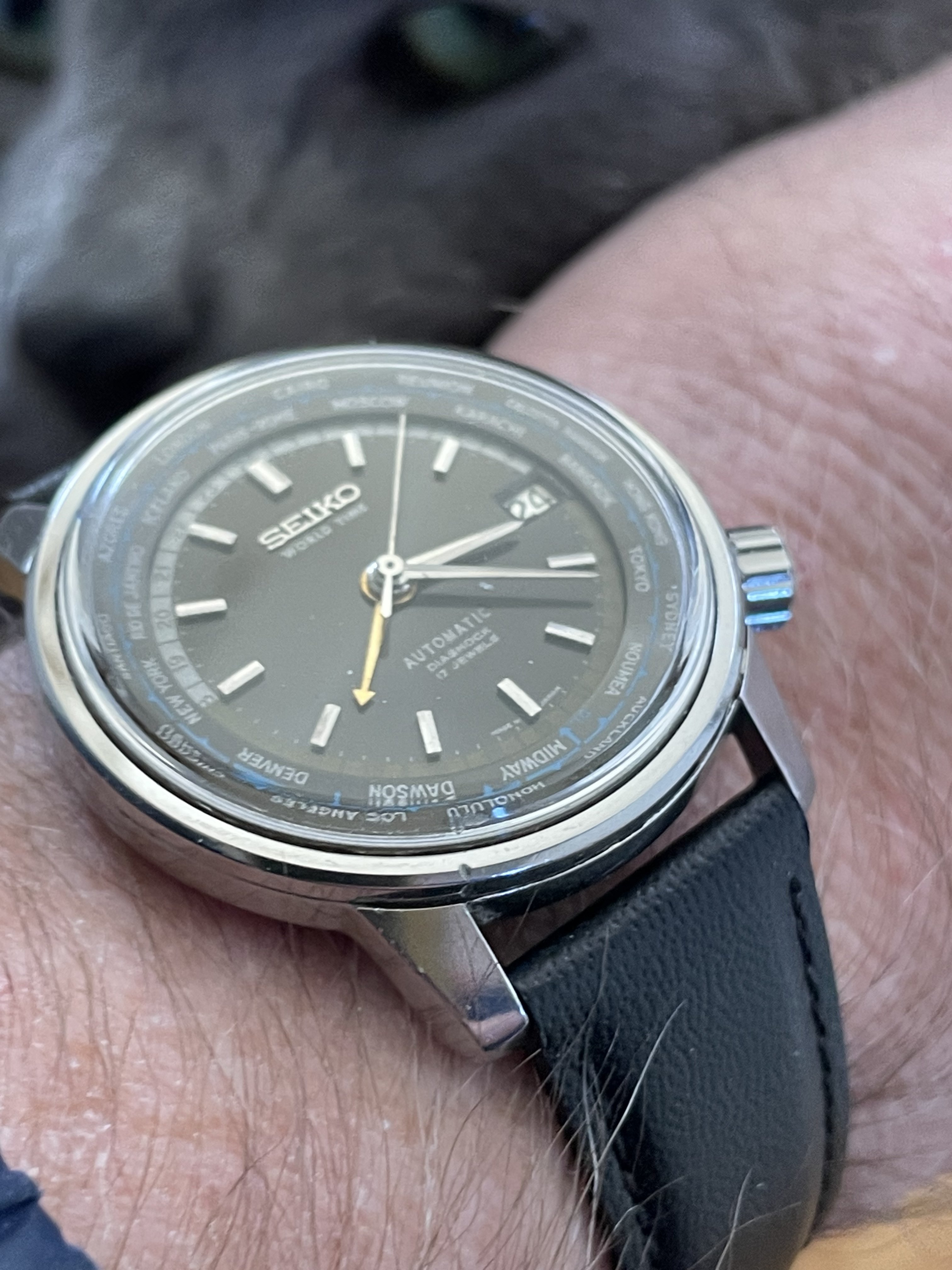 Well the whole “fed ex lost my package” is now moot. Bought a nice world timer off a nice gentleman here. Actually arrived early via USPS. So we went from tragedy pending to tragedy narrowly averted. I will be wearing this if not this weekend to work all next week as for a few reasons, although this is not a very special expensive watch, it had some meaning to me. So alas, a world timer has landed at the Walrus residence