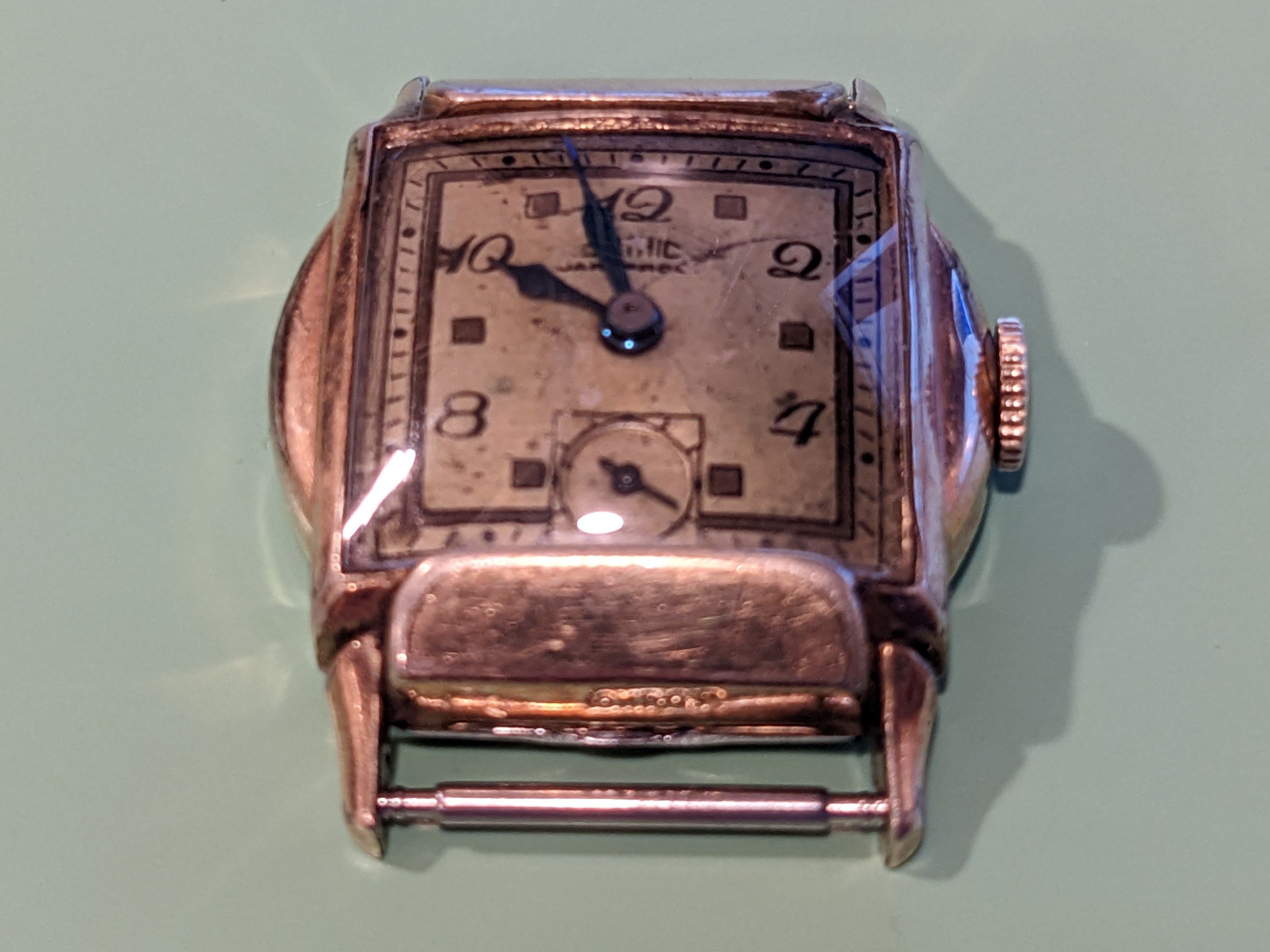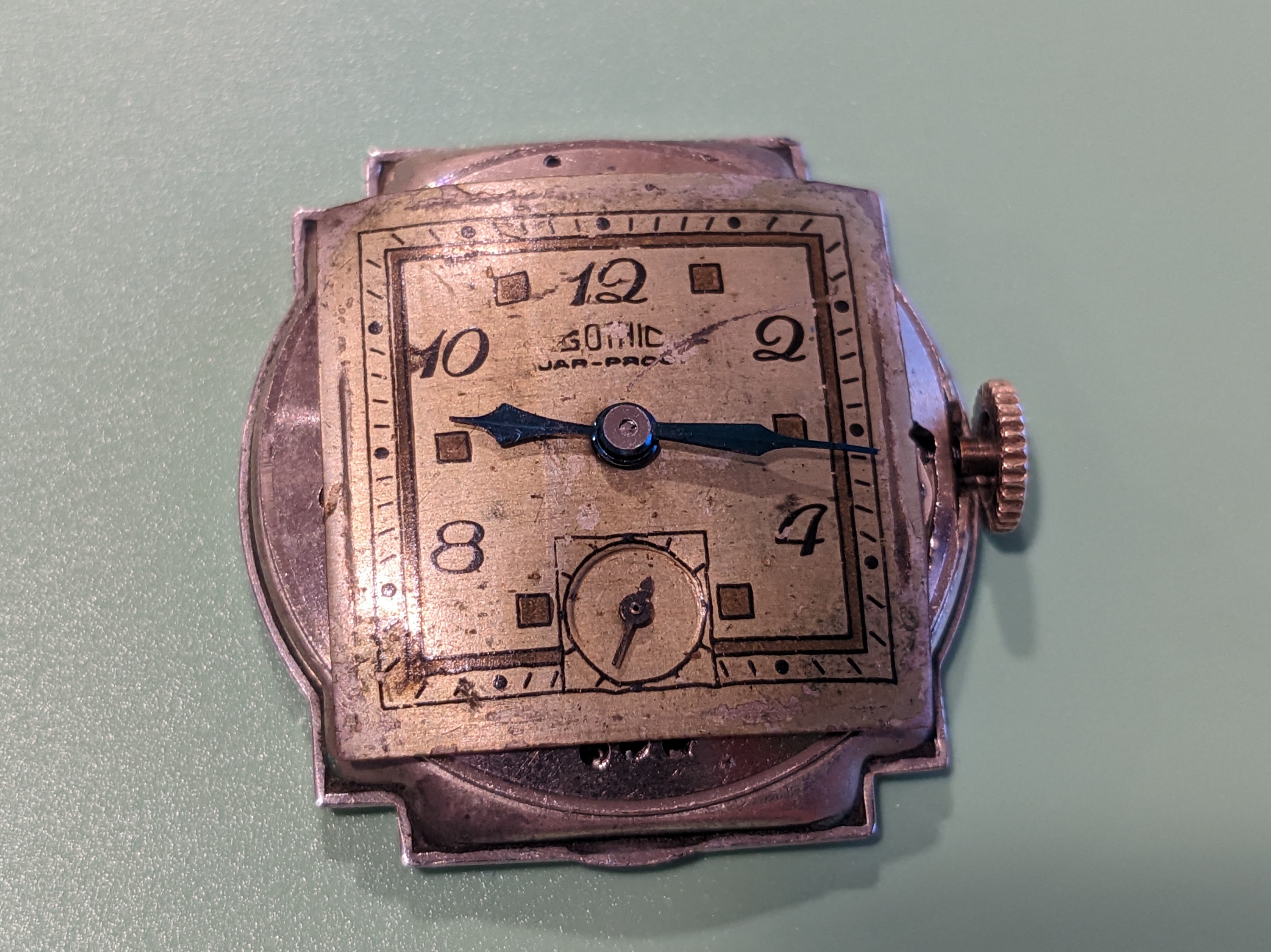 ·Bought this as a non-runner to harvest the bracelet. Cleaned and lubed the keyless works and it started running. Seconds hand was missing, so I added a black one from my stash. Dial washer is missing.
