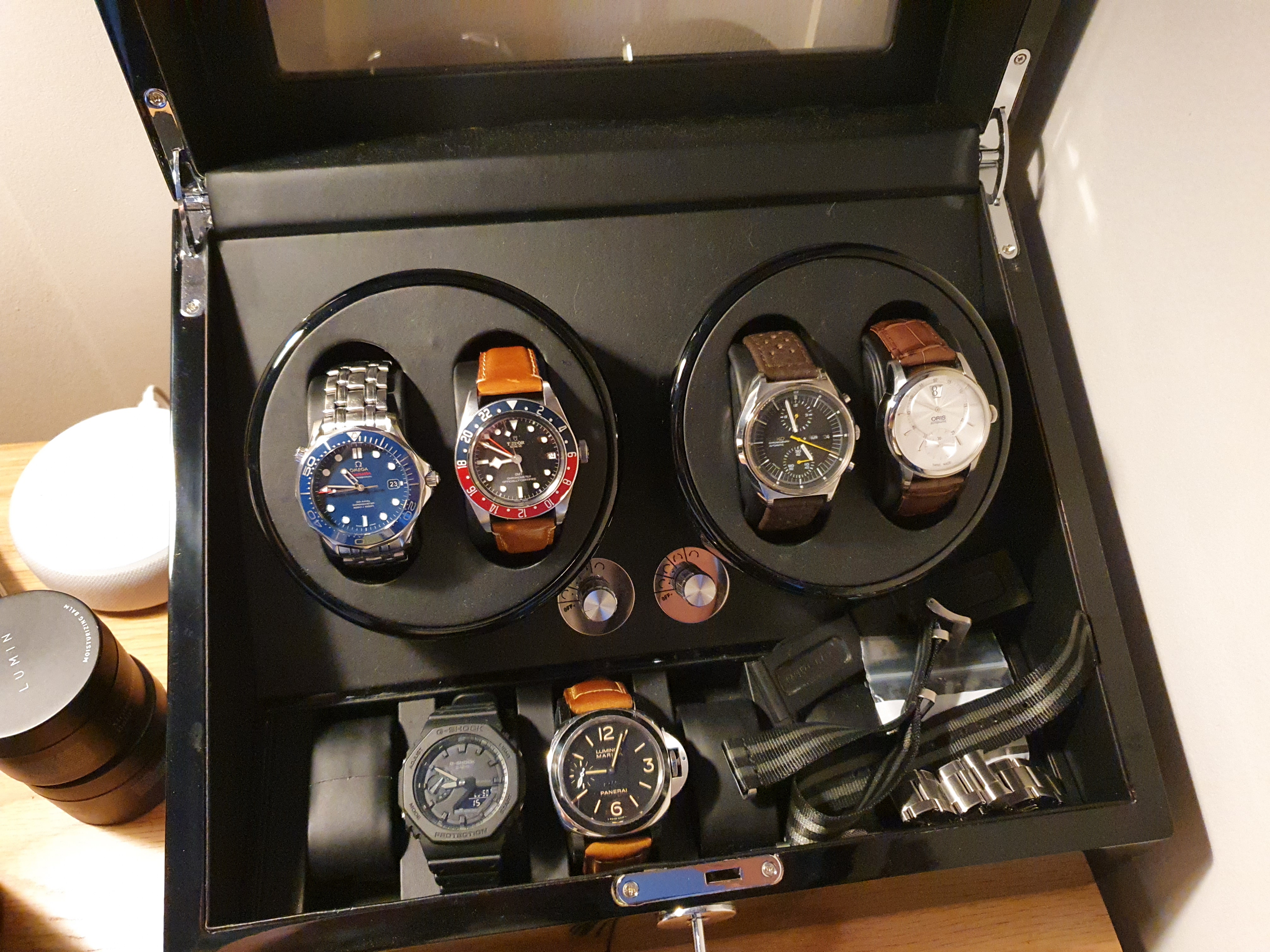 After 7 years of collecting I have today filled the 4 winding spots on my winder, with some other manual or quartz pieces in the box. The 4th was an Oris Jumping Hour gifted from my fiance to celebrate our engagement.