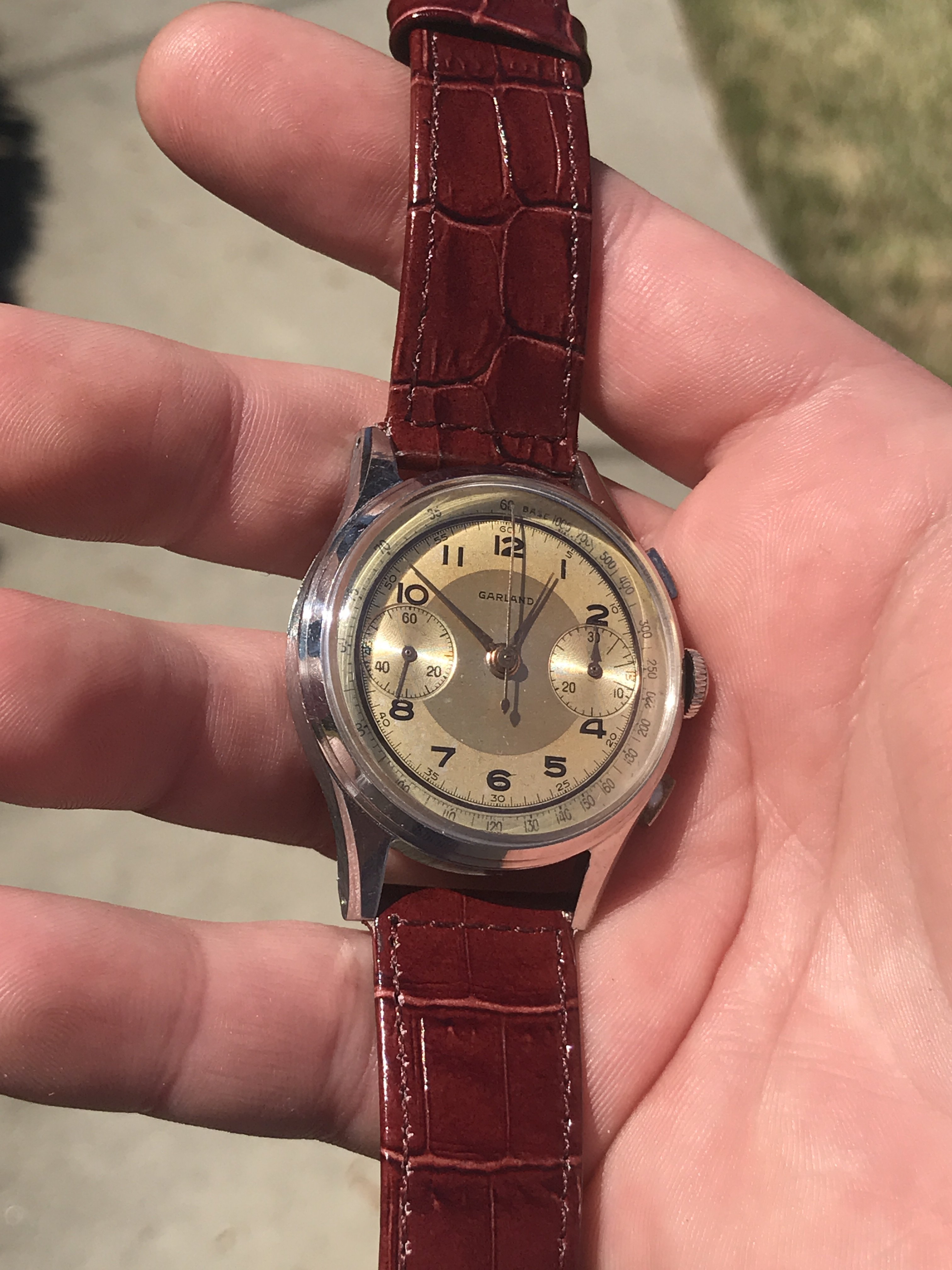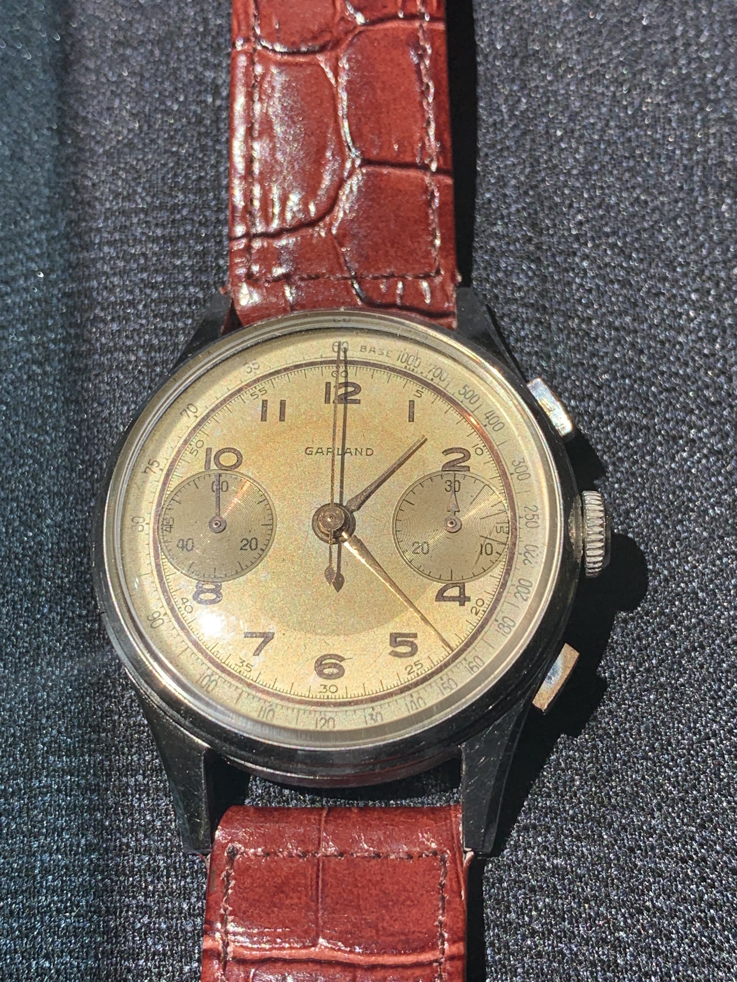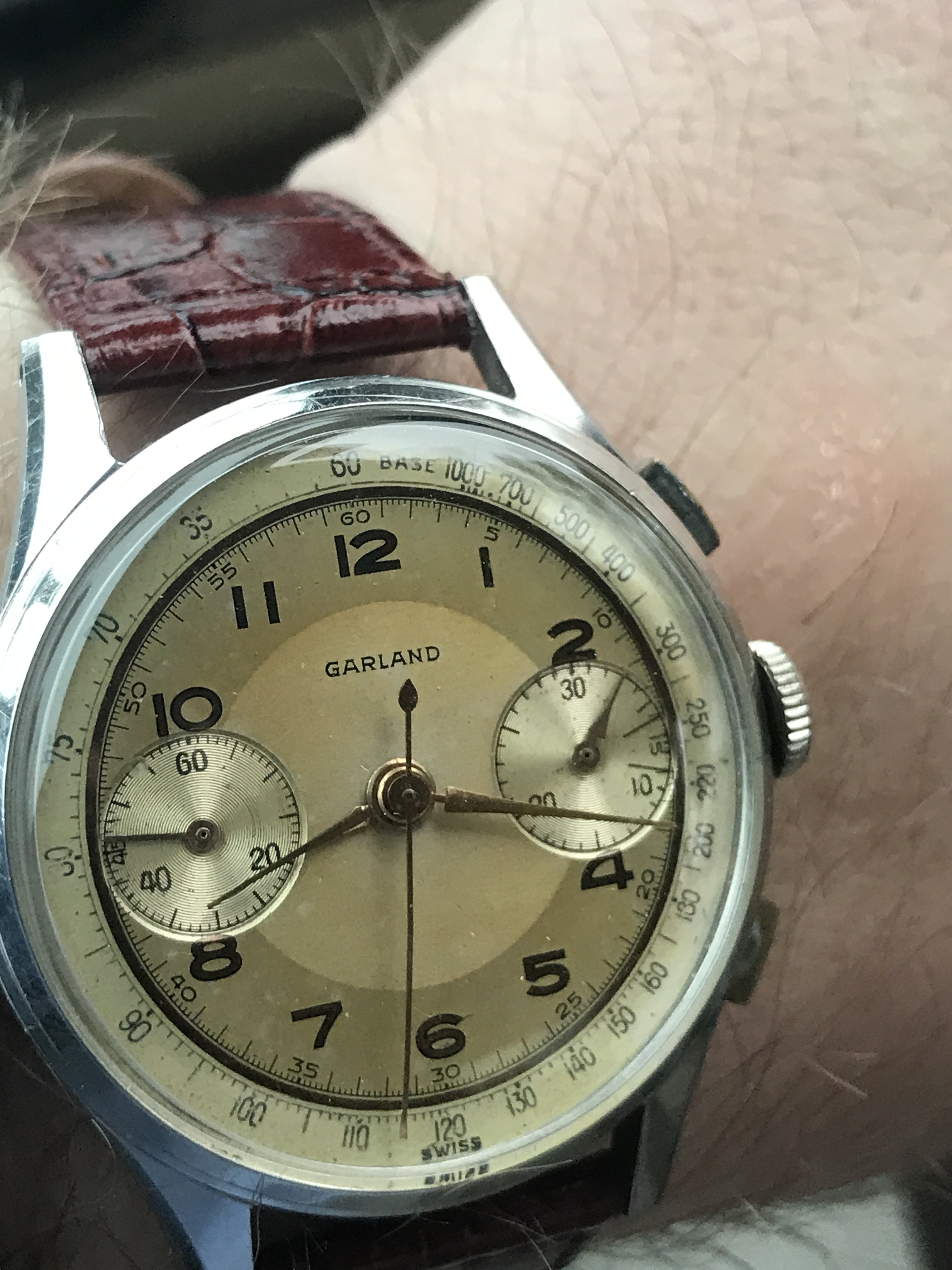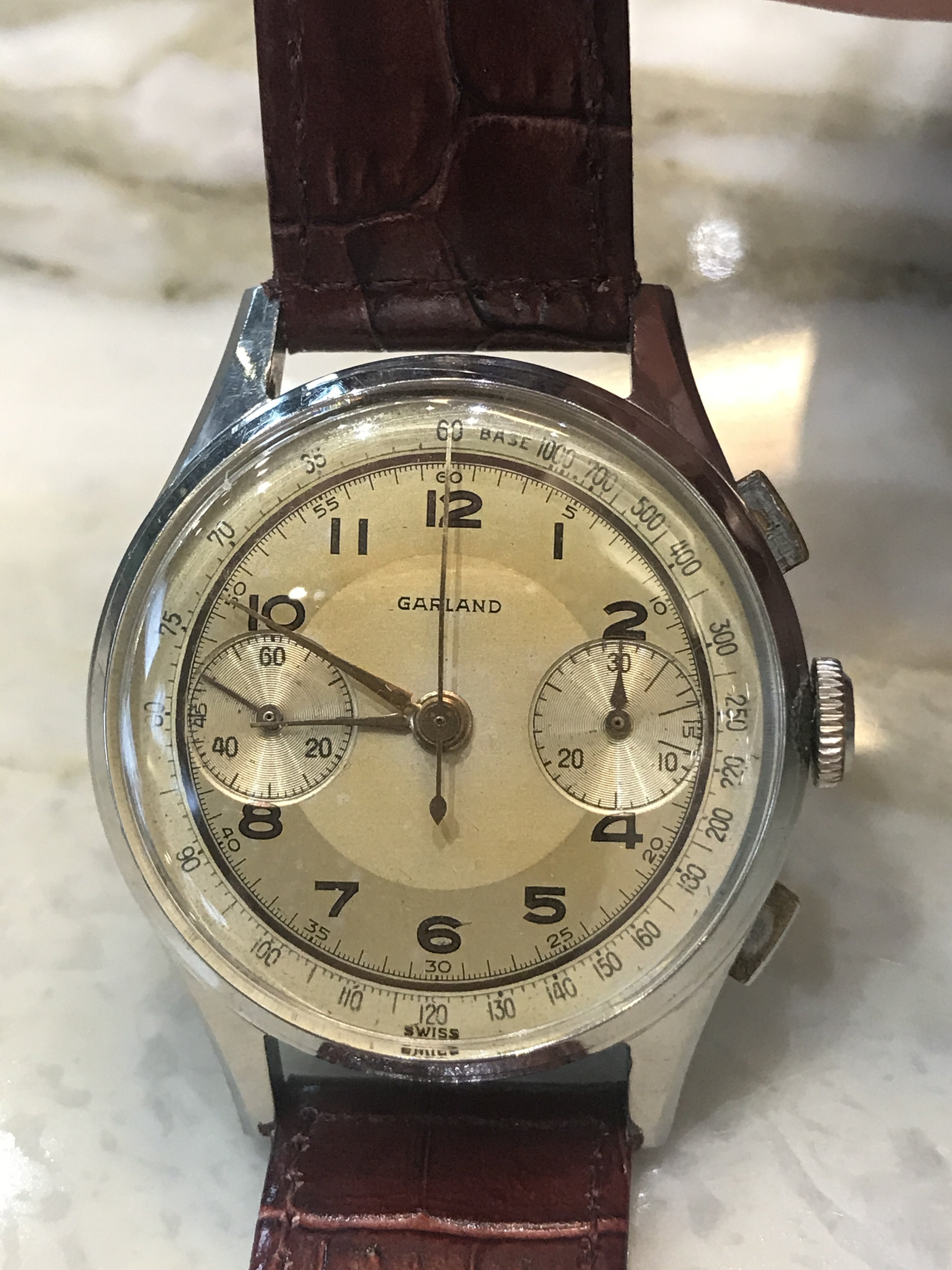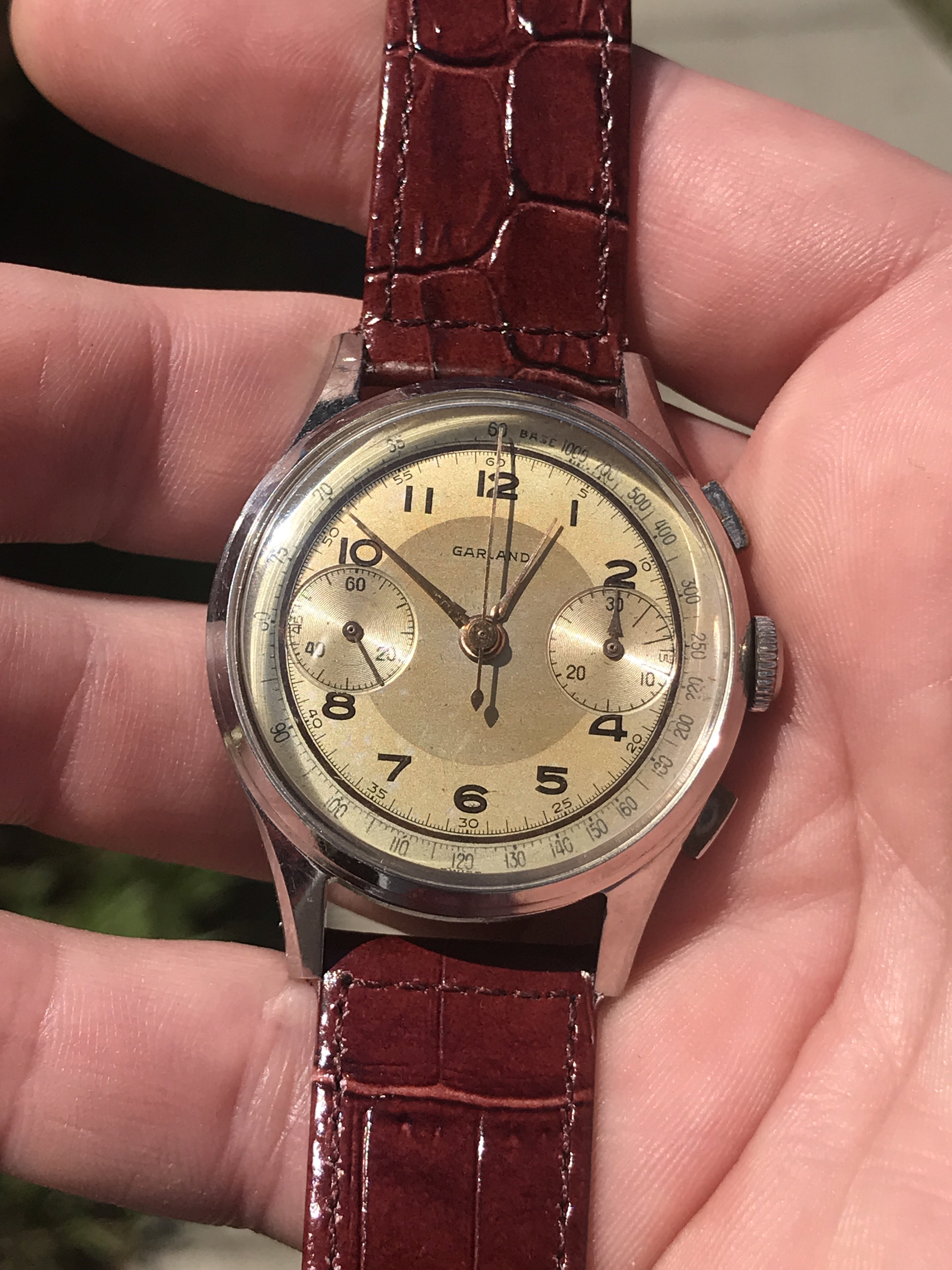 Dial: Beautiful, original dial showing slight but even patina and is a real pleasure to watch the way it changes colors in different light. Signed Garland, 60 second and 30 minute counters. Original gold plated hands.