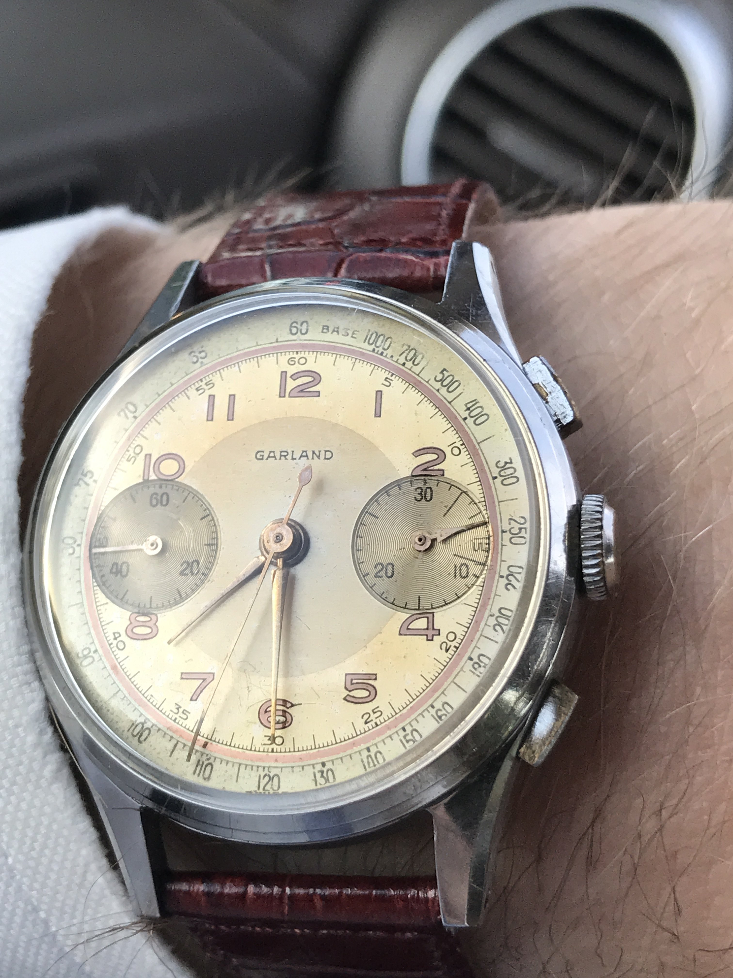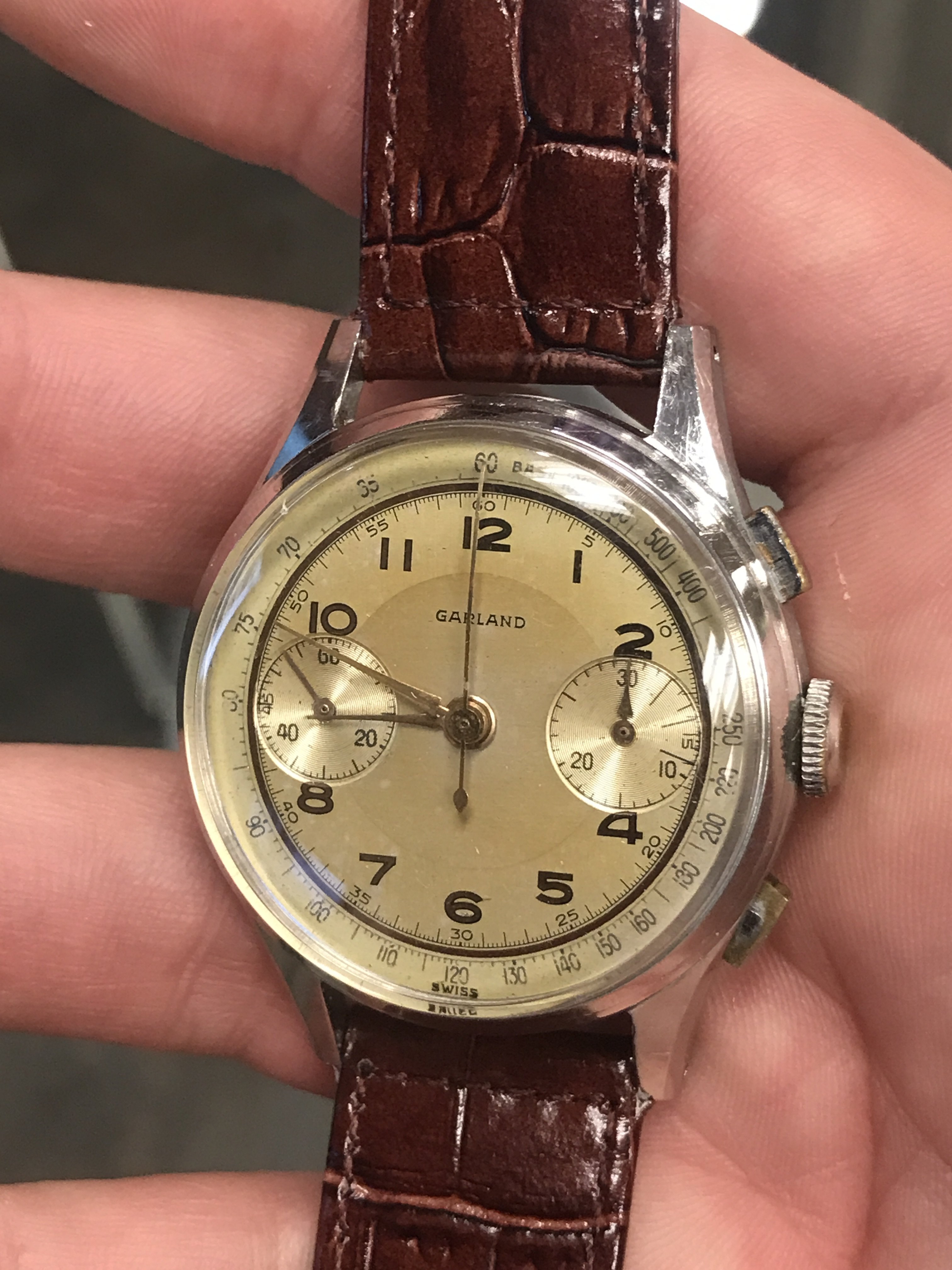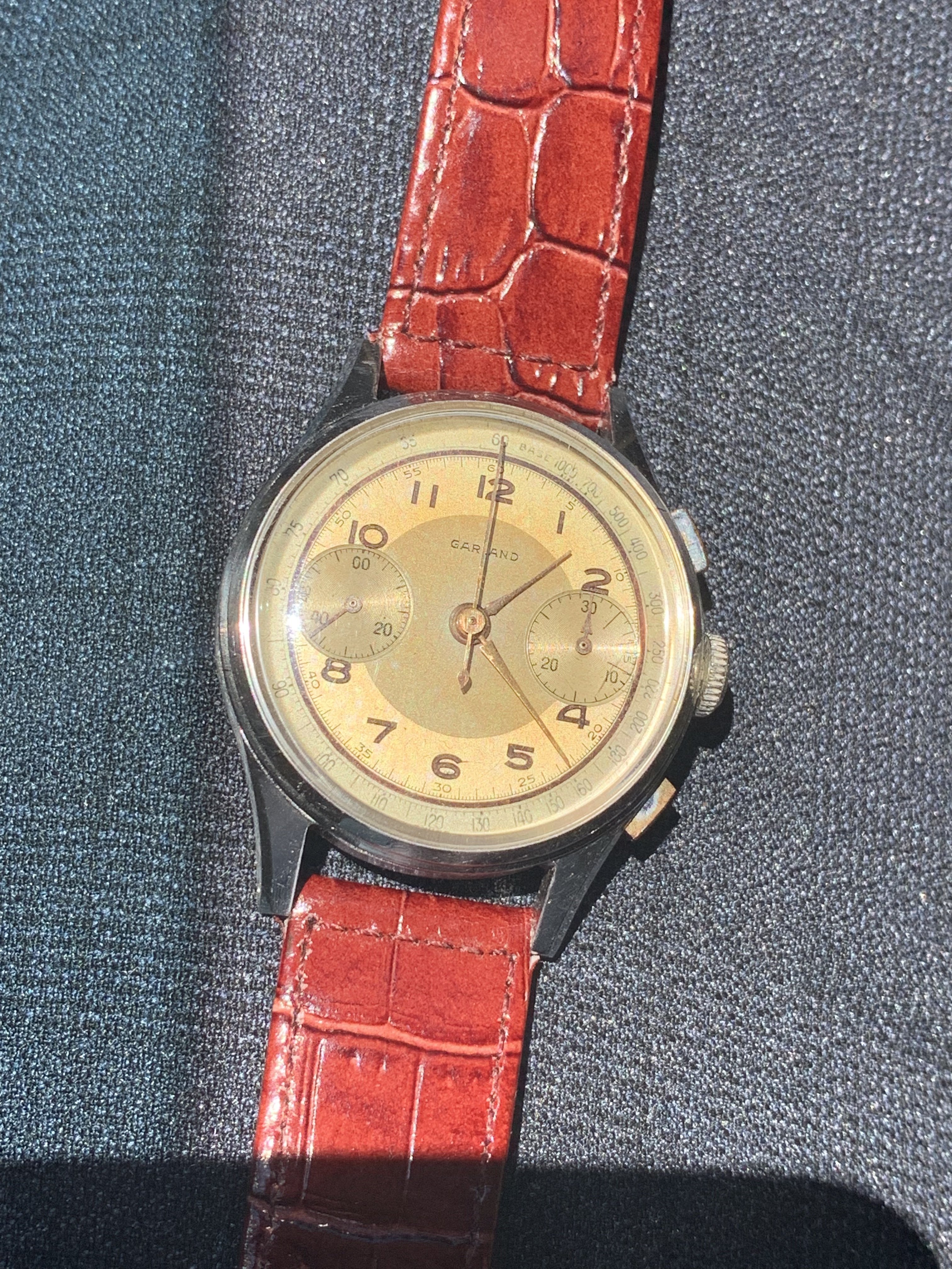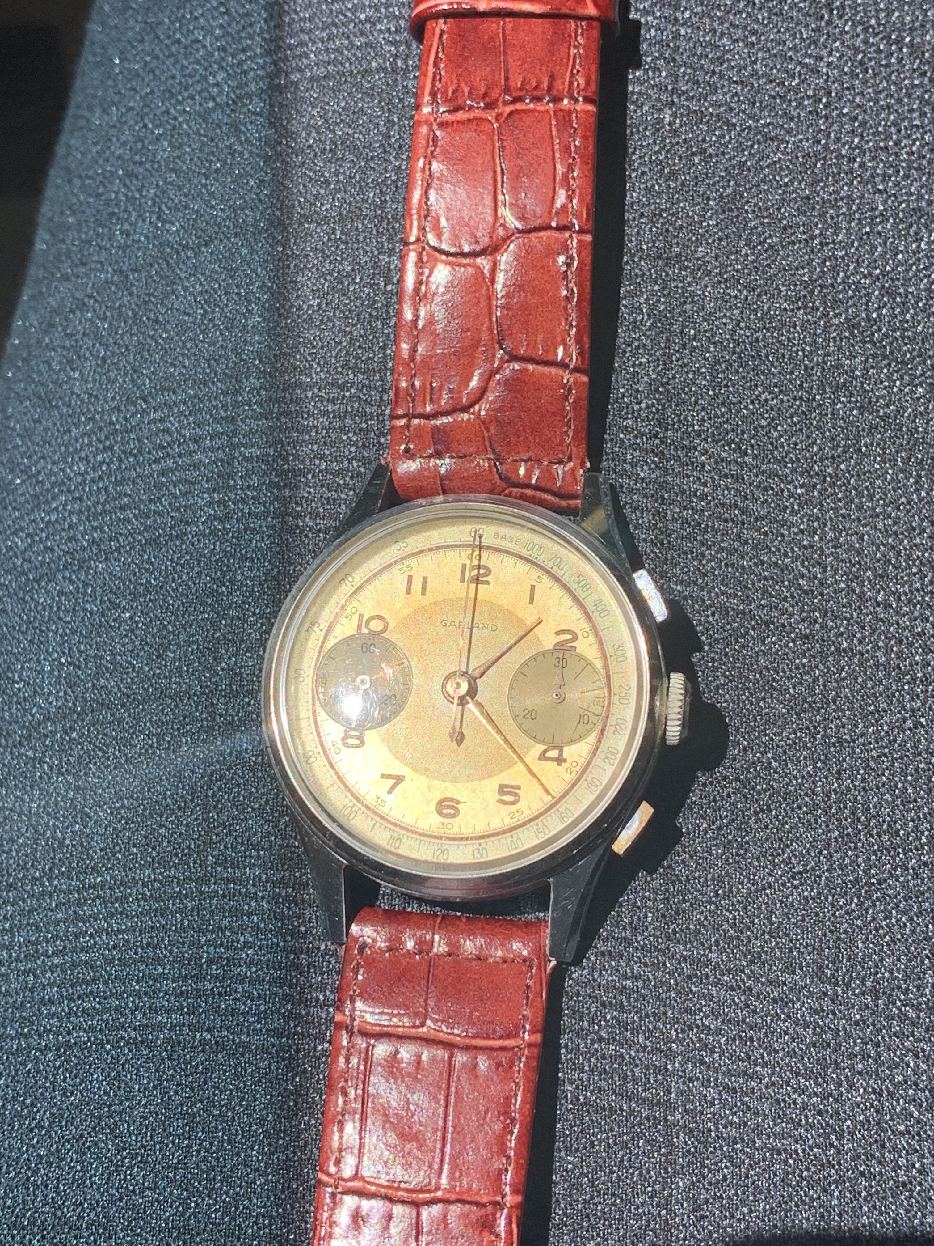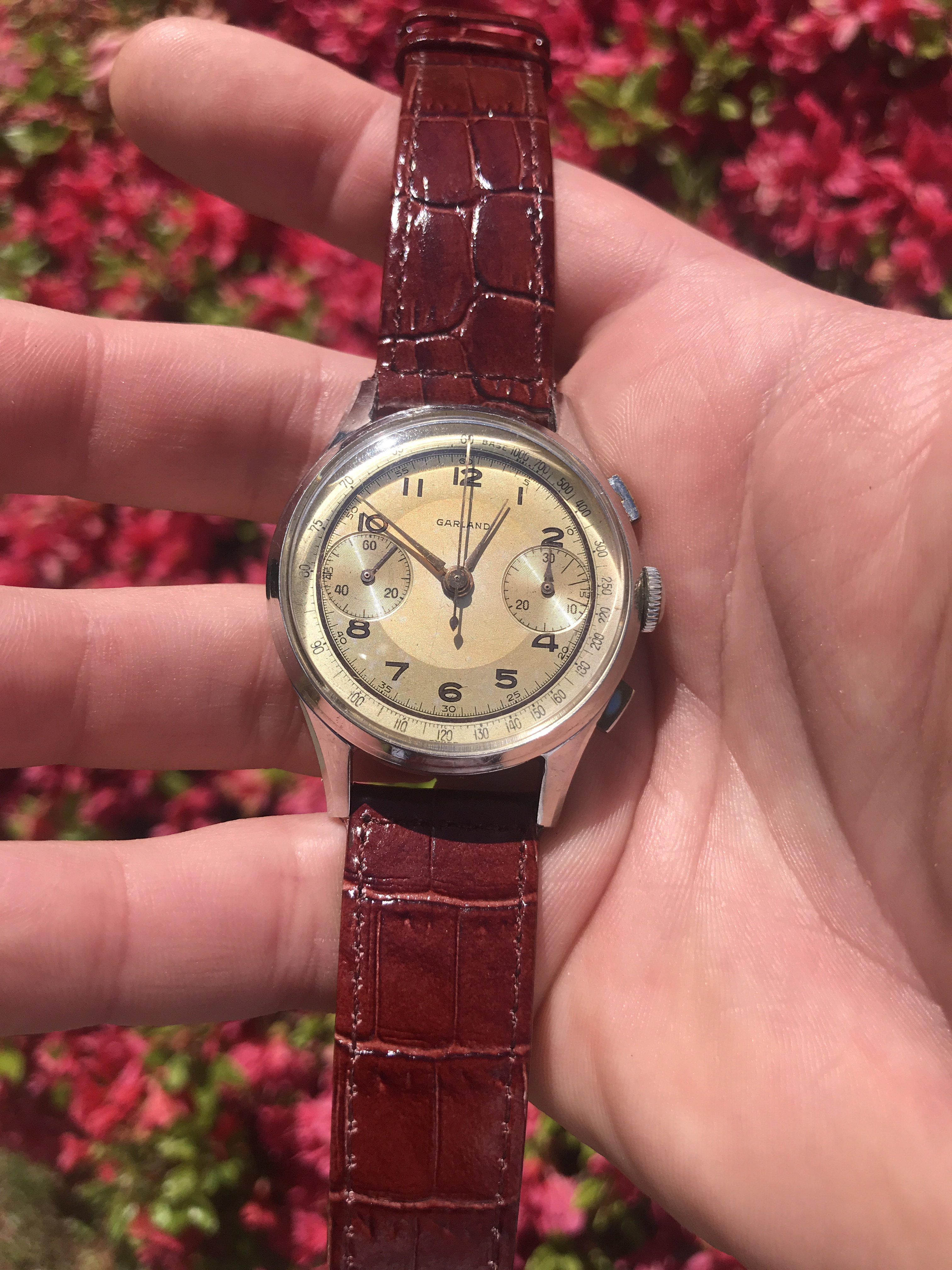 Dial: Beautiful, original dial showing slight but even patina and is a real pleasure to watch the way it changes colors in different light. Signed Garland, 60 second and 30 minute counters. Original gold plated hands.