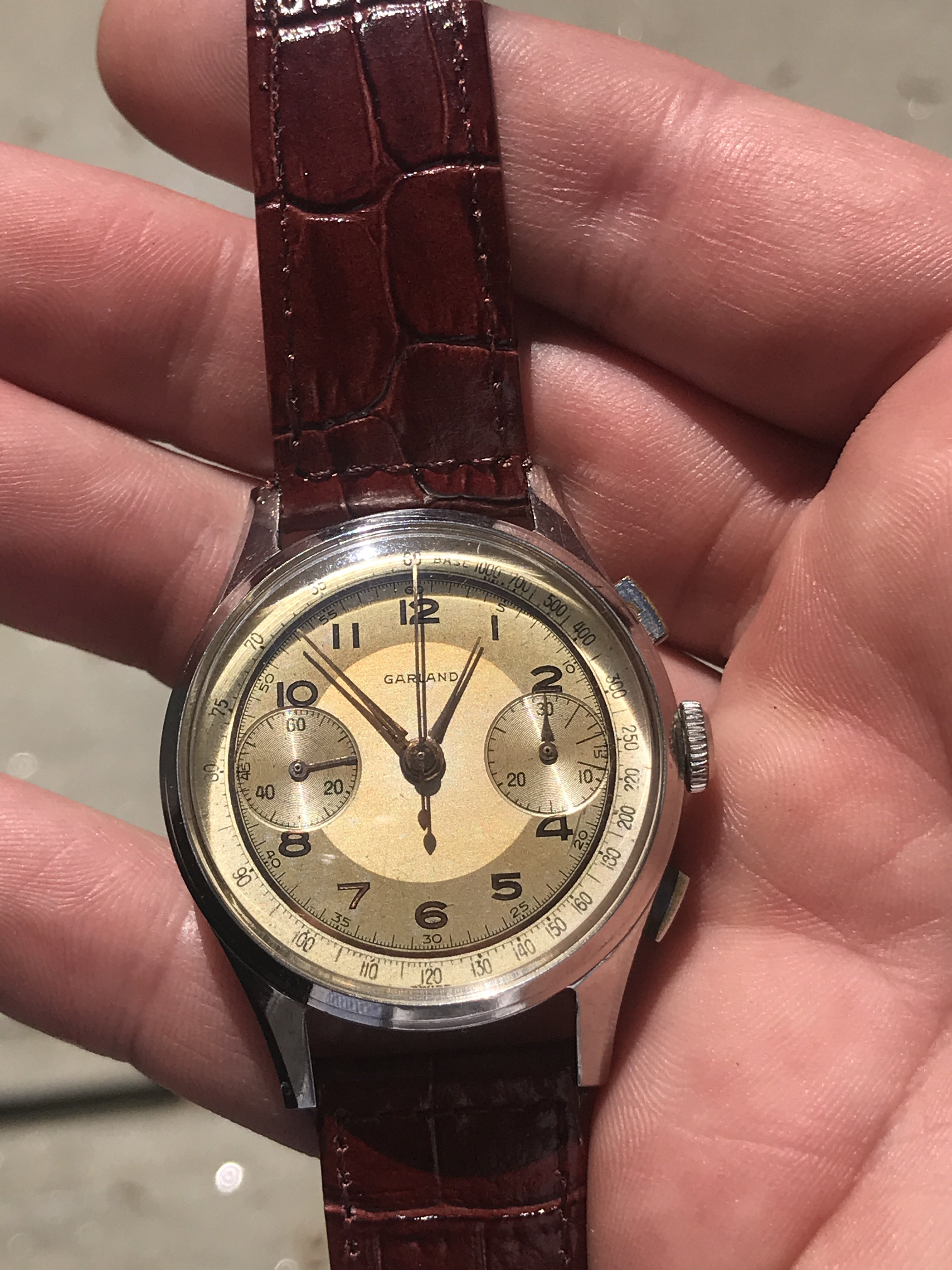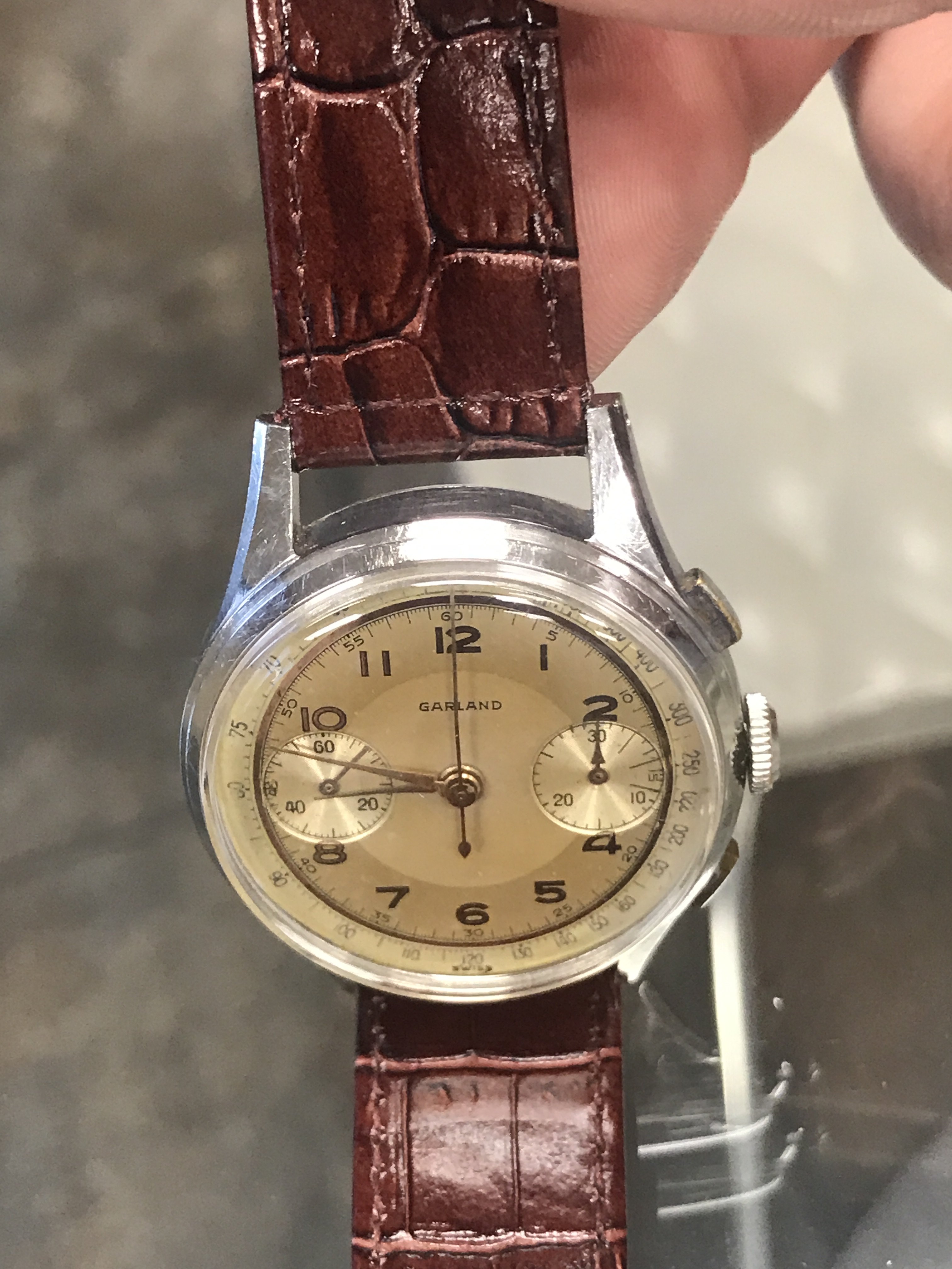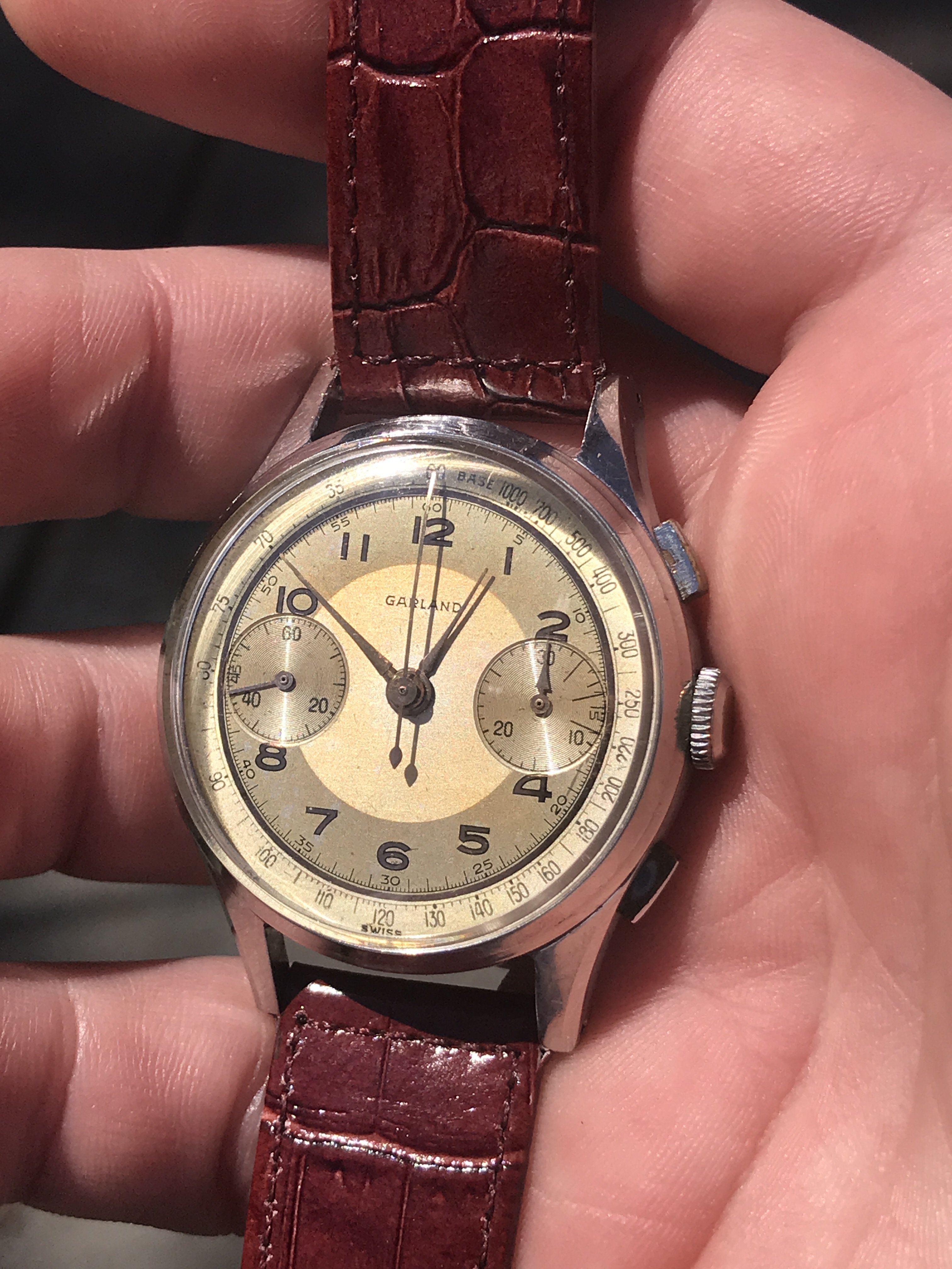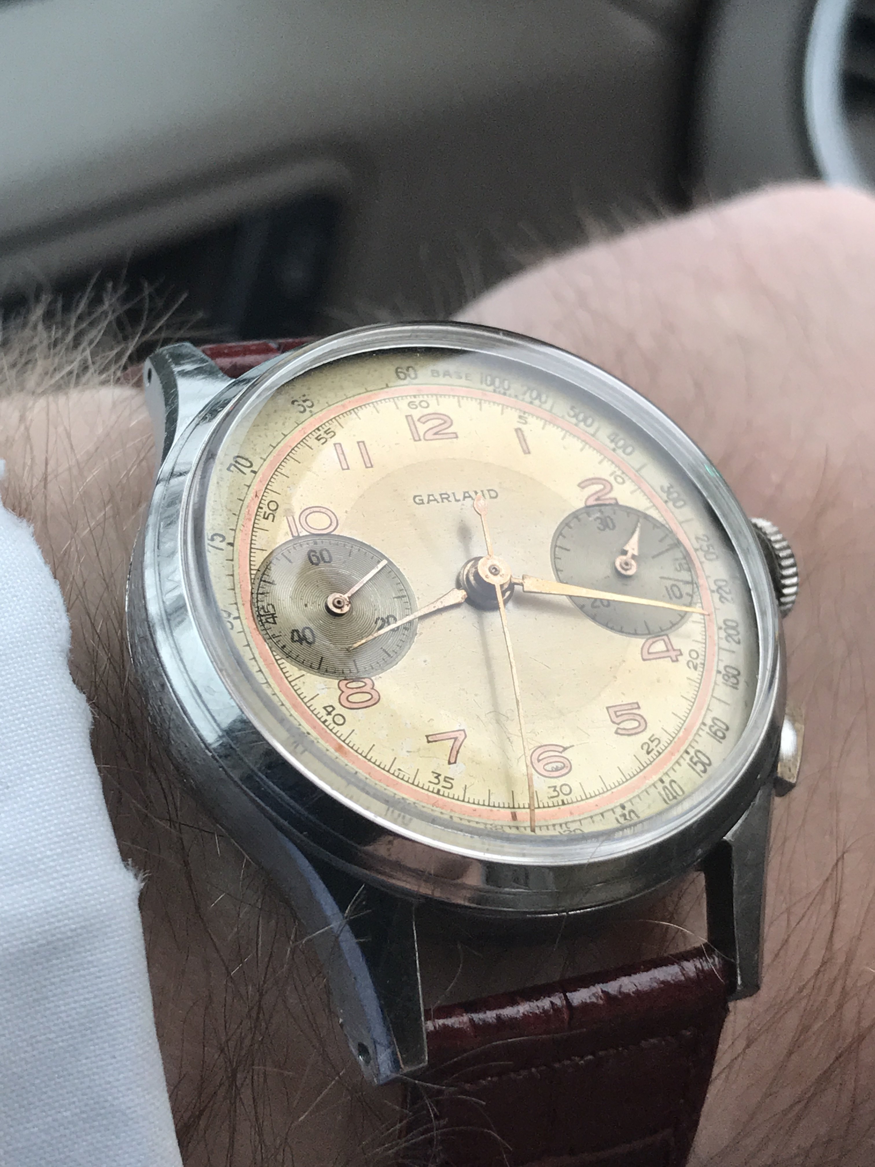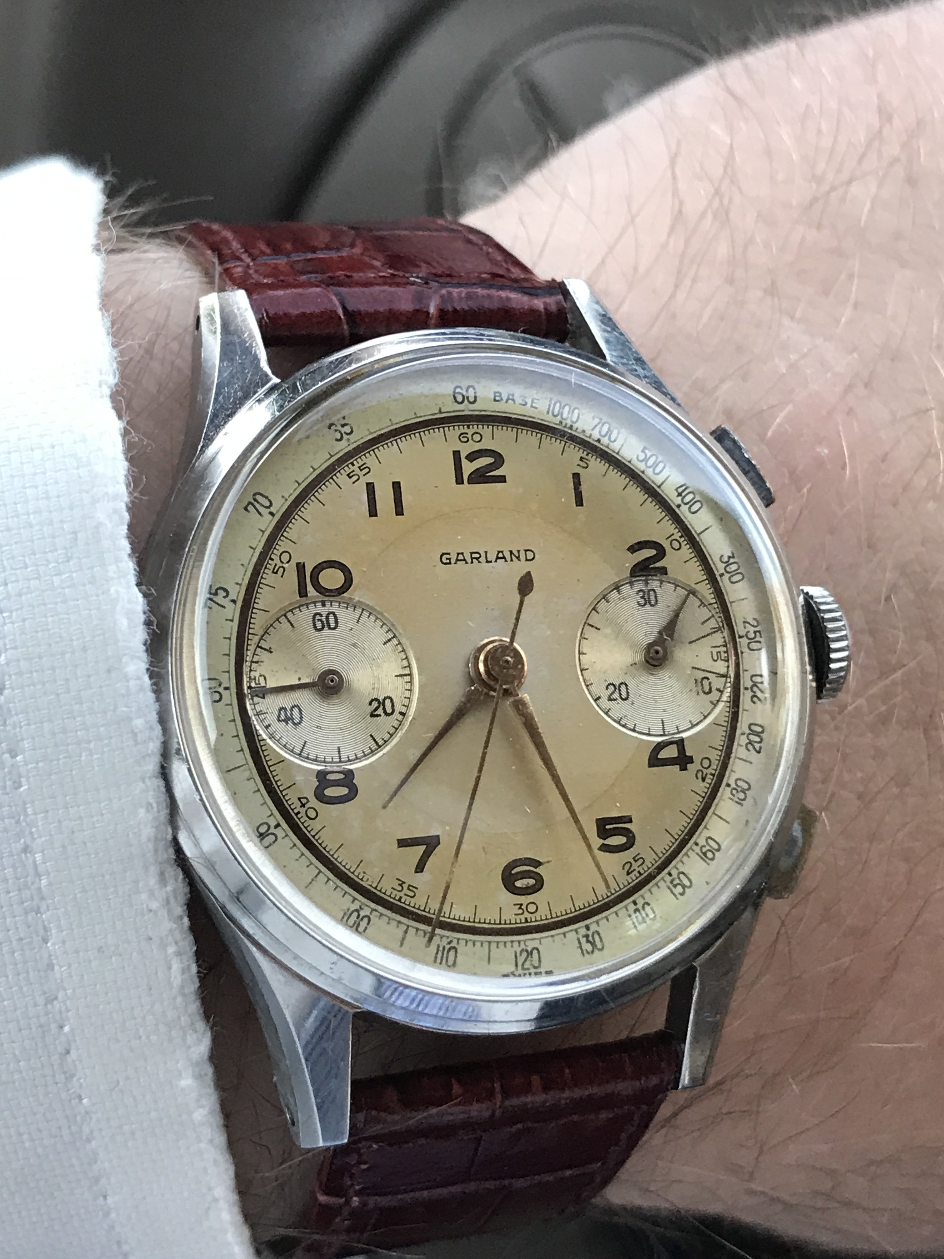 Dial: Beautiful, original dial showing slight but even patina and is a real pleasure to watch the way it changes colors in different light. Signed Garland, 60 second and 30 minute counters. Original gold plated hands.