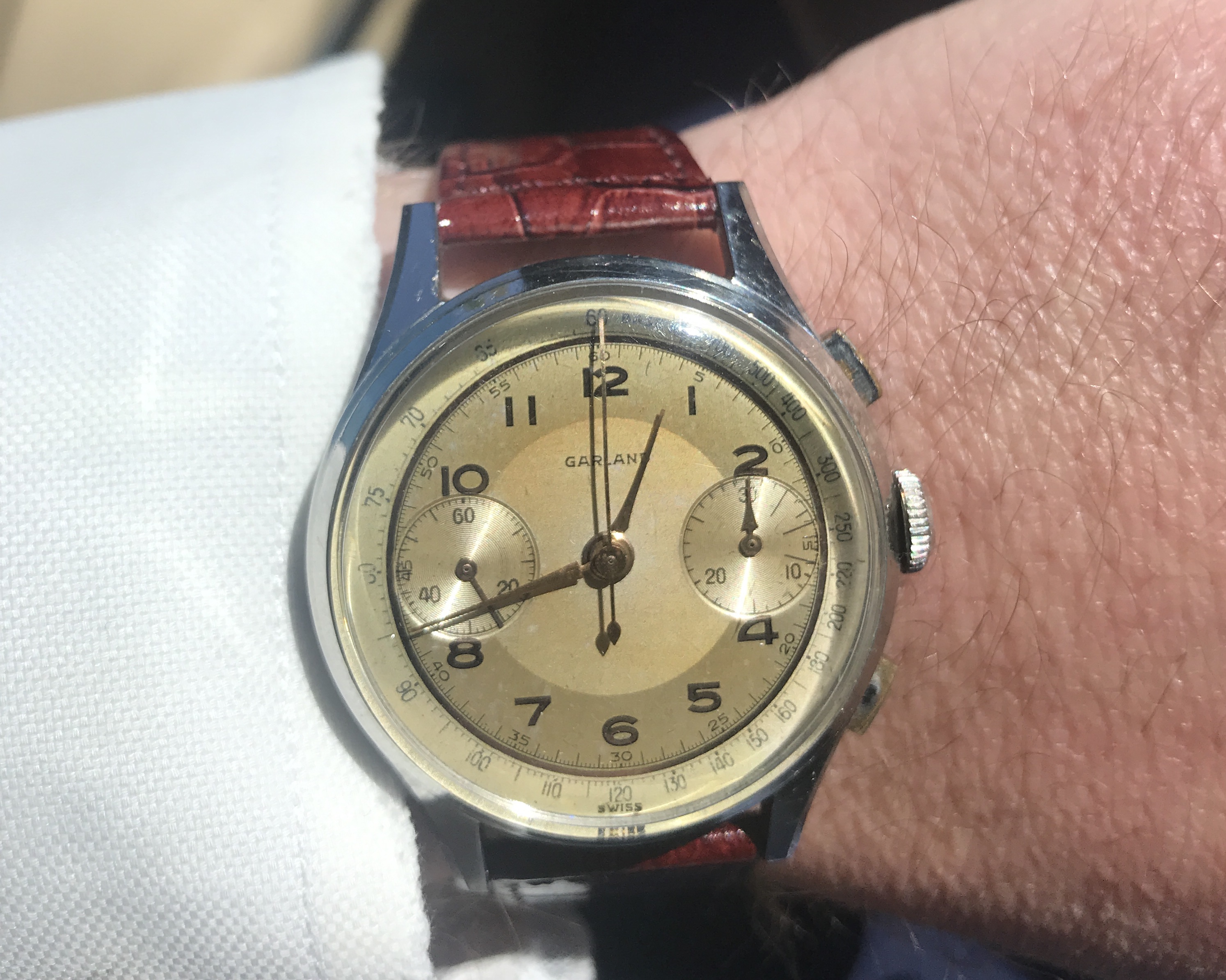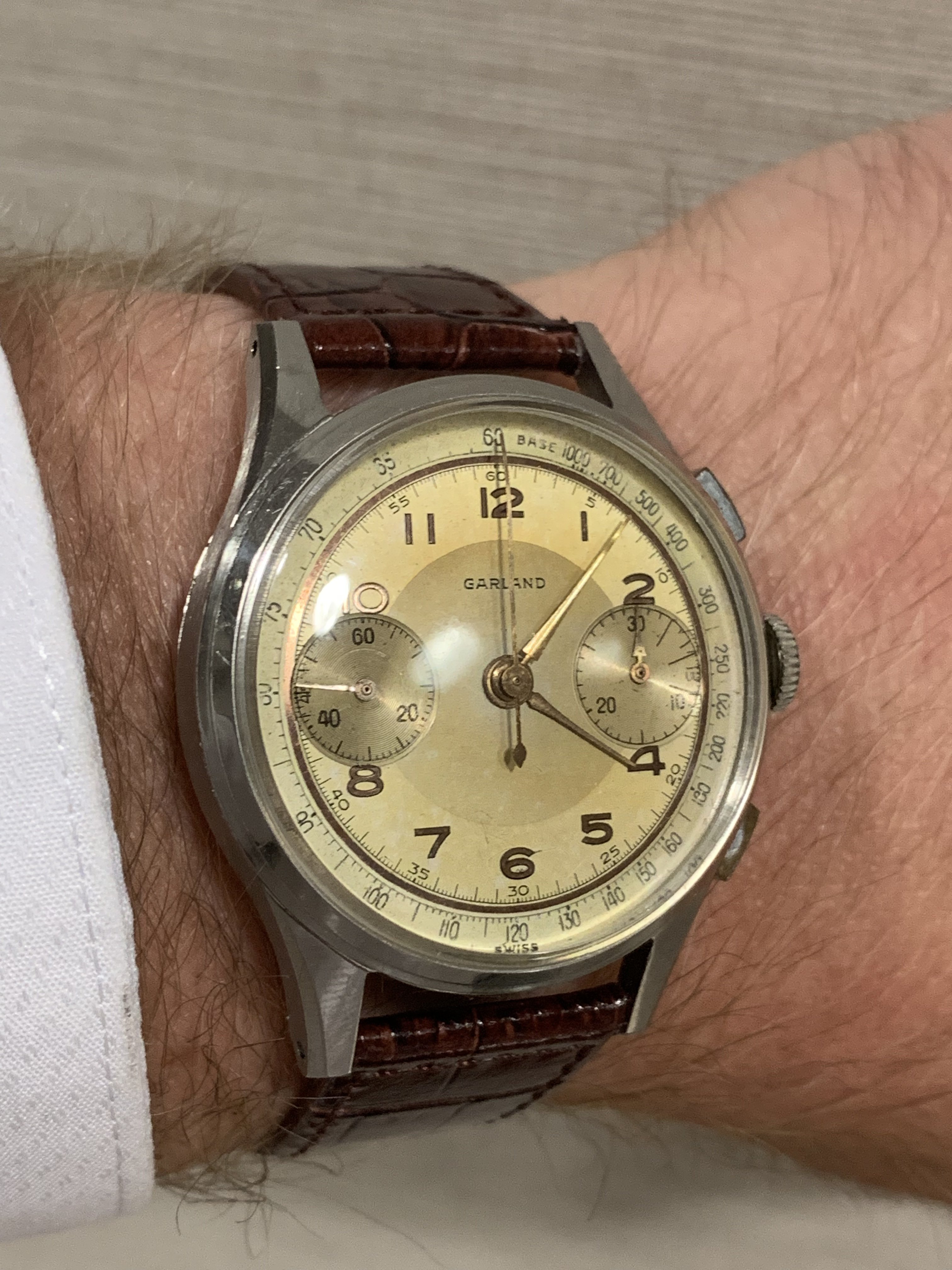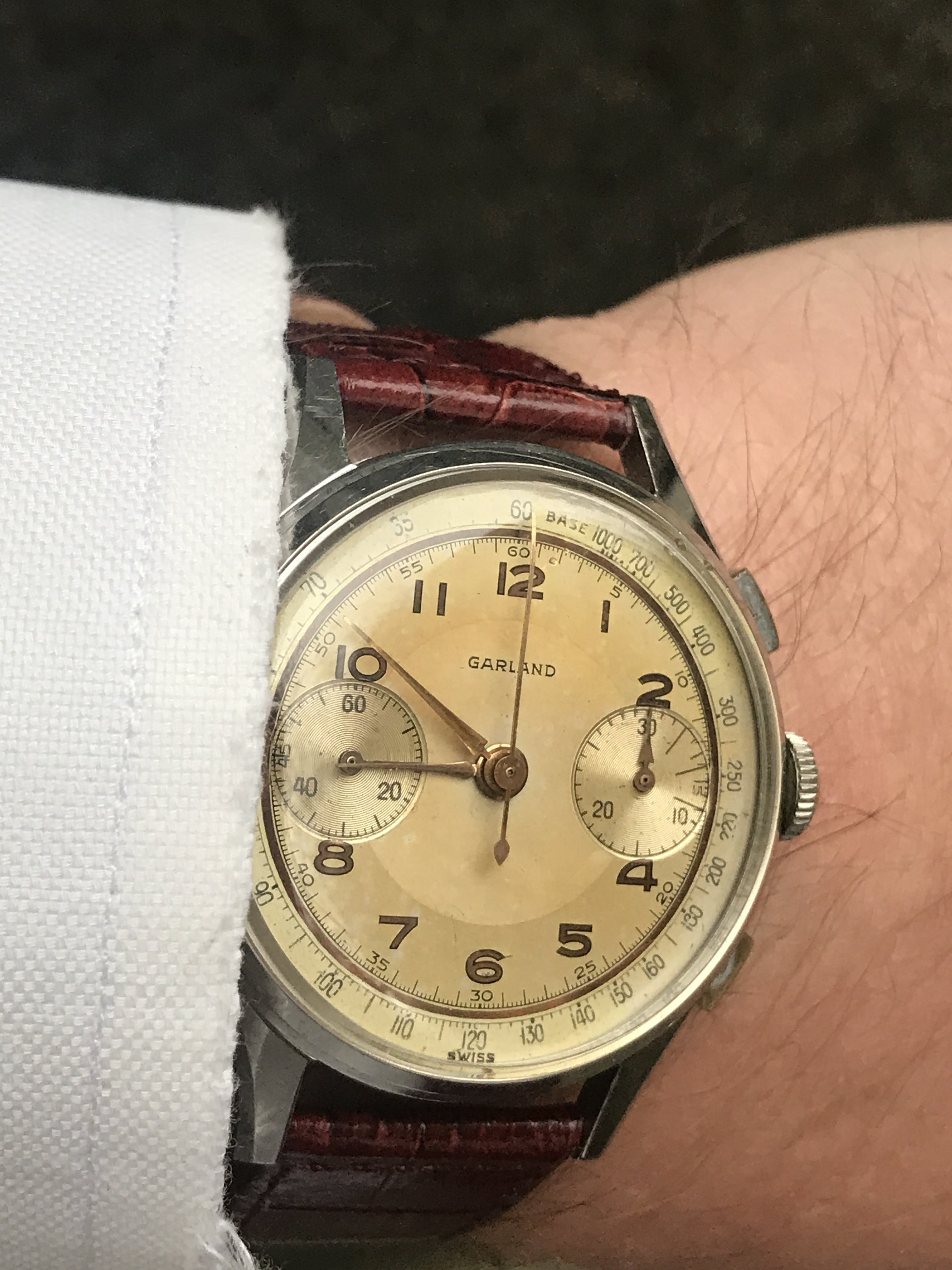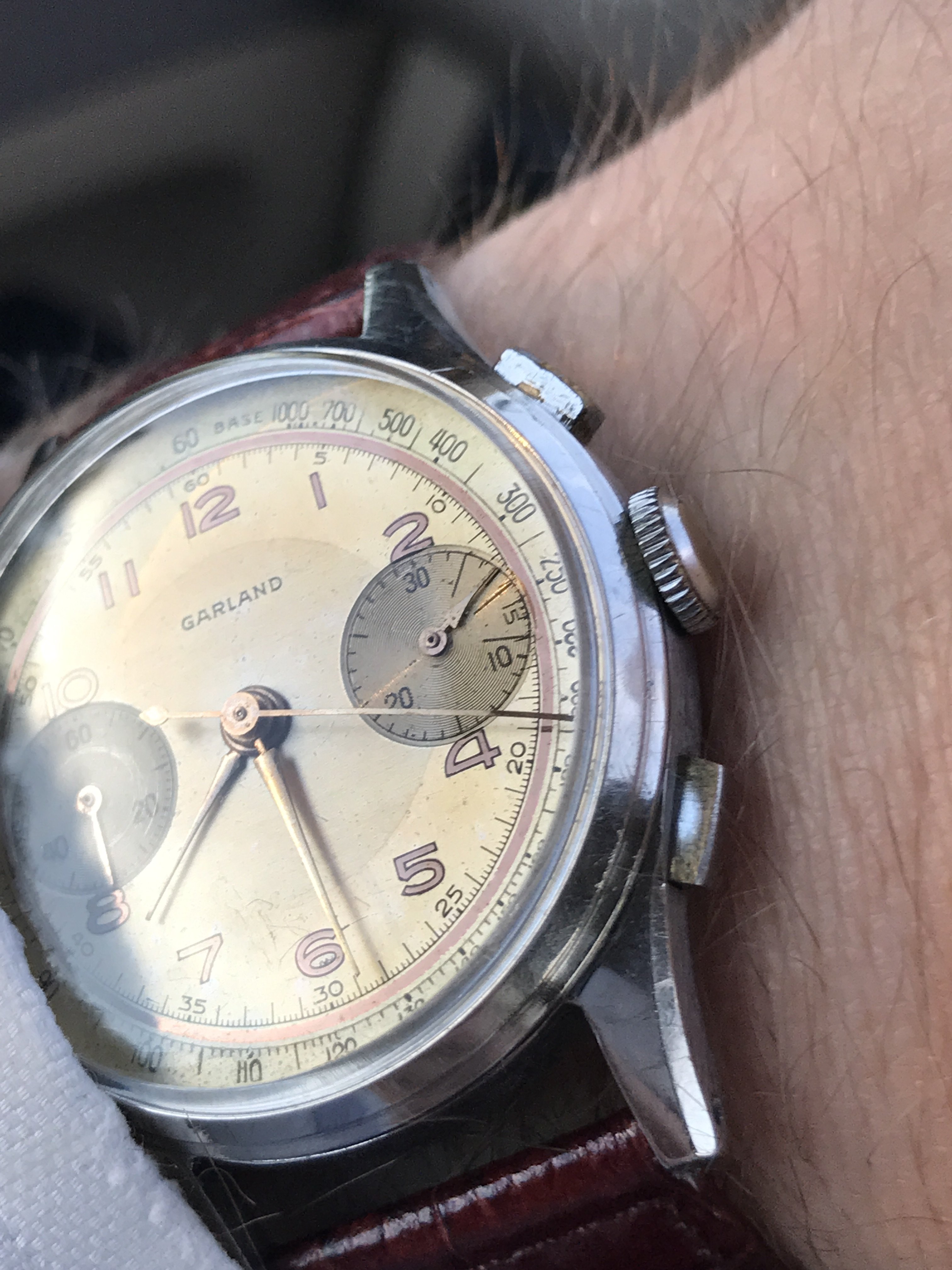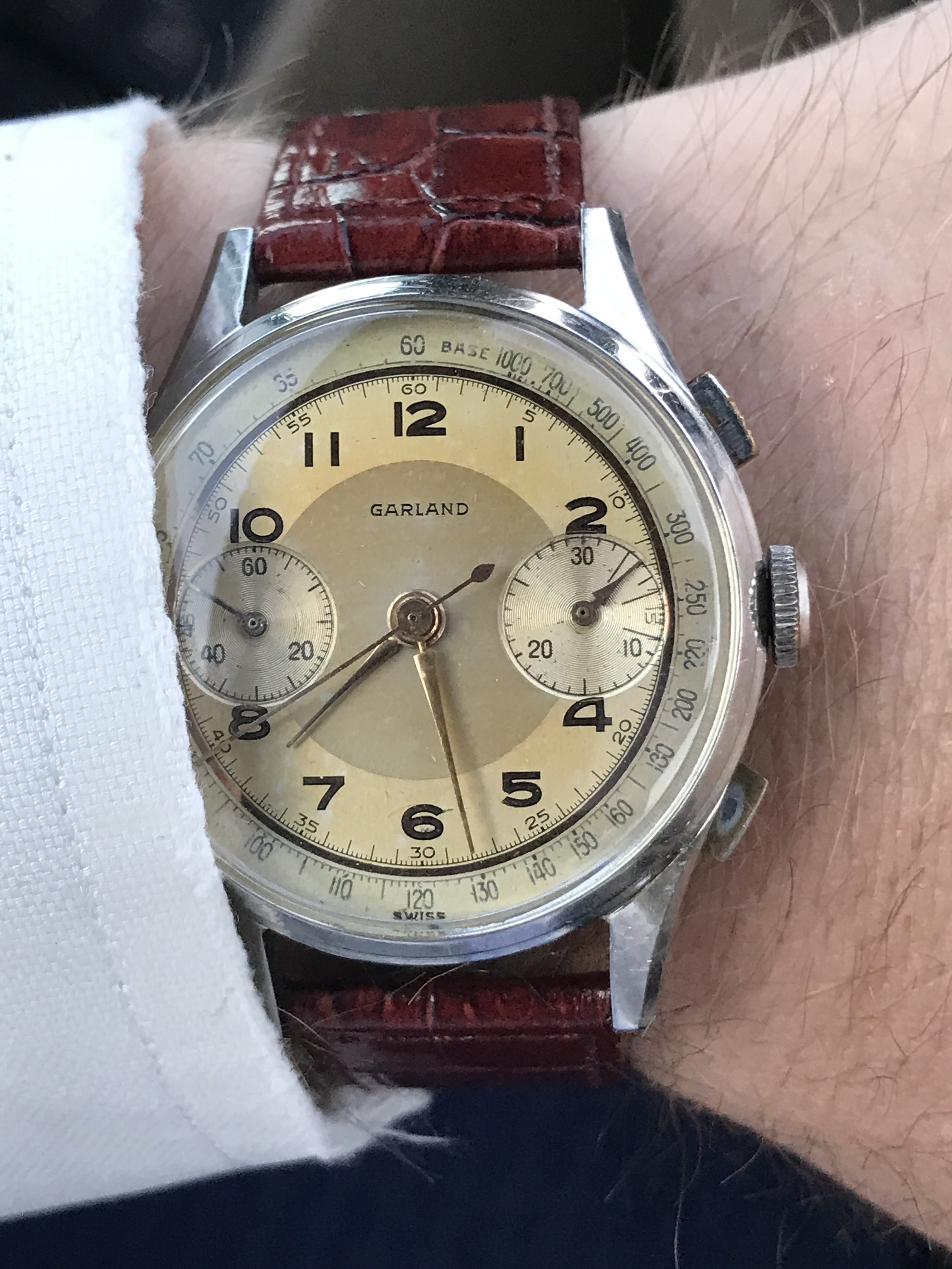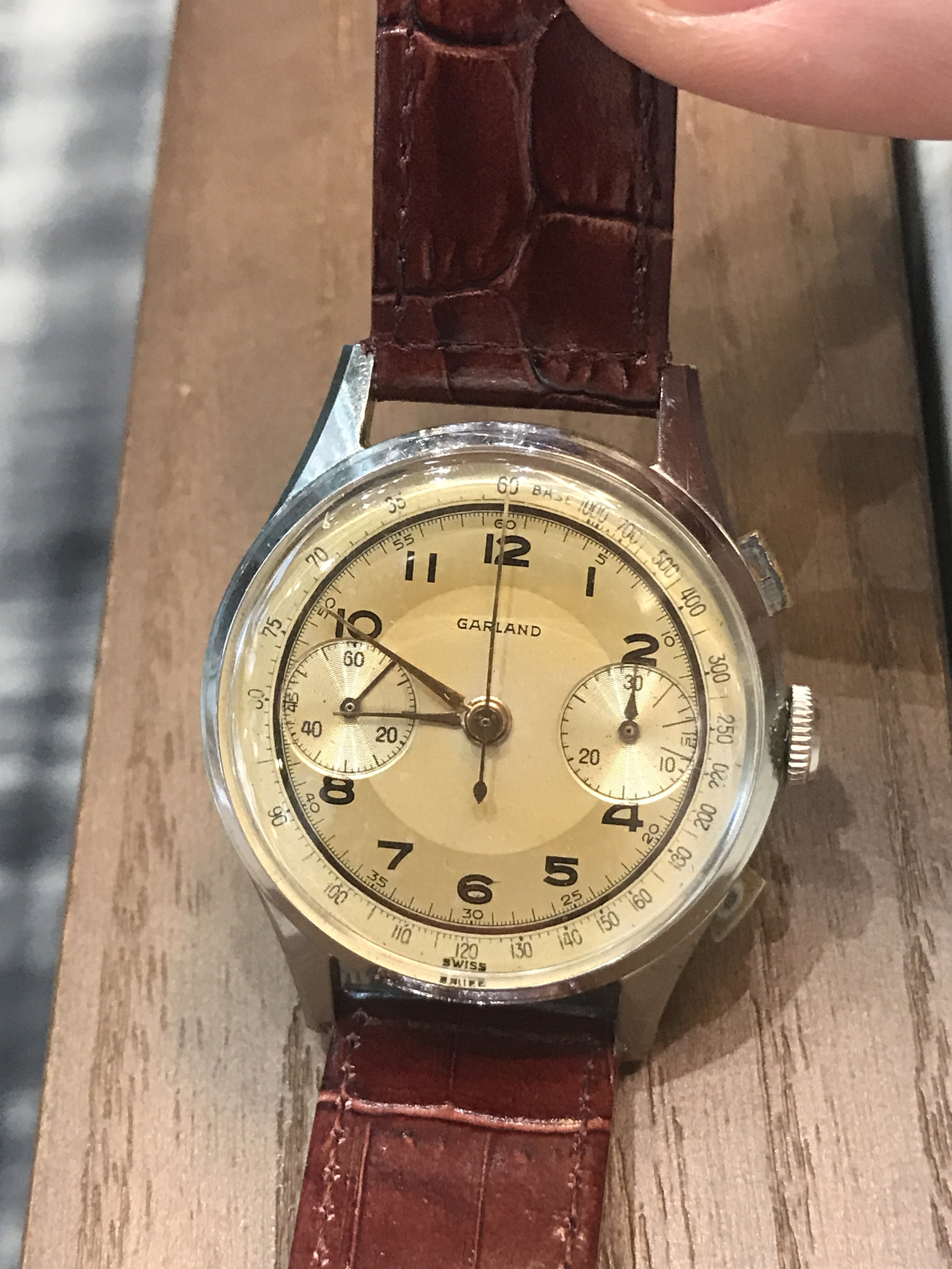 Dial: Beautiful, original dial showing slight but even patina and is a real pleasure to watch the way it changes colors in different light. Signed Garland, 60 second and 30 minute counters. Original gold plated hands.