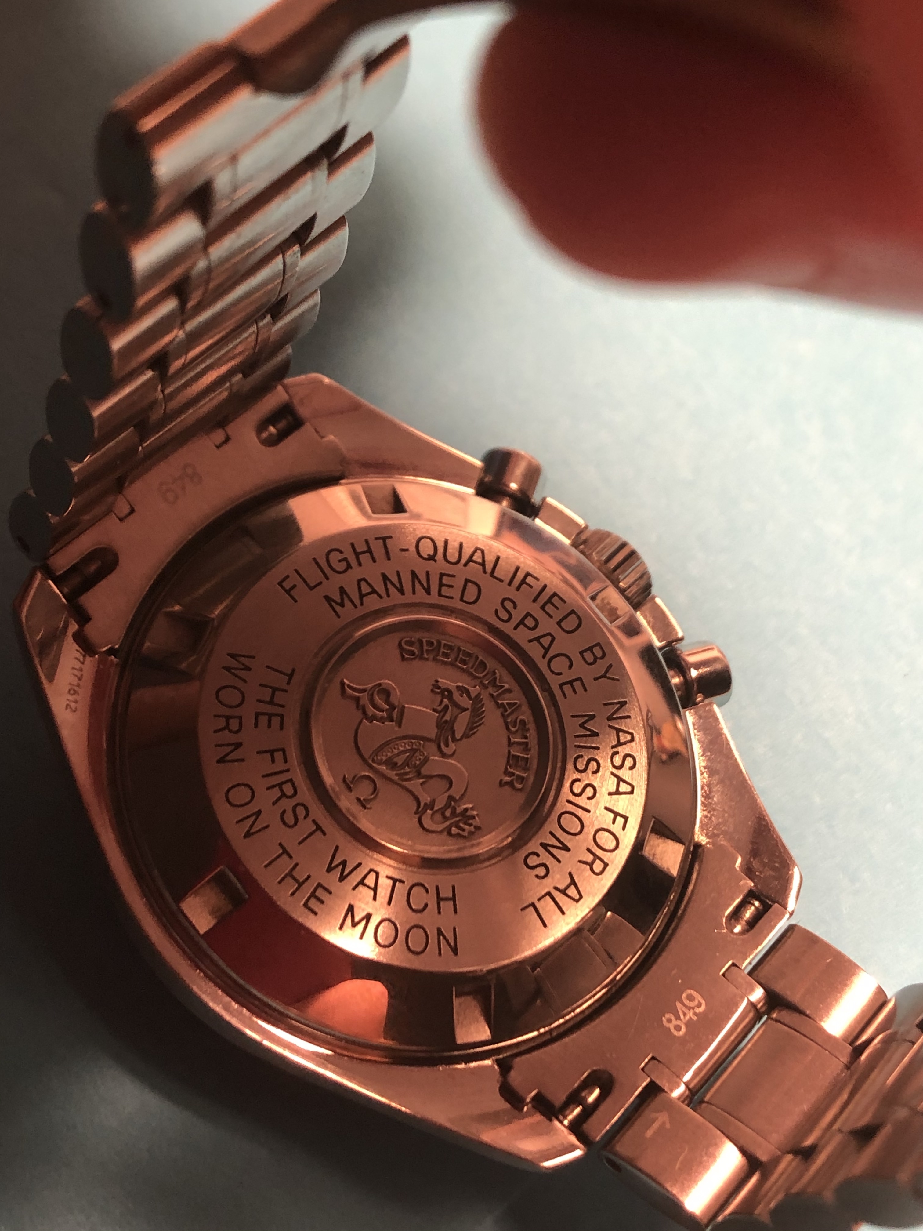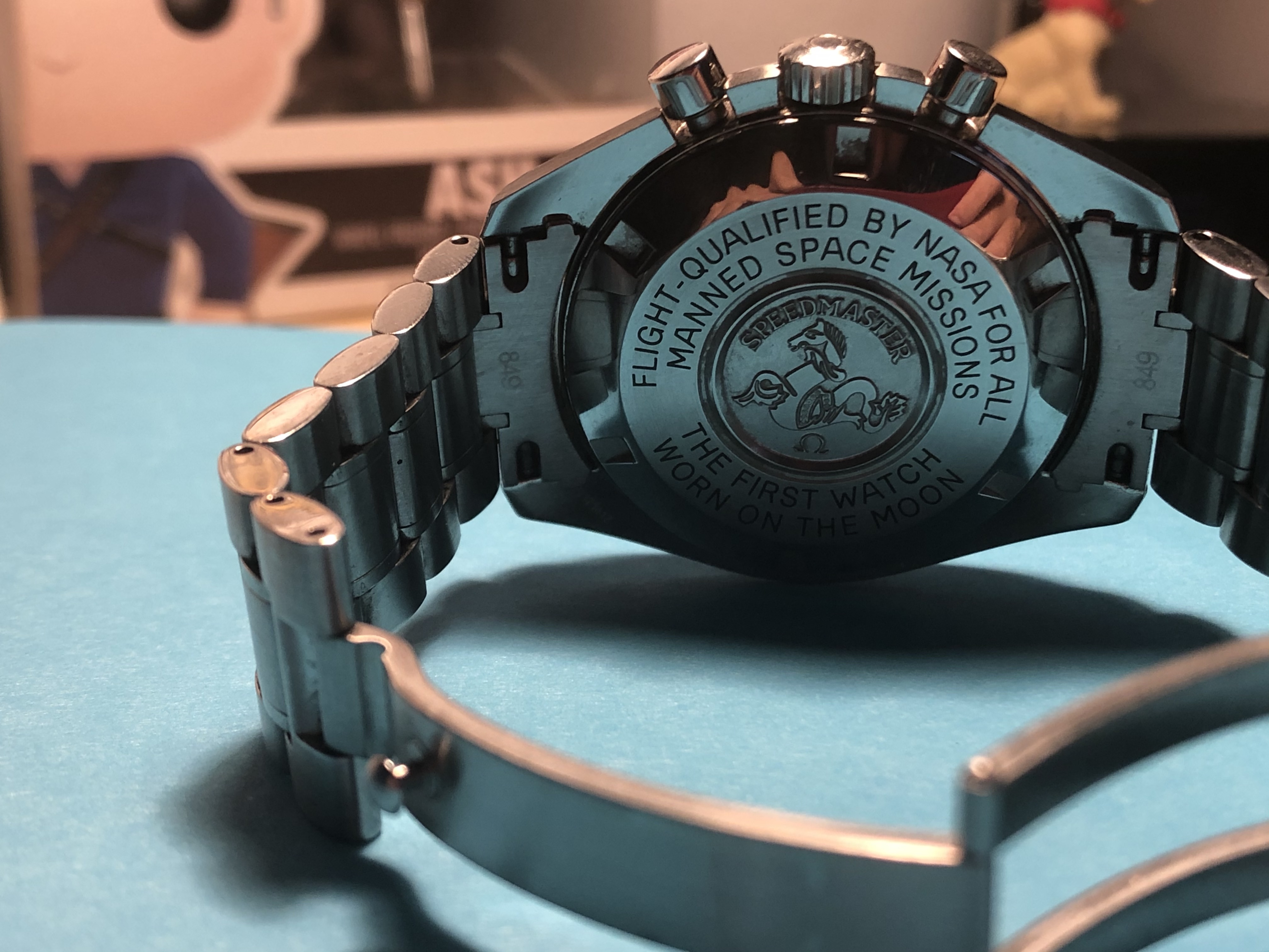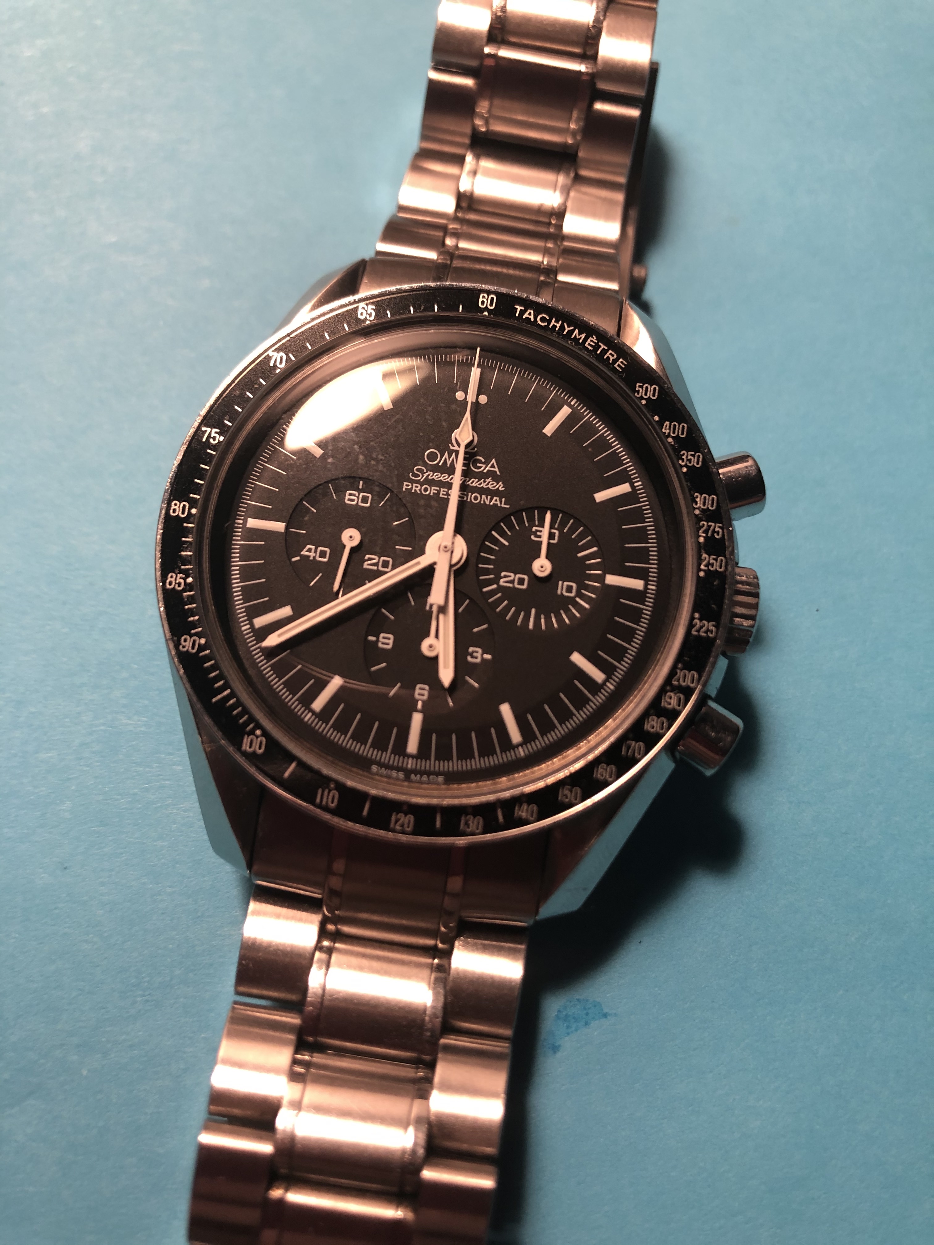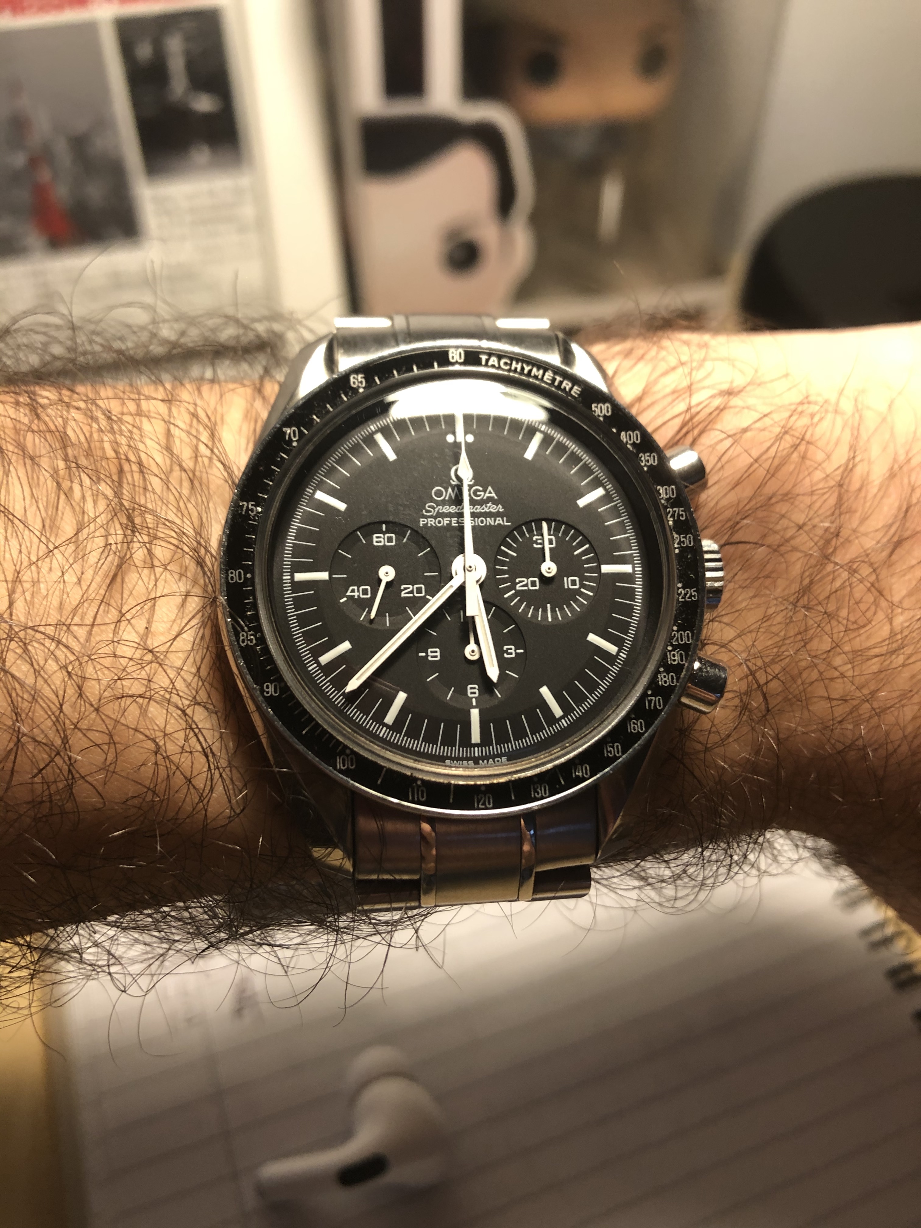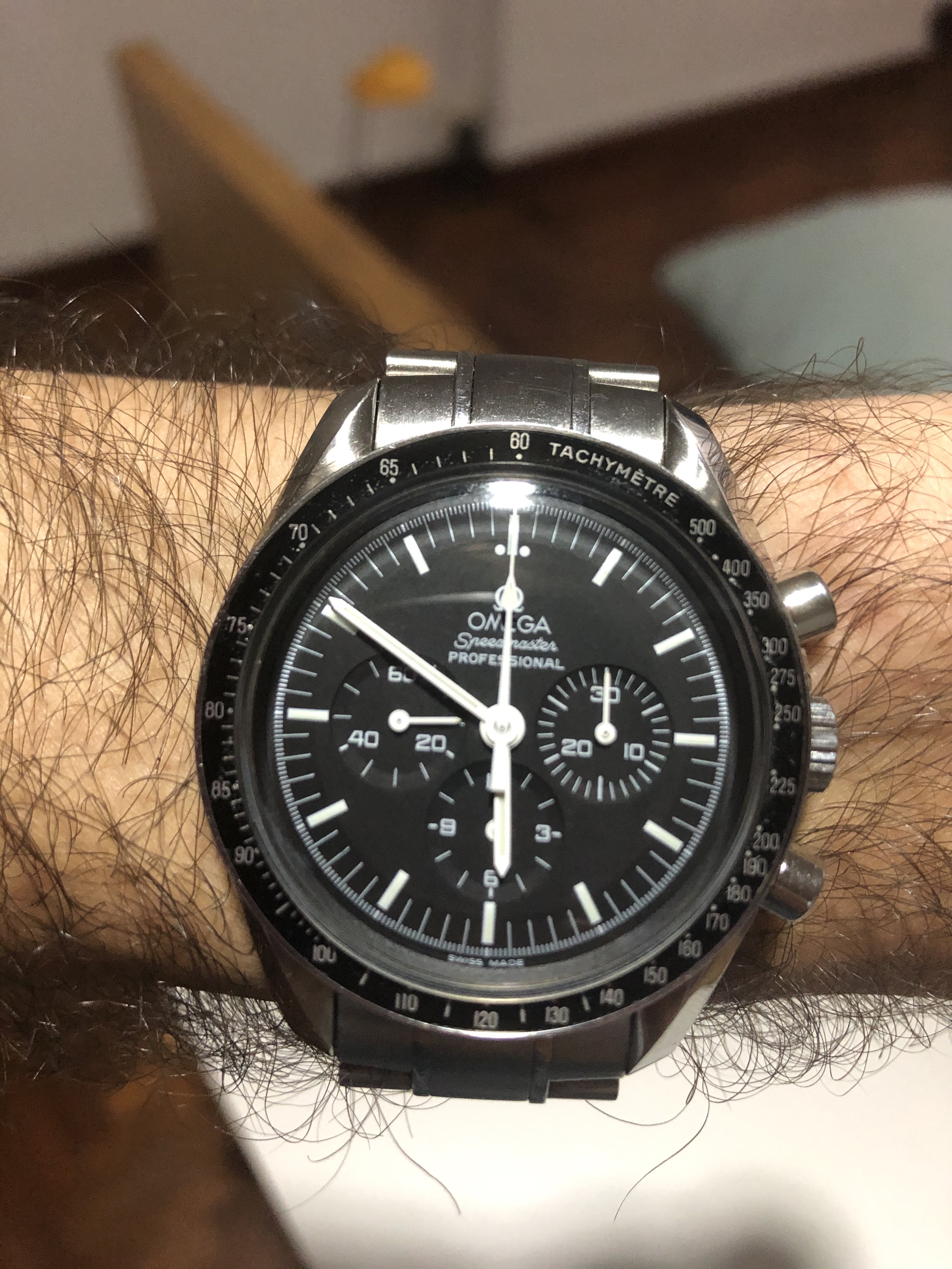 ·After all the time I've been lusting over a Moon watch I finally pulled the trigger and got mine today. At first I was a bit hesitant because I have very tiny wrists - wearing a 42mm case on a 6" twig ain't the exact meaning of finesse but oh well. It's a relatively modern 2005 ref. 3570.50.00 cal.1861 with Hesalite glass. I still prefer vintage Speedies with a bit of patina, but I got a relatively good price on this piece since the seller was in a rush to sell.