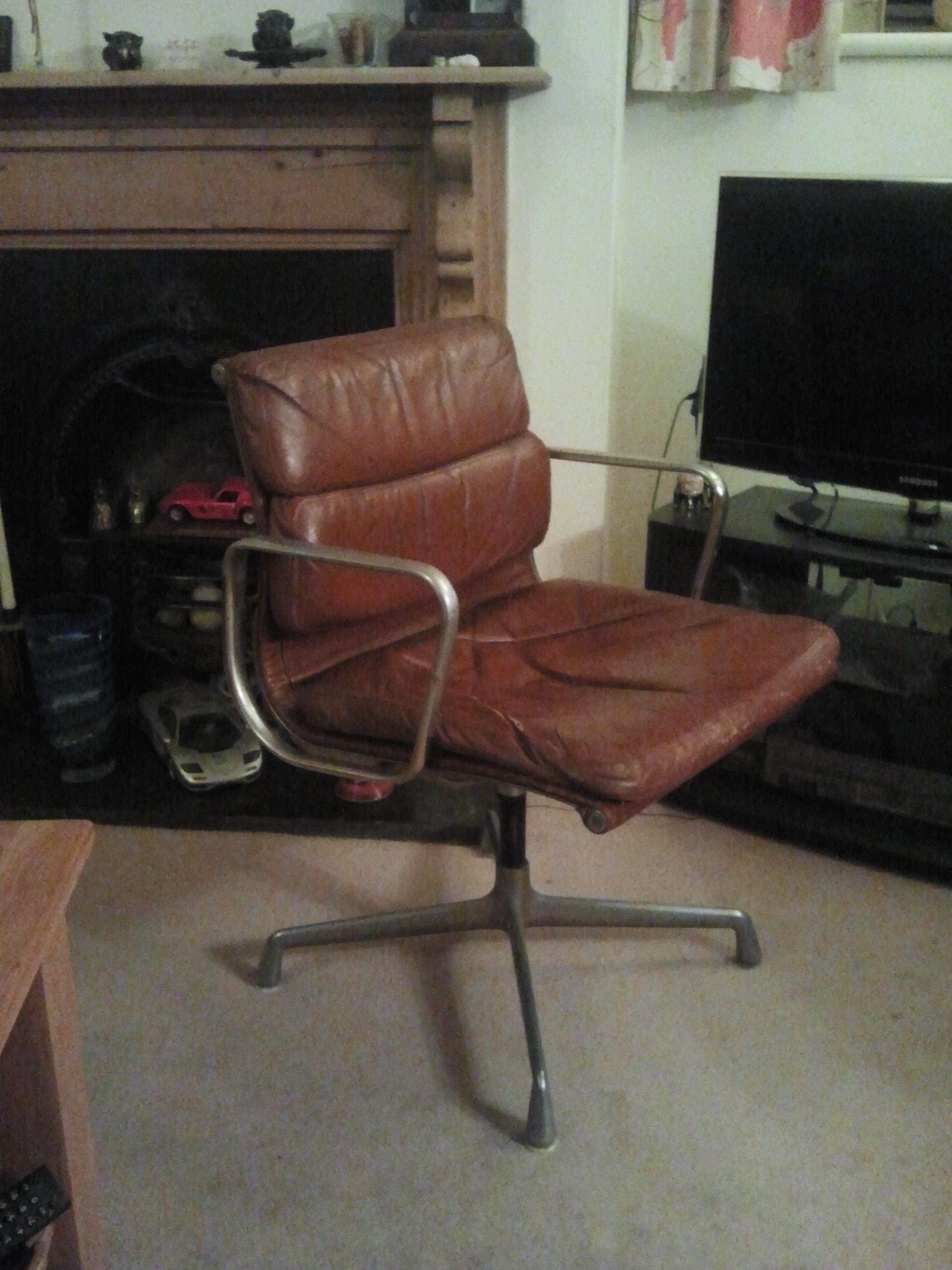 Here's mine as well. Had the stock H-base so I threw on a repro rocker. Currently sitting in it now, but with the vintage rolling desk-chair base instead.
