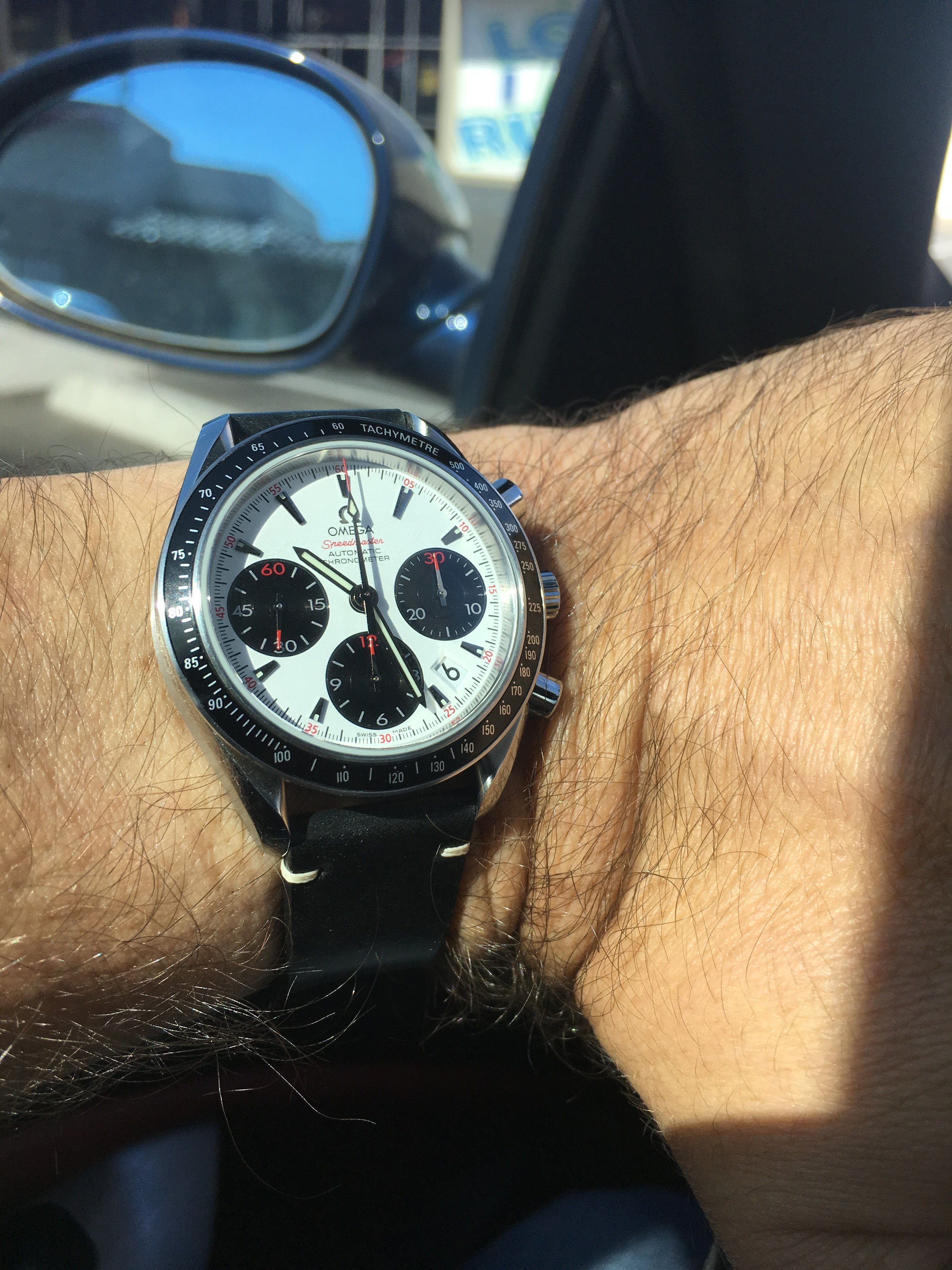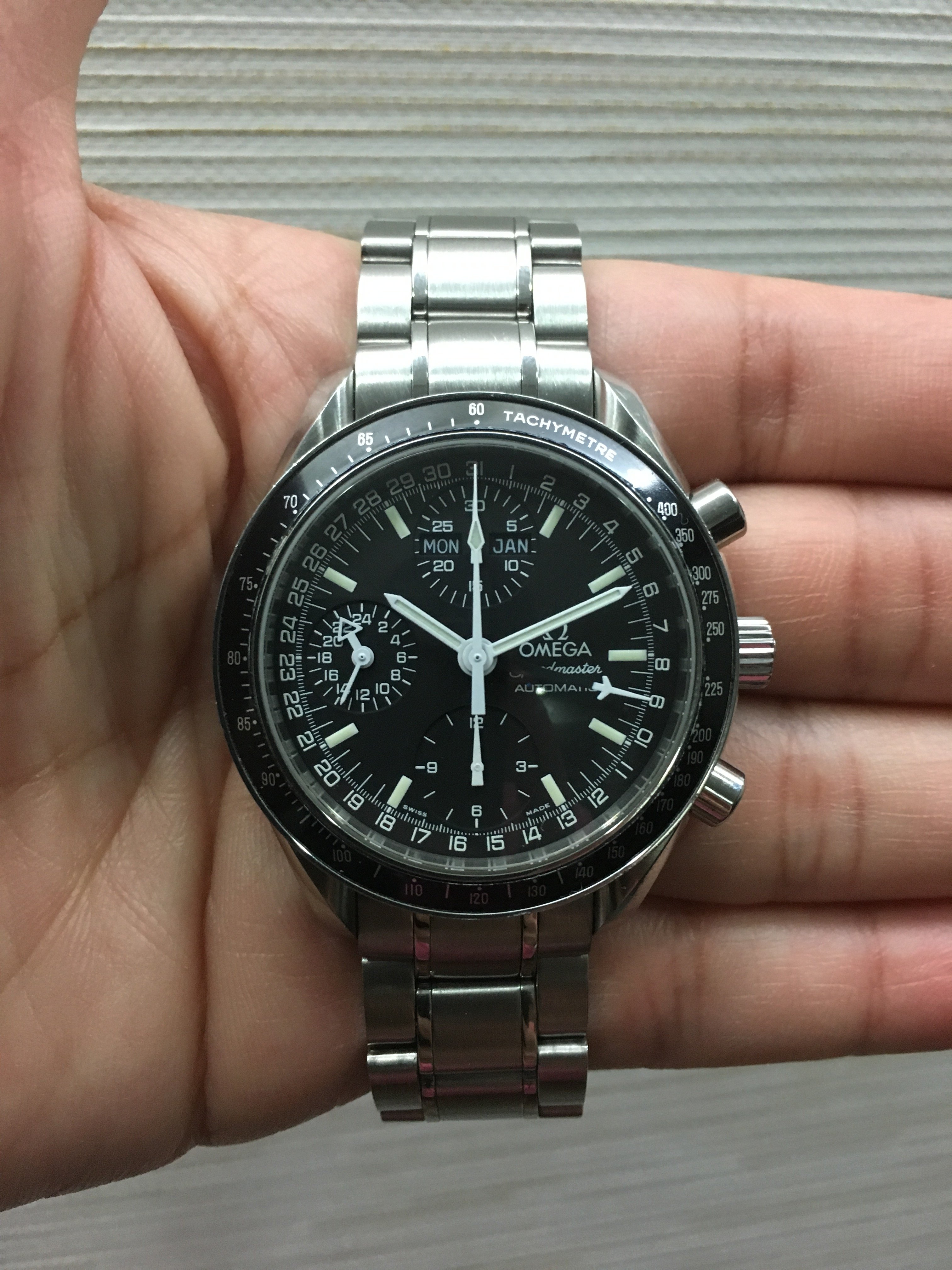 Only problem with that is the oversize 44mm case which makes the sub dials look cramped into the middle of the dial. The 3313 movement at 27mm actually fits a 34mm case so the sub dials look odd when a massive spacer is used. Here is a side pic of two 3313 Speedmasters, LHS 44mm as above and the RHS 42mm. By the way way, the 861 movement used in the Moonwatch is only 27mm dia also, the Moonwatch could have been 36mm or less!