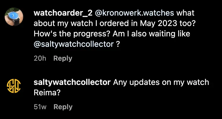 In Aug 2024, a UPS tracking number was provided. However, the number was never activated, nothing was shipped, and the number expired a month later. Meanwhile, I was met with radio silence mostly, except for one IG DM in Sep 2024 where Reima apologized and said 'it's been a difficult couple of weeks". Subsequent messages have gone without reply again. It appears I'm not the only one. There's a complaint in the Monochrome page linked above from a Dutch collector whose watch has been pending since Aug 2022, and there's also a question from another collector on his IG post asking about when his watch is arriving.