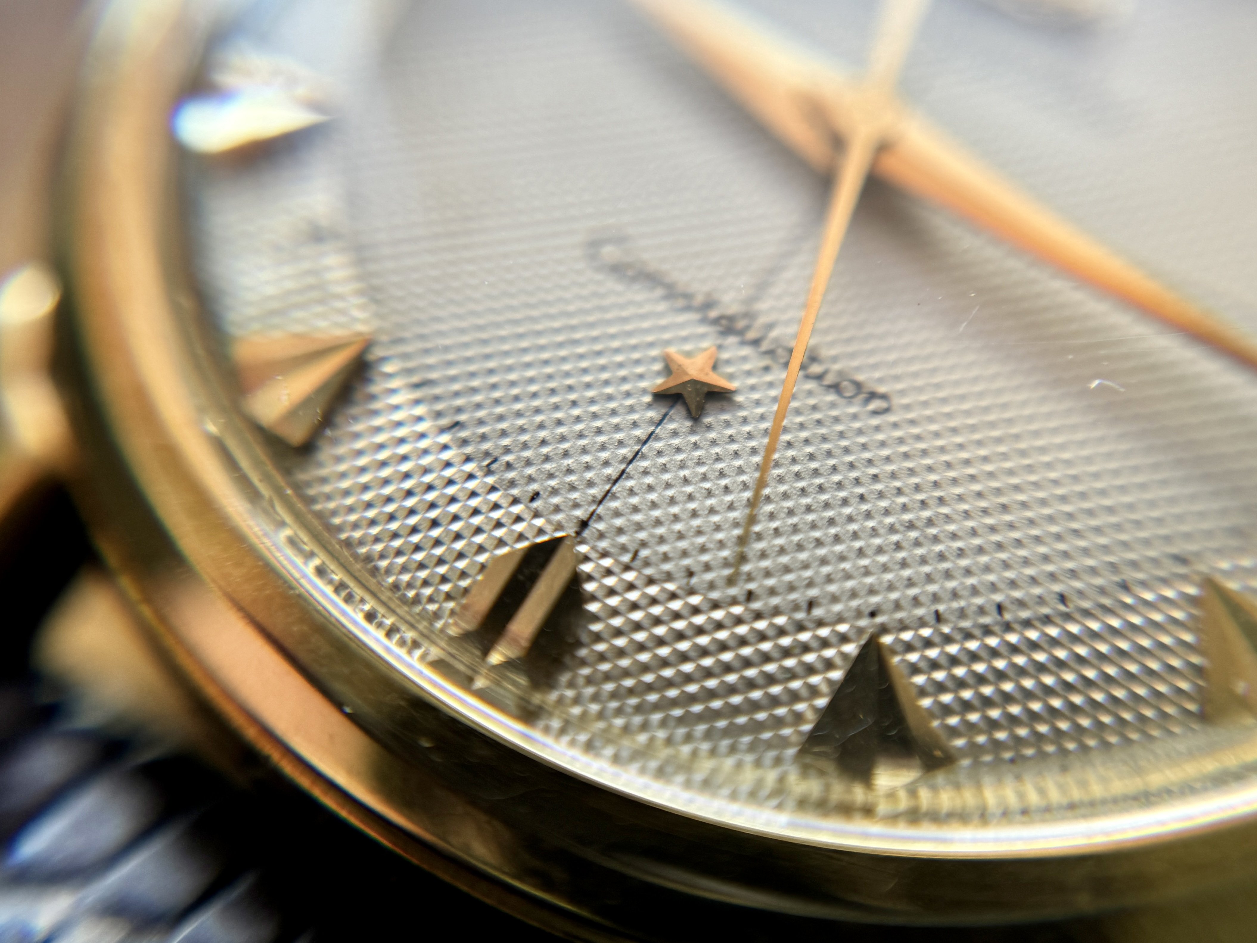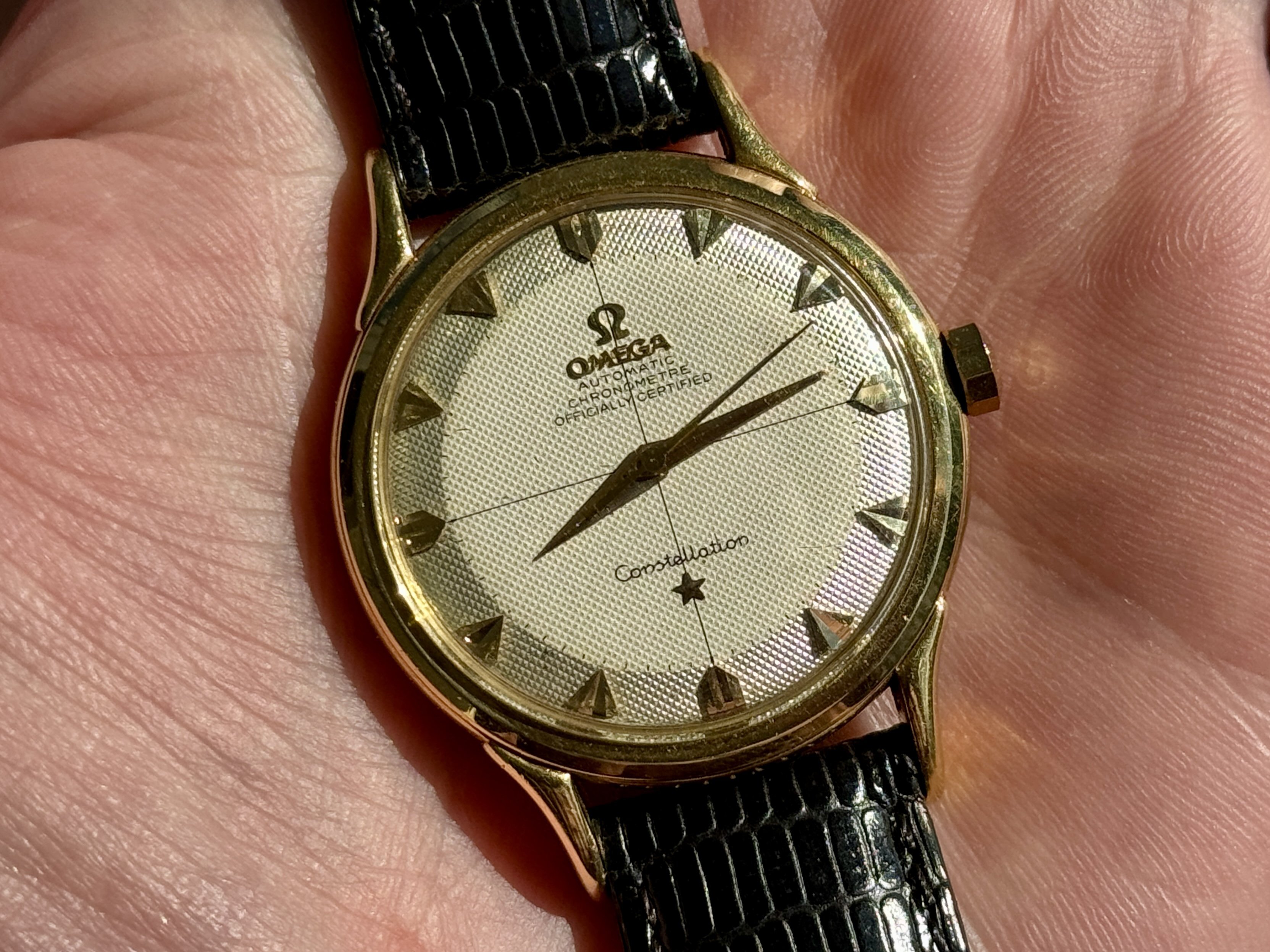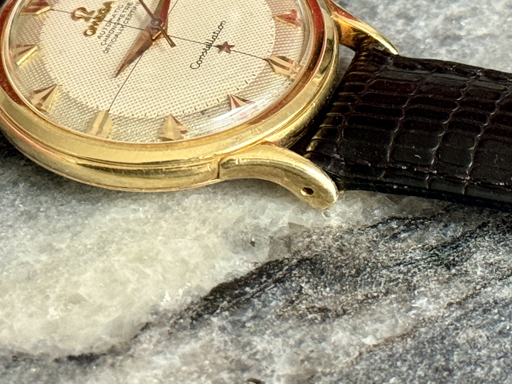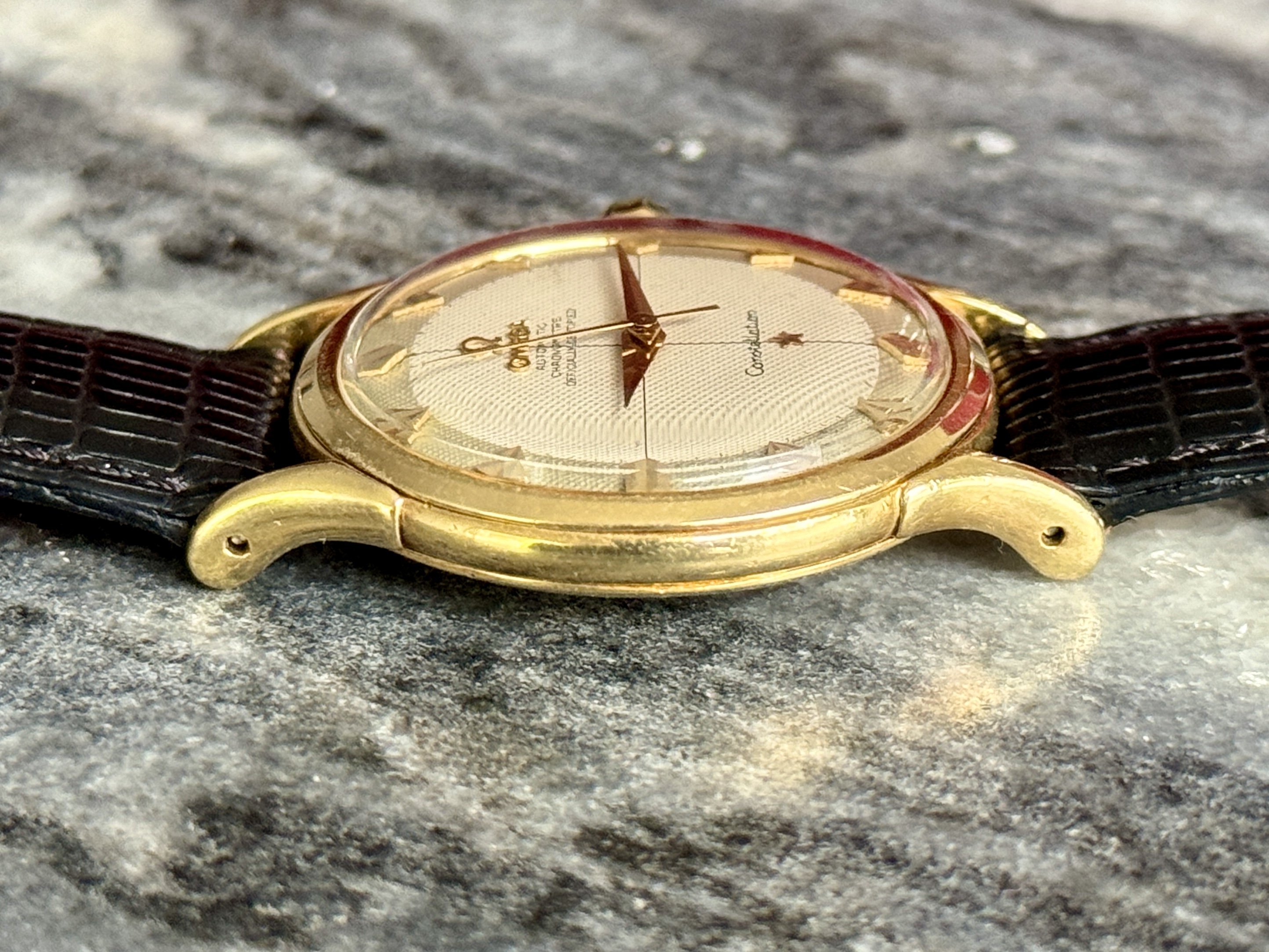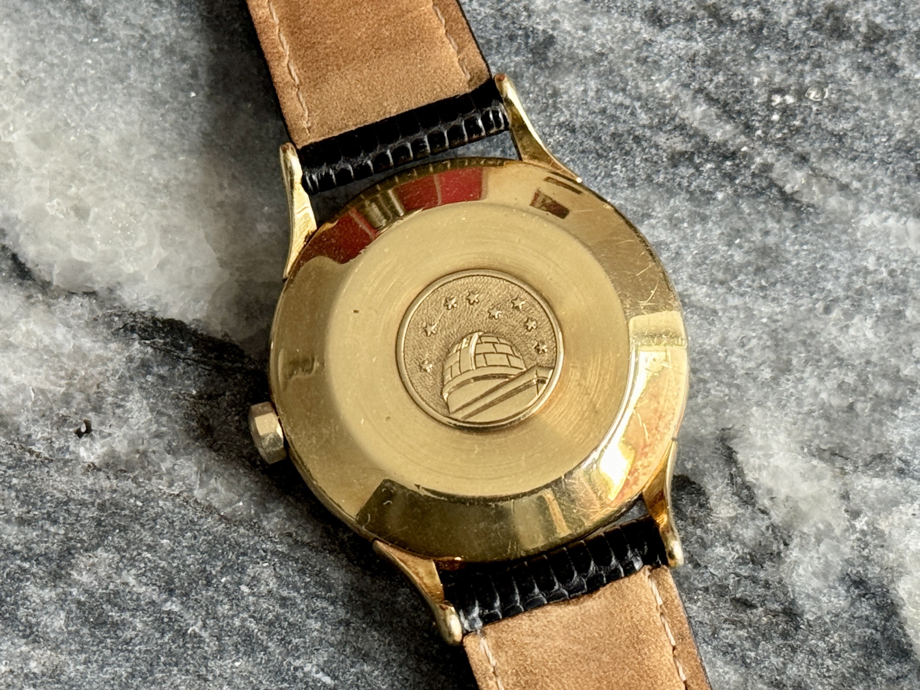 Case: Original 35mm solid gold case, 18k. It’s certainly been polished before, do note though that the lugs never had a sharp edge from the factory. Minute scratches and dings everywhere, as expected from a 70-year old watch. The medallion on the case back is sharp, I assume it’s been polished lightly around it though, where the back shows a very light dent. 2648s never had the “CONSTELLATION” and “WATERPROOF” writing seen on later case backs, so it’s not like those were polished off.