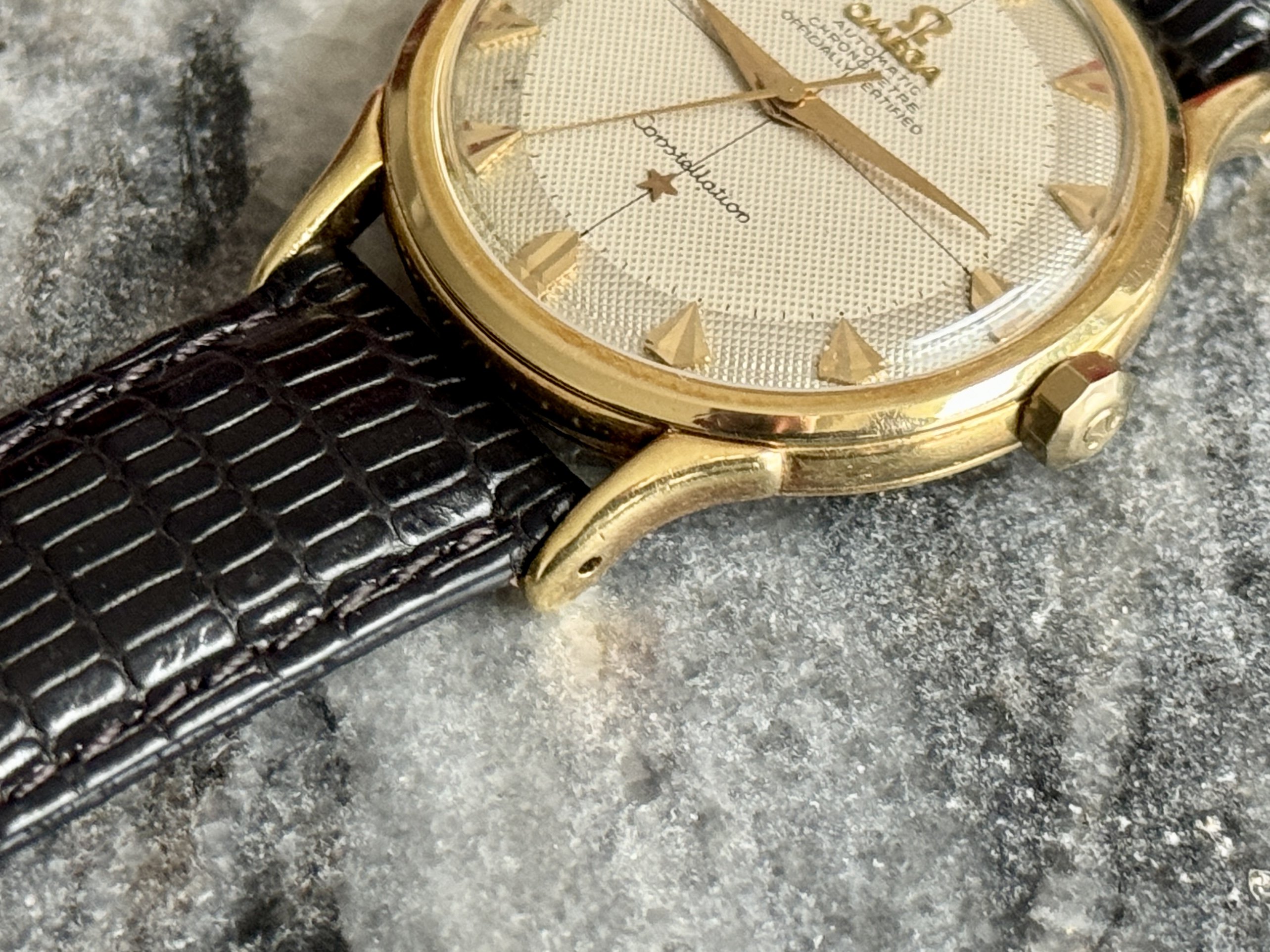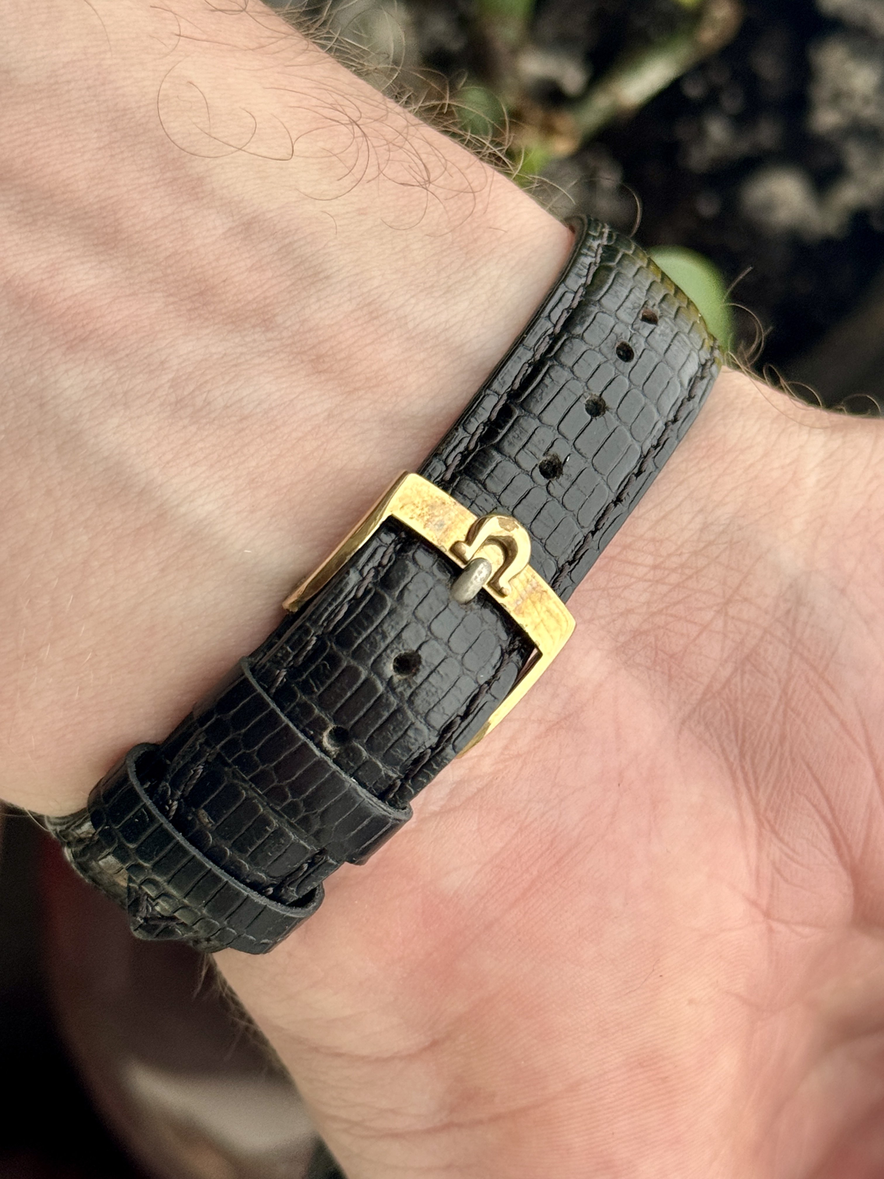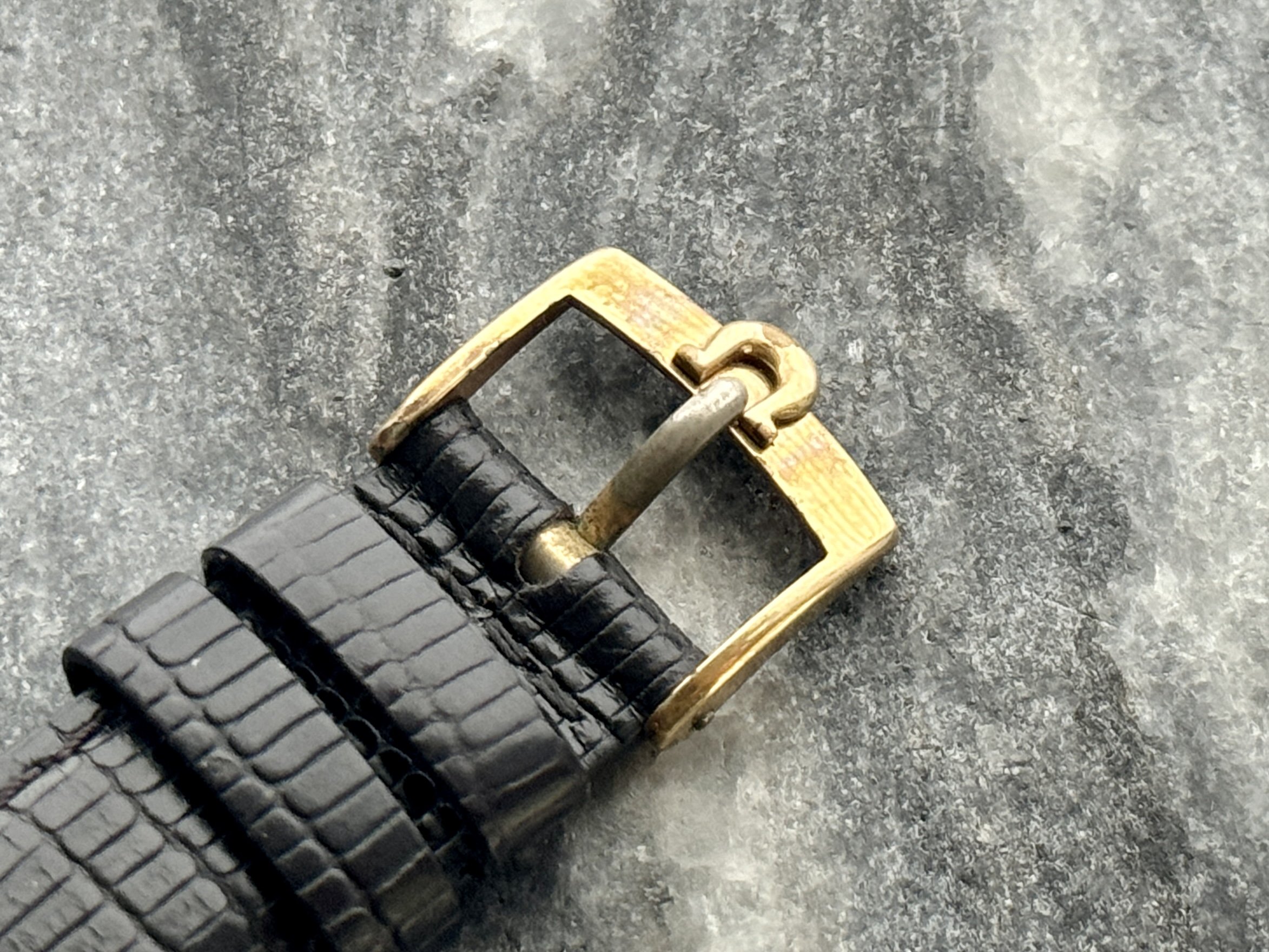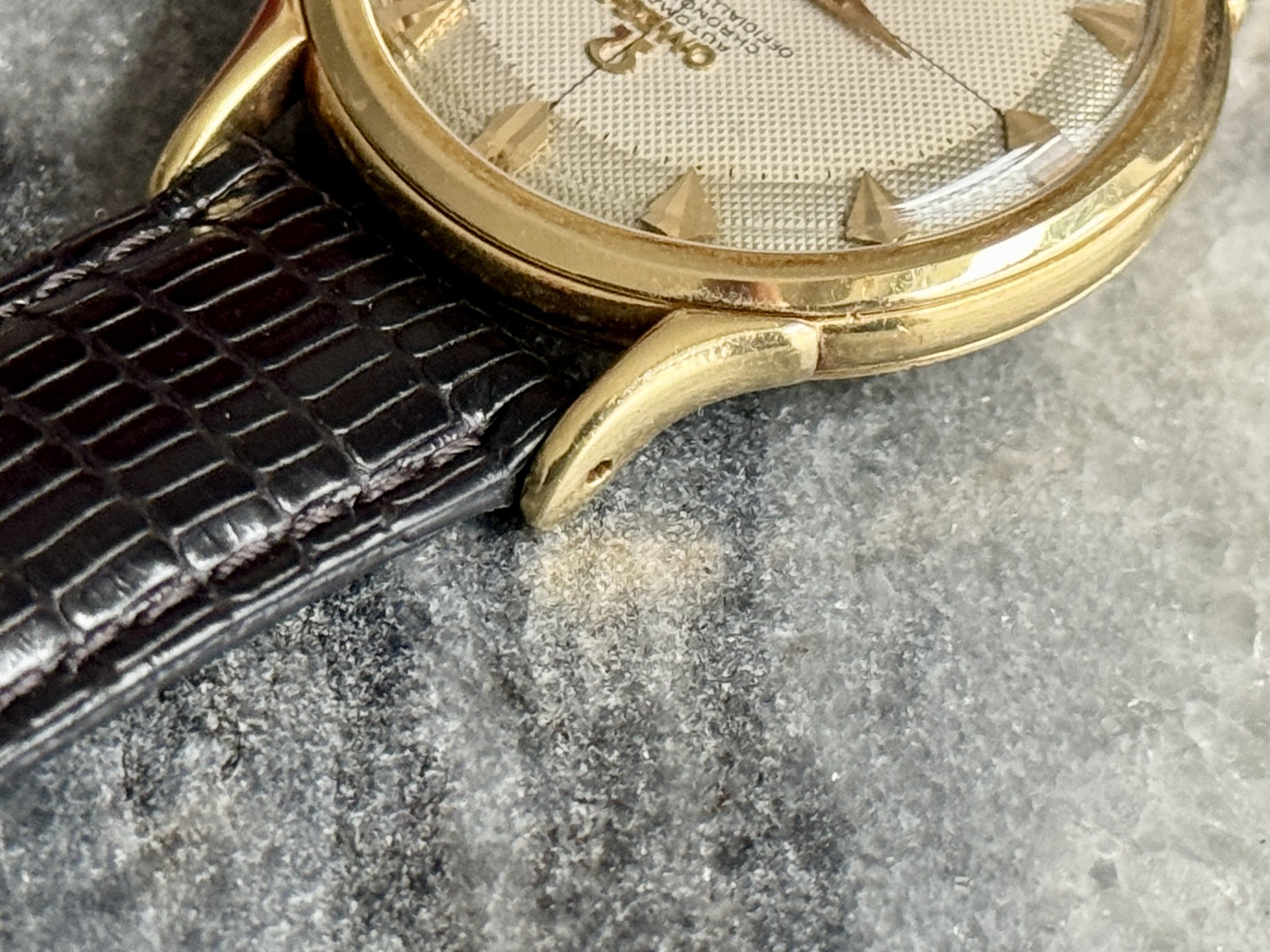 Strap & buckle: Black lizard strap, period-correct, gold-plated Omega buckle.