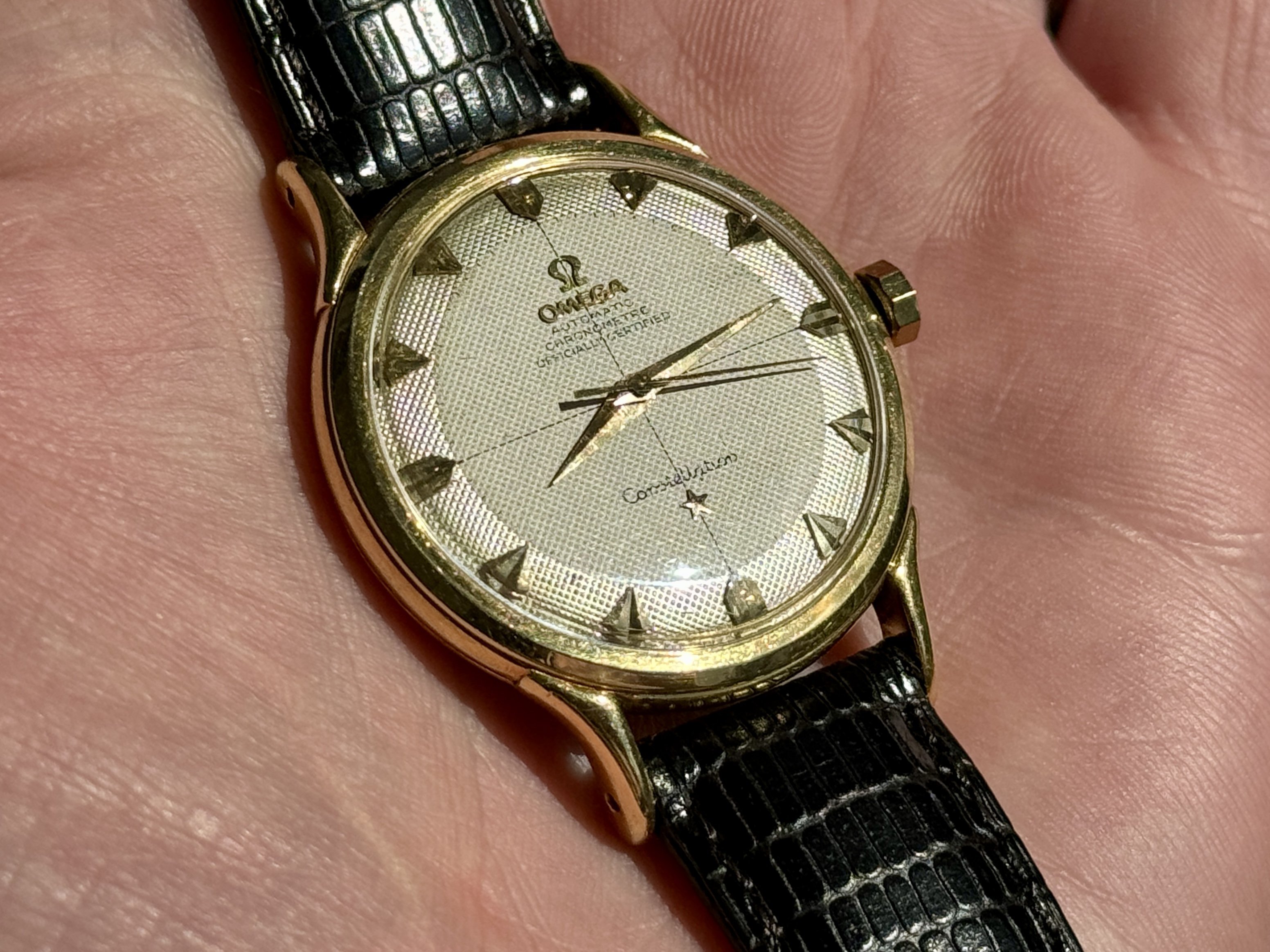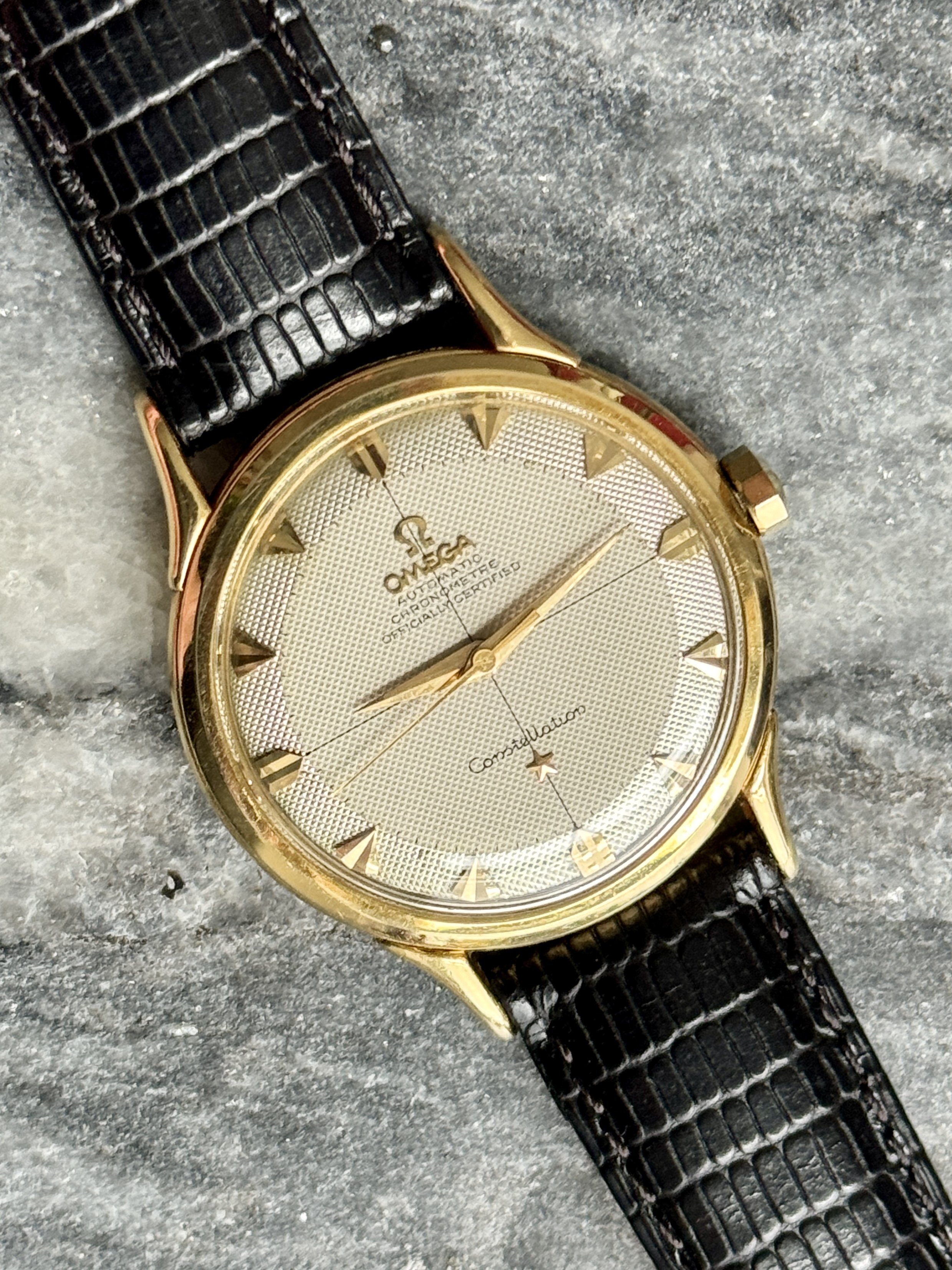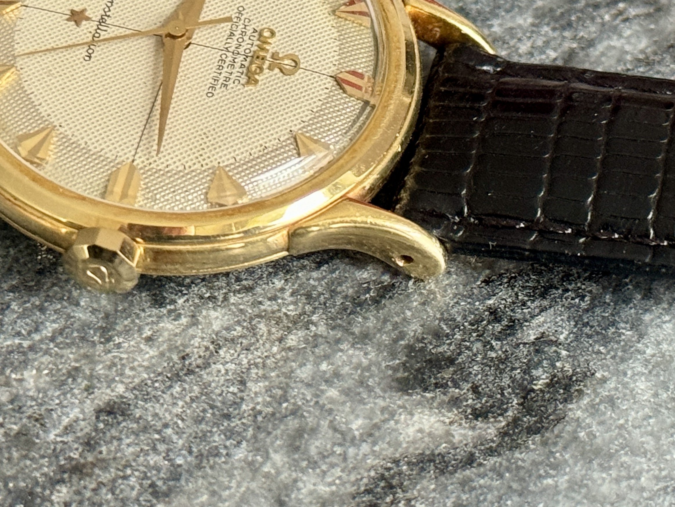 Strap & buckle: Black lizard strap, period-correct, gold-plated Omega buckle.